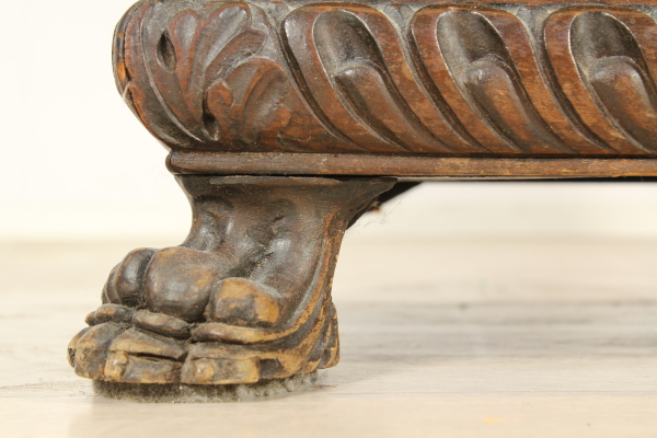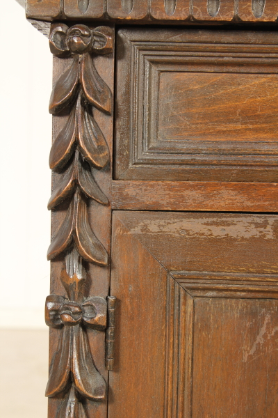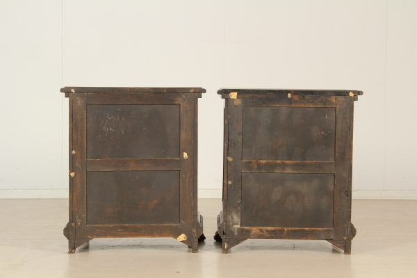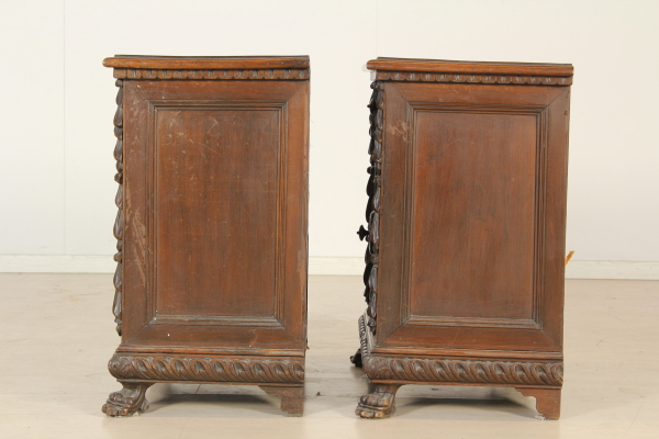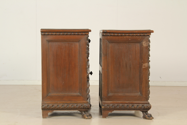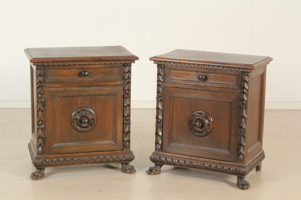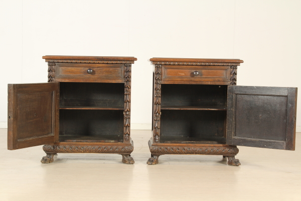 Coppia di comodini presentanti un'anta con formella intagliata e un cassetto. Montanti intagliati terminano con piedi ferini. Fascia e cornice sottopiano intagliate.