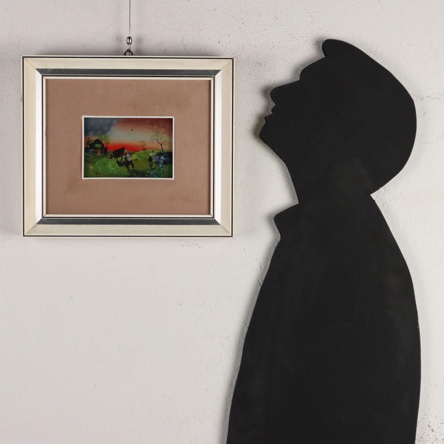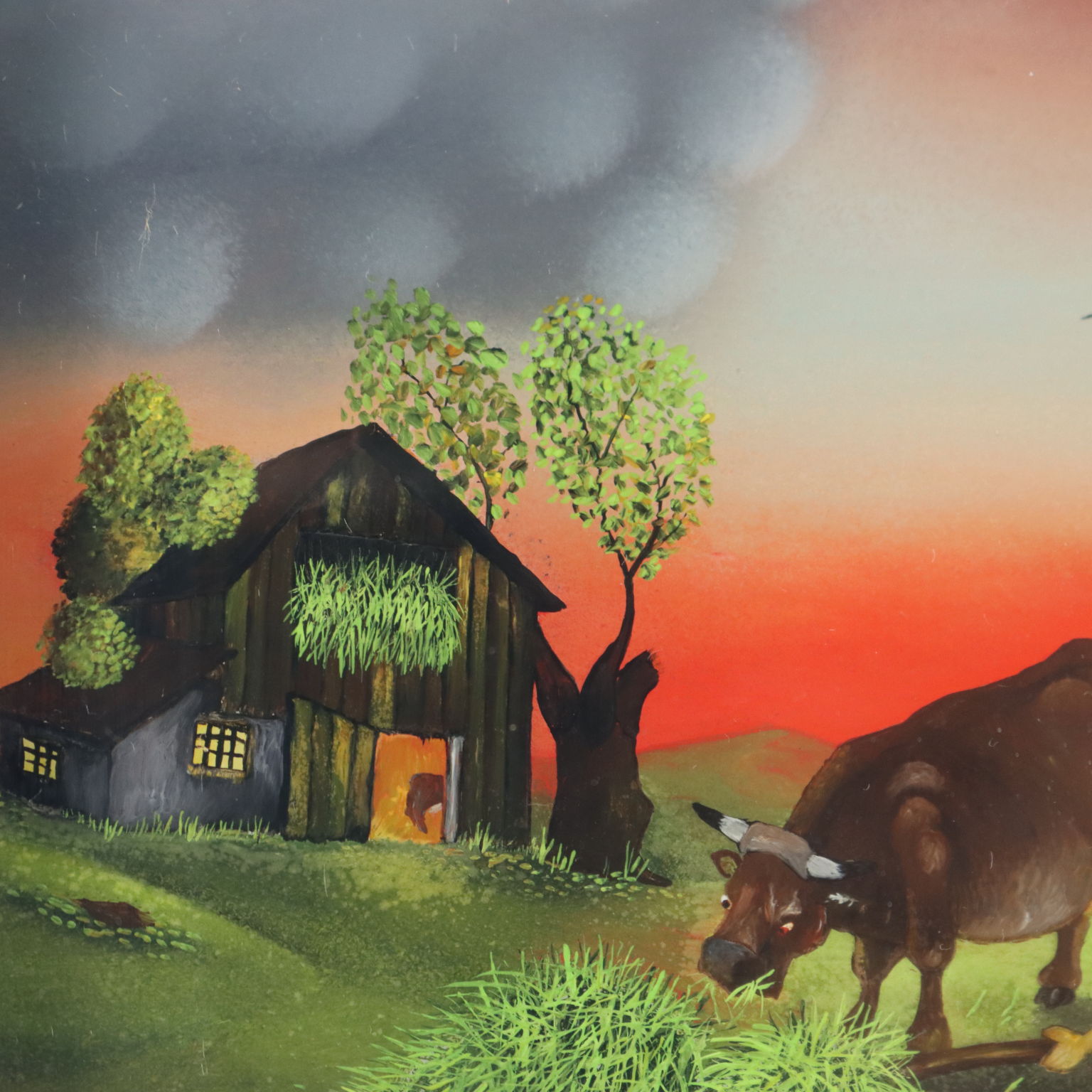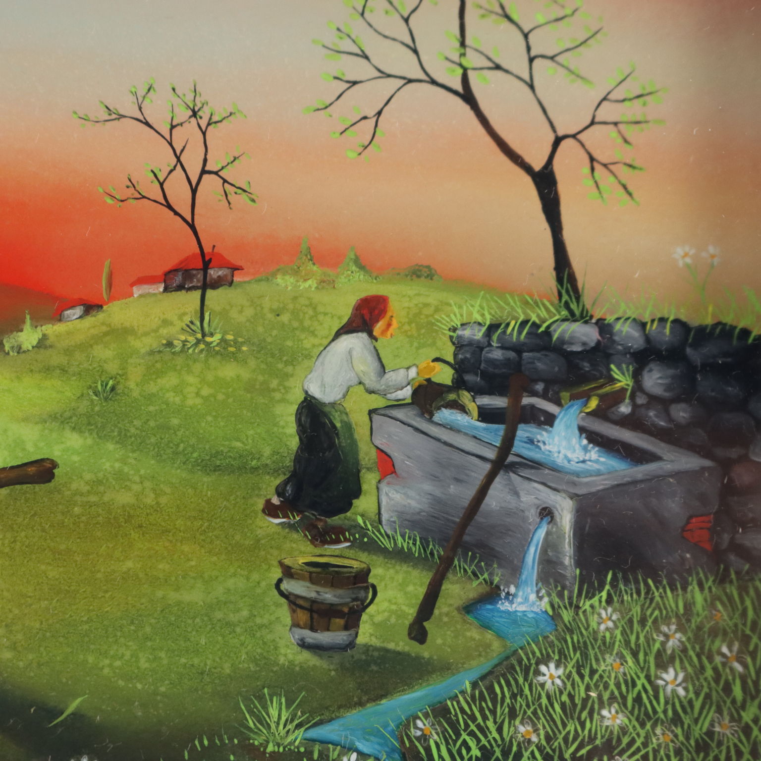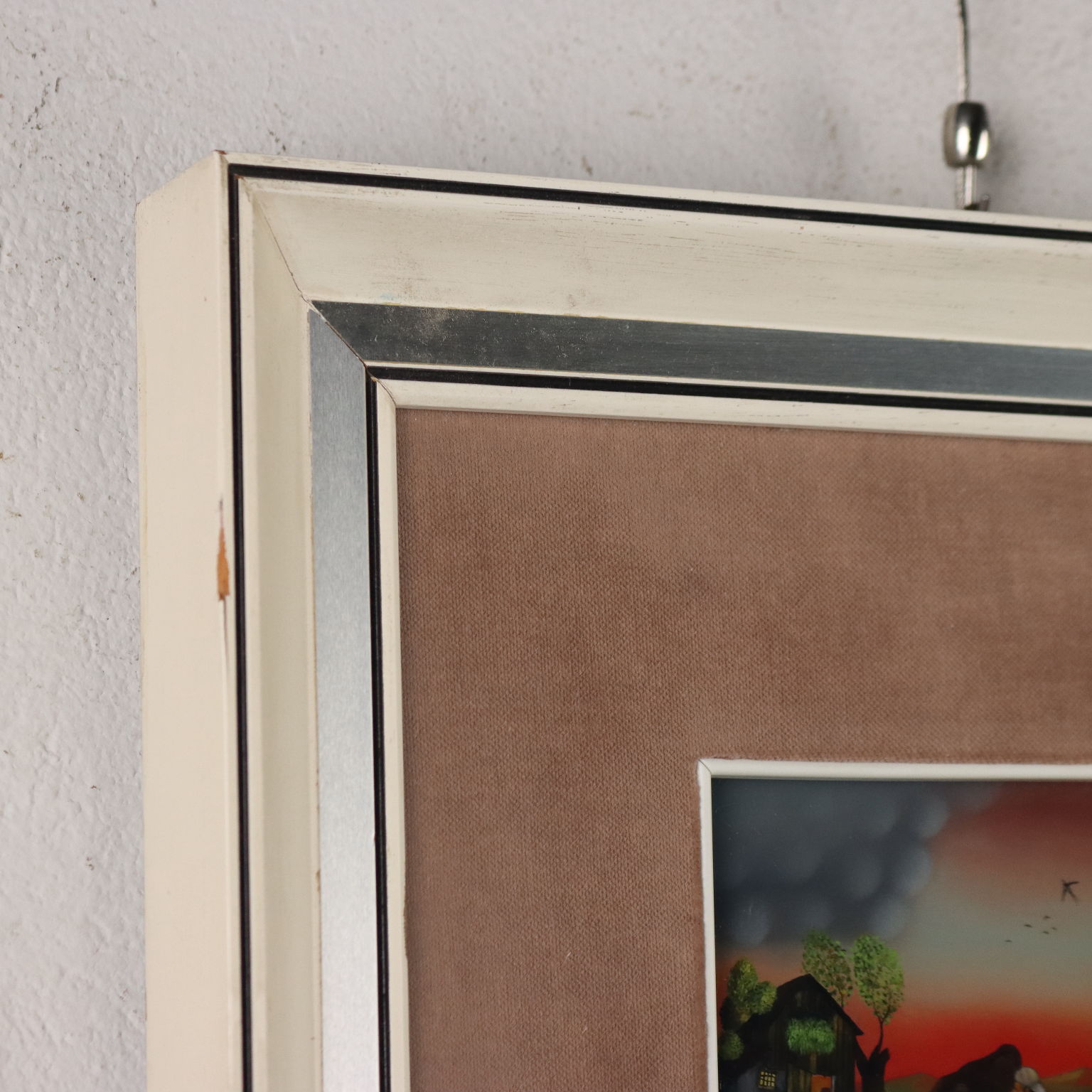 Olio su vetro. In basso a sinistra presenti la firma e la data, accompagnate dal simbolo dell'artista, la figurina stilizzata di un uomo in carrozzina. E' un'opera su vetro del pittore Mario Previ, che dall'età di diciotto anni vive e dipinge su una carrozzina, per una tetraplegia conseguente ad un tuffo nel suo Taro. Ha detto di sè :" Il mondo, il passare del tempo, da questo punto di vista (la sedia a rotelle) insegnano tante cose. Impari a svegliarti ogni mattina con uno scopo, anche se il tuo corpo è dolente, se ogni gesto genera sofferenza e dipendi dagli altri e mollare potrebbe essere una soluzione facile. E invece, l'arte, la pittura, insieme alla serenità del mio mondo, degli amici, mi danno un'energia incredibile. Mi hanno salvato, dandomi la forza di vivere". Nel 1974, tre anni dopo l'incidente, ispirato da una trasmissione televisiva sui pittori naif jugoslavi, in particolare dalle opere su vetro di Mijo Kovacic, Previ inizia a dipingere e ad imparare l'arte della pittura su vetro da autodidatta, fino ad arrivare a farsi conoscere ed apprezzare per i suoi dipinti. Nei suoi naif Mario Previ racconta una realtà ormai quasi scomparsa, storie reali se pur in tono fiabesco, fa rivivere tradizioni perdute, spaccati di vita appartenuta ad altre generazioni, quelle della civiltà contadina (da cui peraltro lui proviene), ma ciò che più emerge dalle sue visioni sono le “forë”, quelle che si potevano ascoltare un tempo nei “firossi”, le serate tradizionali delle frazioni del parmense dedicate al ritrovarsi per raccontare aneddoti, racconti e curiosità storiche, spesso di fronte al fuoco del caminetto, quando fuori c'era freddo e nevicava. L'opera è presentata in cornice.