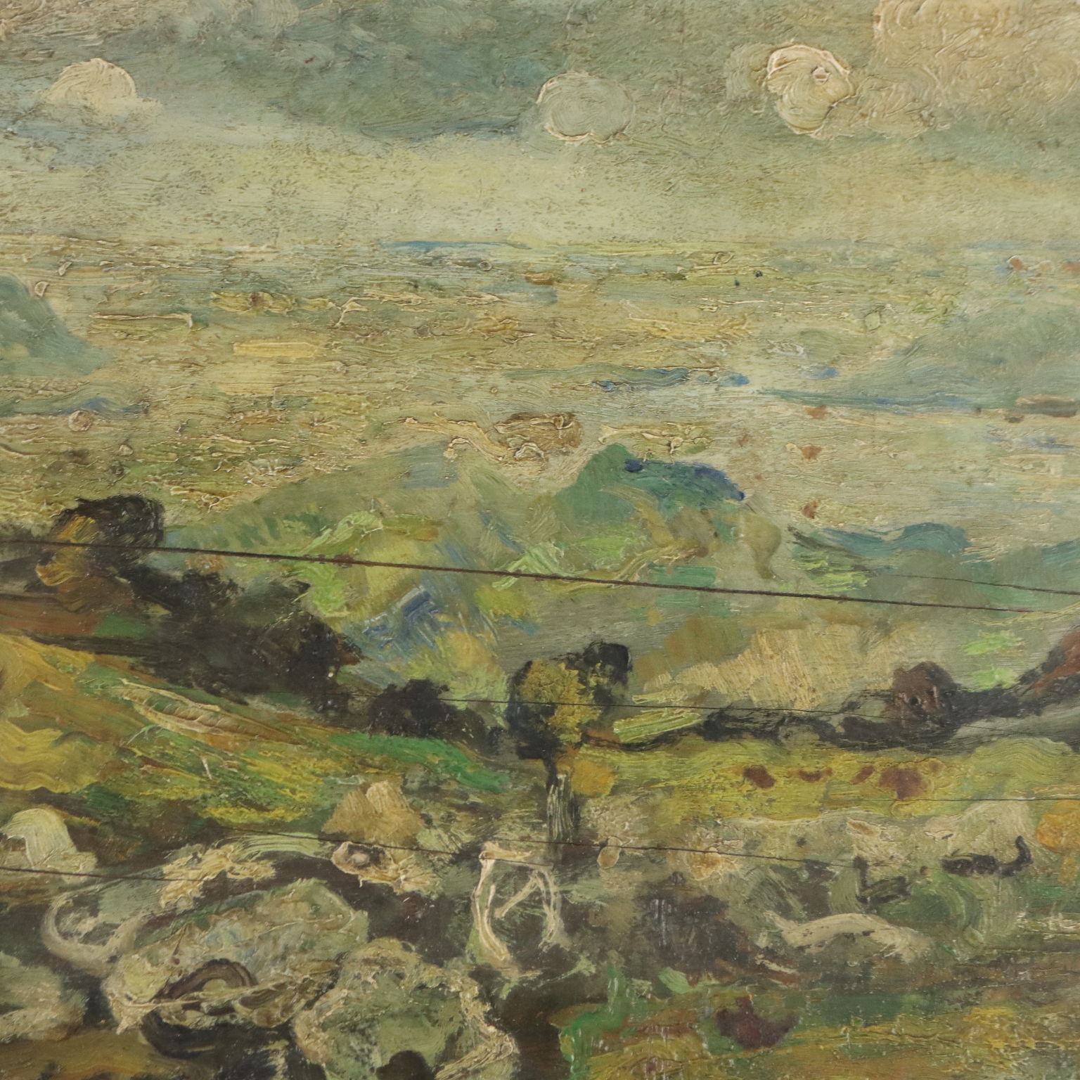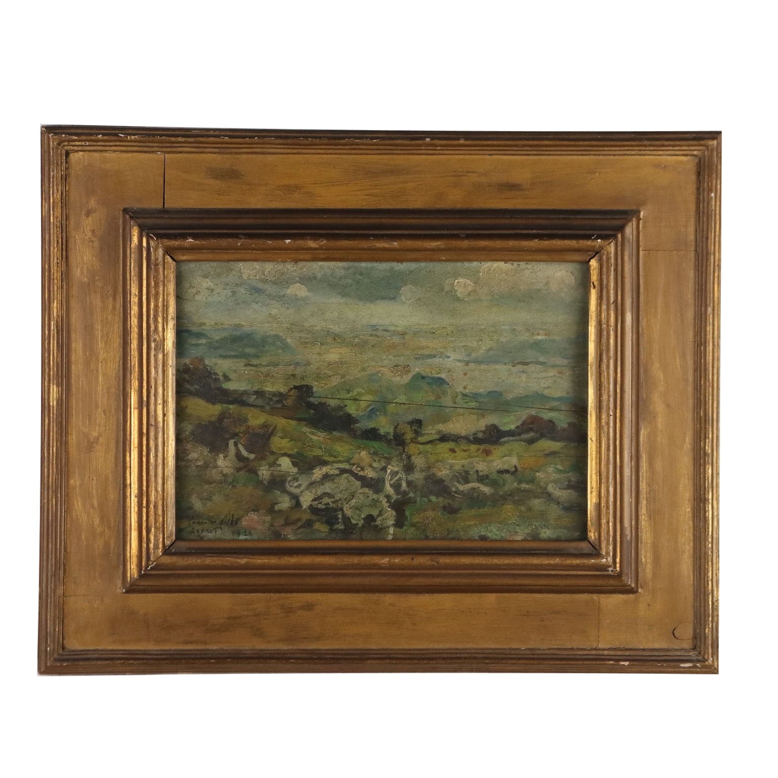 Olio su tavola. Firmato e datato in basso a sinistra. Al retro ulteriore firma e data. Mentre la produzione iniziale di Ermenegildo Agazzi si colloca sulla scia del tardo verismo lombardo, agli inizi del '900 l'artista, già impostosi alla critica e al pubblico per la sua spiccata e definitiva personalità di grande colorista, connota le sue opere con pennellate ampie, spesso sovrapposte e fortemente materiche, come in questo paesaggio montano. Parchettato al retro, il dipinto è presentato in cornice coeva ridorata.