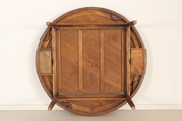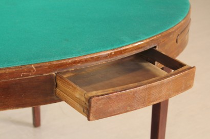 Tavolo; legno di mogano, piano ricoperto in panno, gambe richiudibili. Buone condizioni, presenta piccoli segni di usura.