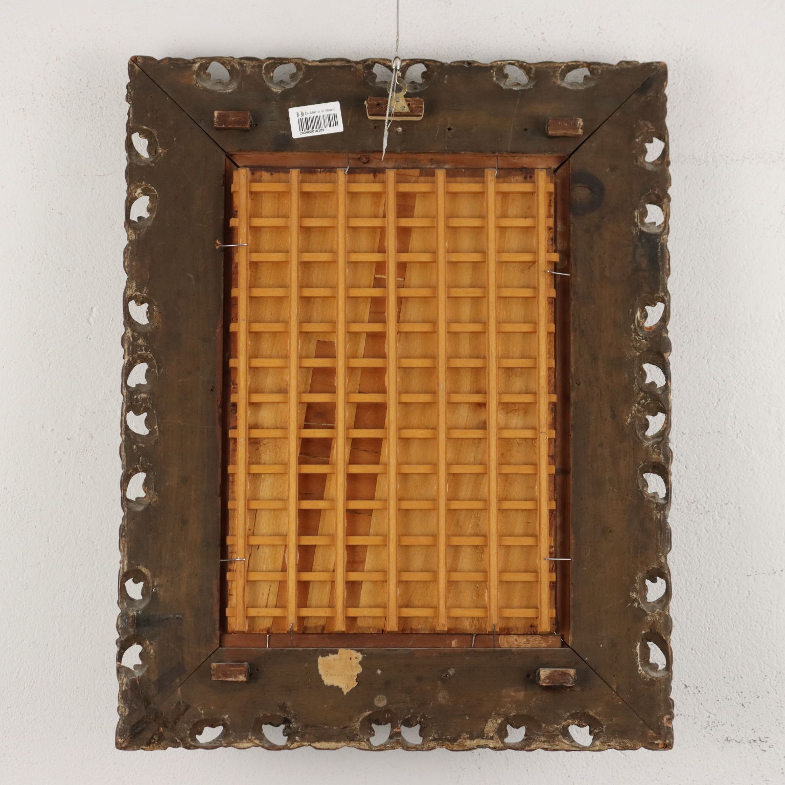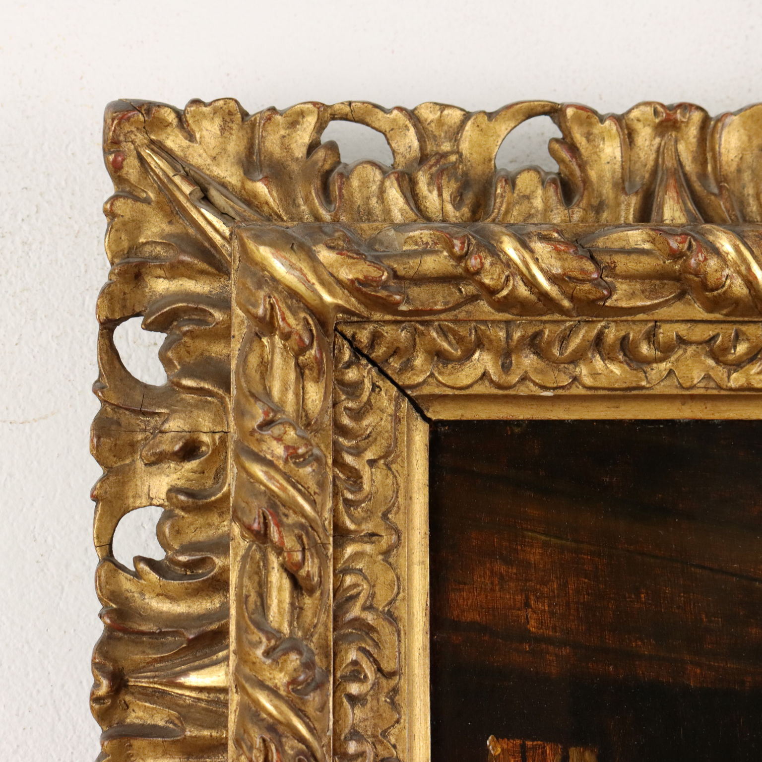 Olio su tavola. Firmato e datato 30-11-1889 in basso a sinistra. Il Delleani, che inizialmente dipinse prevalentemente soggetti storici, si avvicinò progressivamente alla pittura paesaggistica "en plein air", soprattutto dei luoghi delle sue origini, le valli piemontesi, caratterizzando i suoi scorci con vibrazioni cromatiche e calde luminosità. Negli ultimi decenni della sua vita peraltro, egli si lasciò coinvolgere anche dal filone orientalista, per ritornare però poi ai suoi scorci paesaggistici, realizzando soprattutto tavolette ricche di caldi colori e suggestive atmosfere. Più rara ma altrettanto suggestiva la sua produzione di interni, come questo di una stalla, dove le figure animate, le pecore, compaiono come macchie quasi indistinte di colore all'interno di un ambiente giocato tutto sugli effetti luministici di un'unica gamma cromatica. Restaurato e parchettato, il dipinto è presentato in cornice dorata di inizio '900, con tracce di restauro e piccole mancanze.