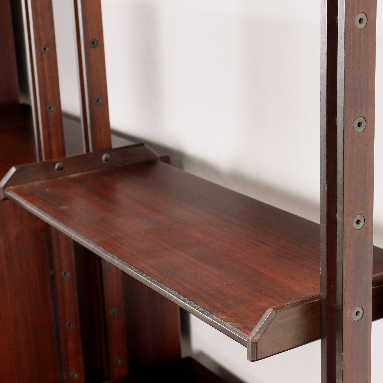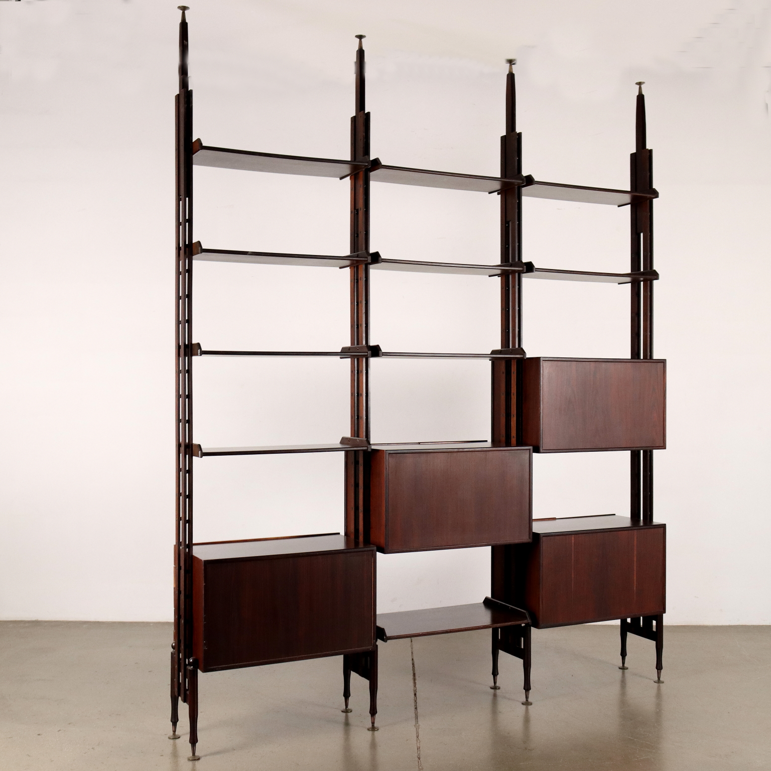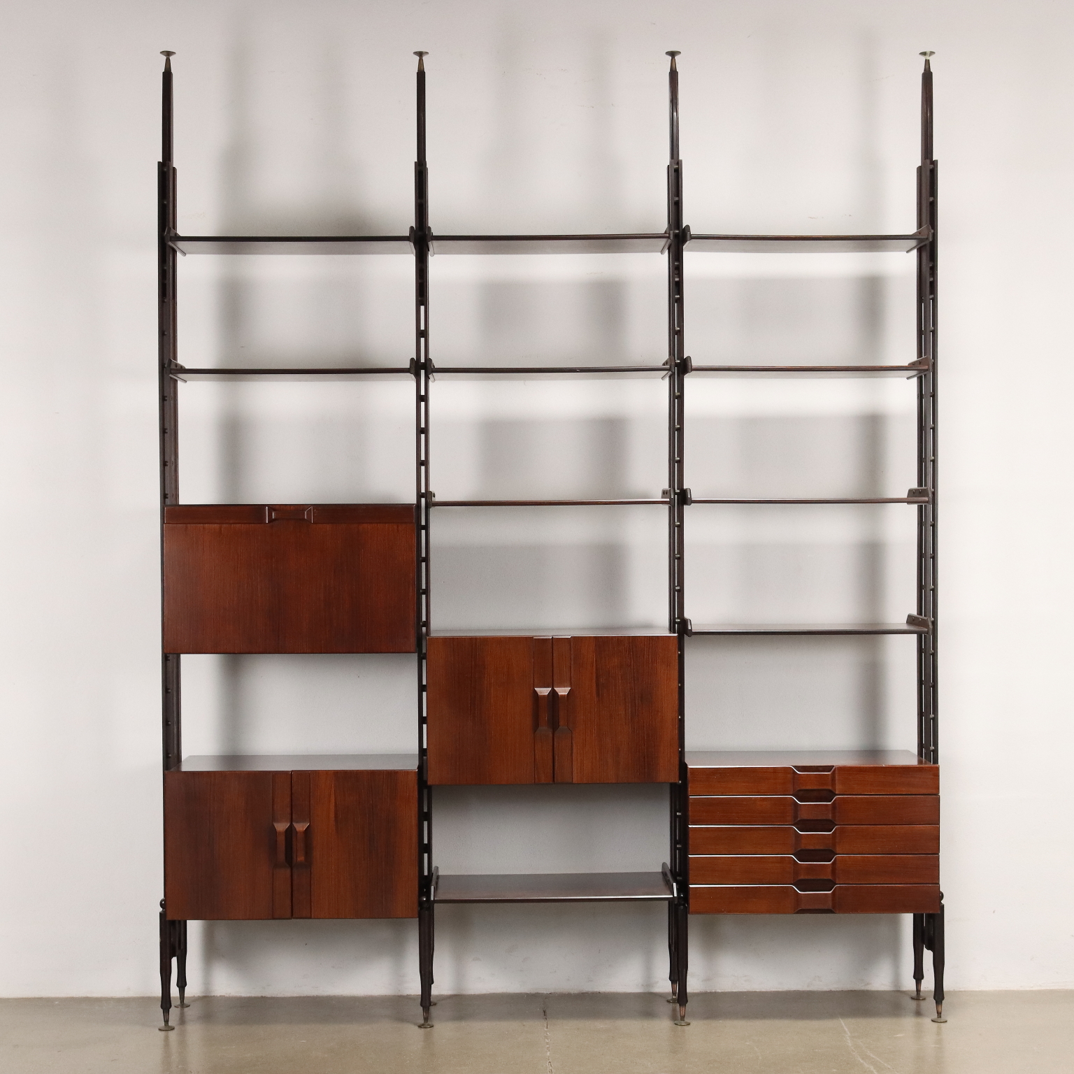 Elegante libreria vintage a tre campate fruibile da centro; realizzata in legno impiallacciato legno esotico, presenta quattro montanti che le permettono di non essere fissata a muro, ripiani a posizione regolabile, vani contenitori con ante battente, a ribalta e cassetti. Restaurata.
