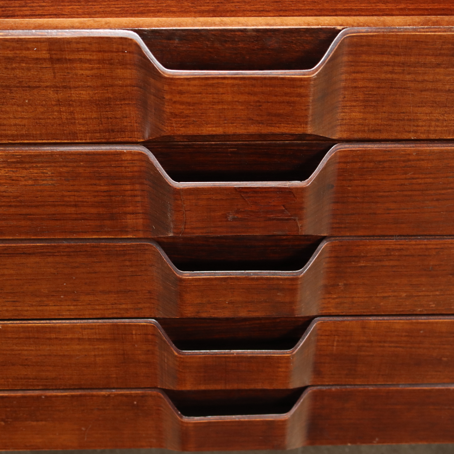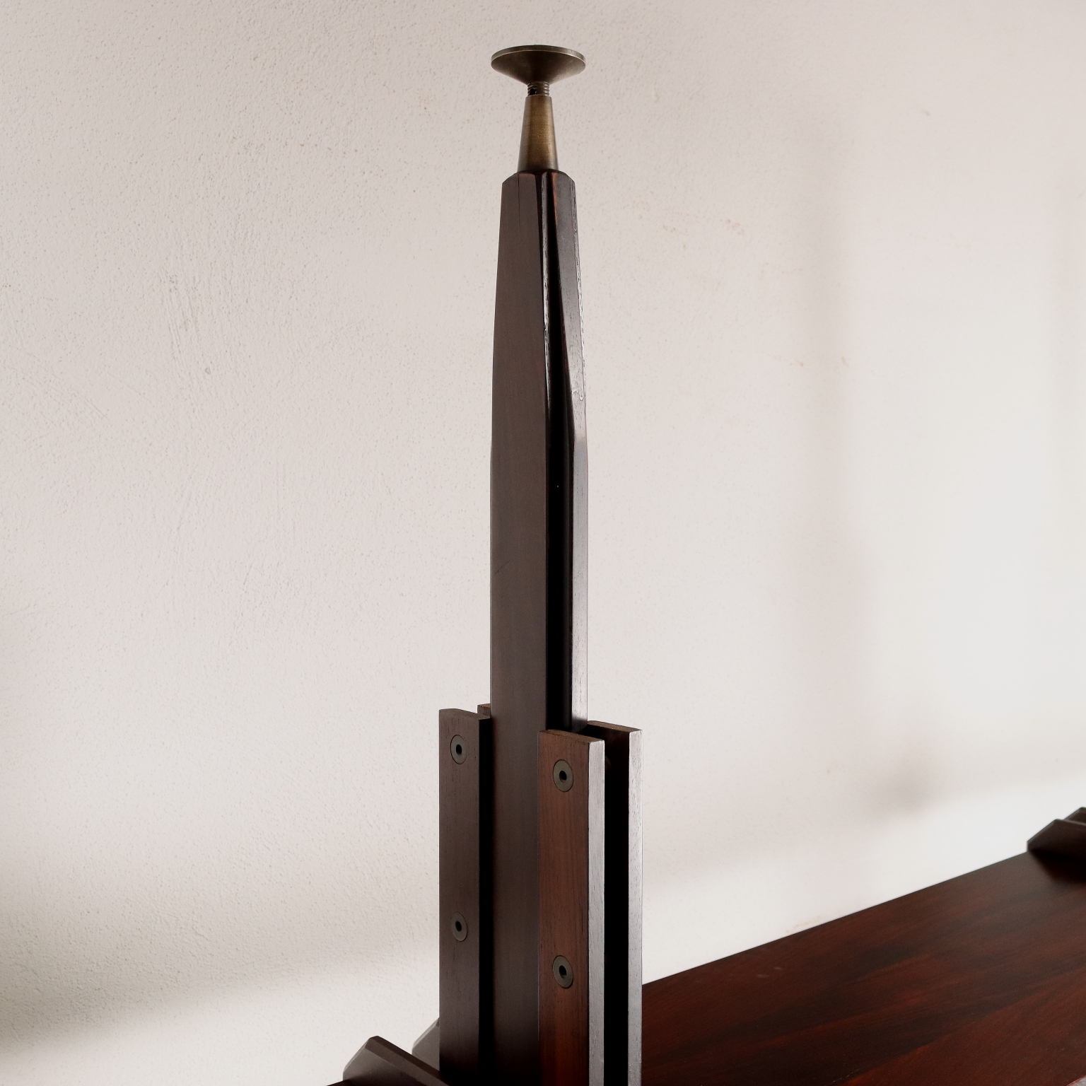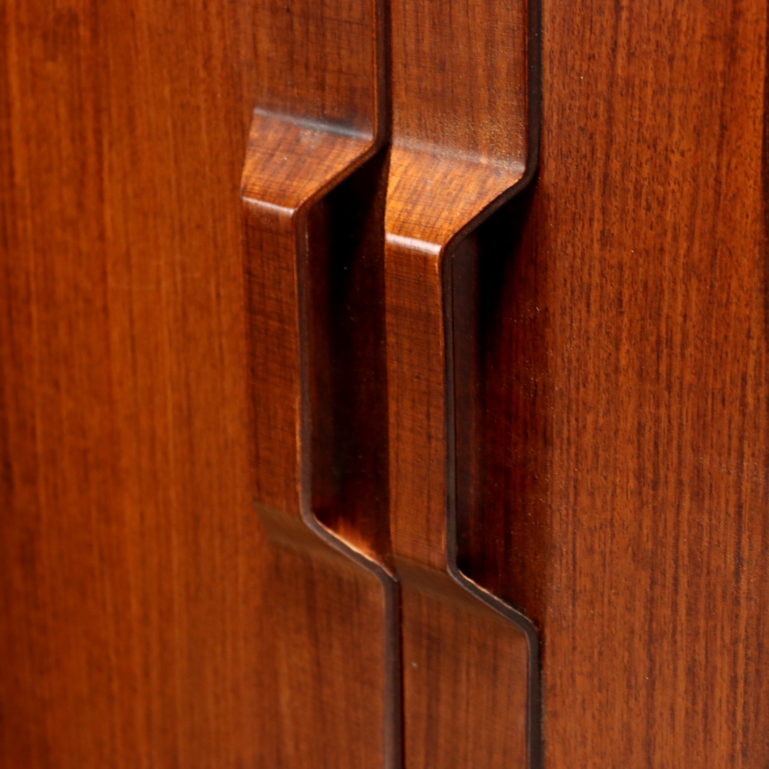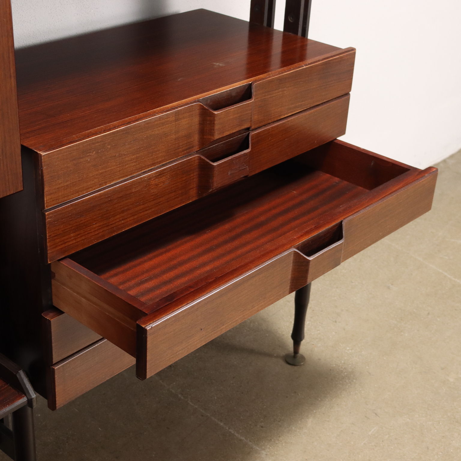 Elegante libreria vintage a tre campate fruibile da centro; realizzata in legno impiallacciato legno esotico, presenta quattro montanti che le permettono di non essere fissata a muro, ripiani a posizione regolabile, vani contenitori con ante battente, a ribalta e cassetti. Restaurata.