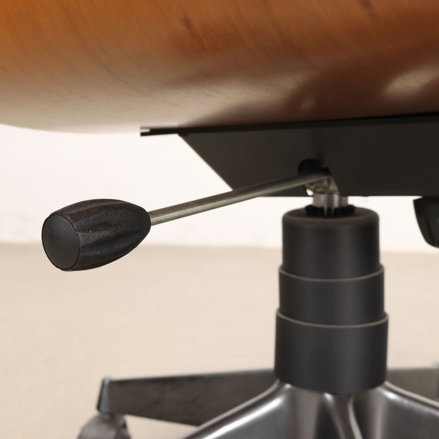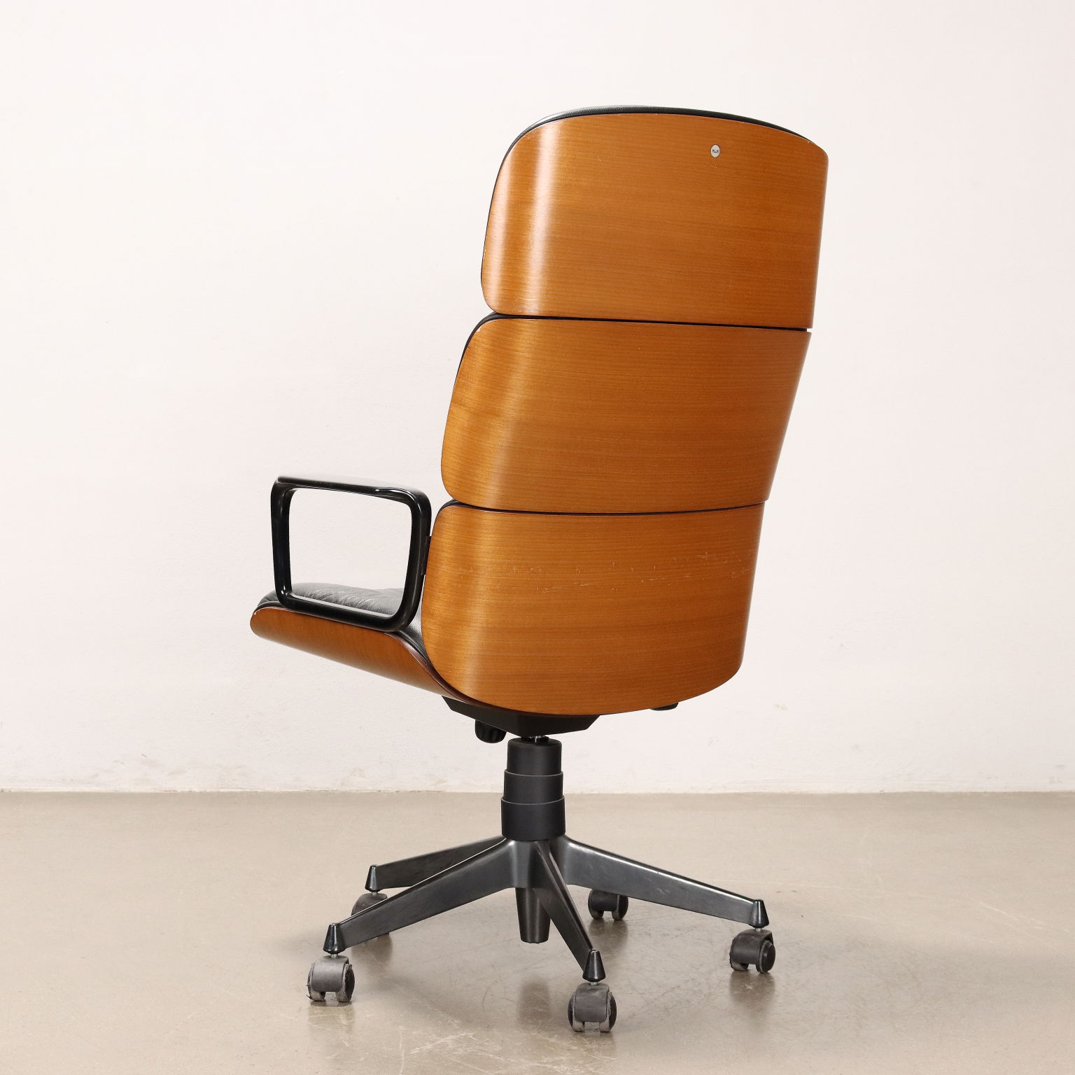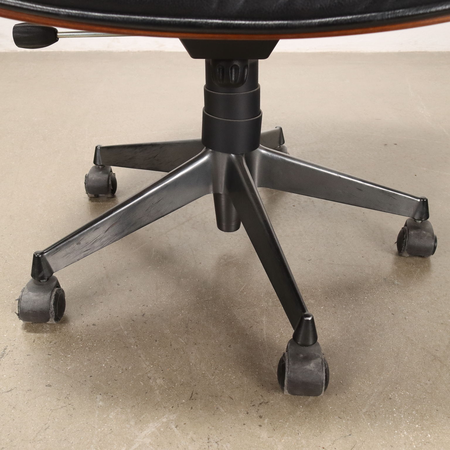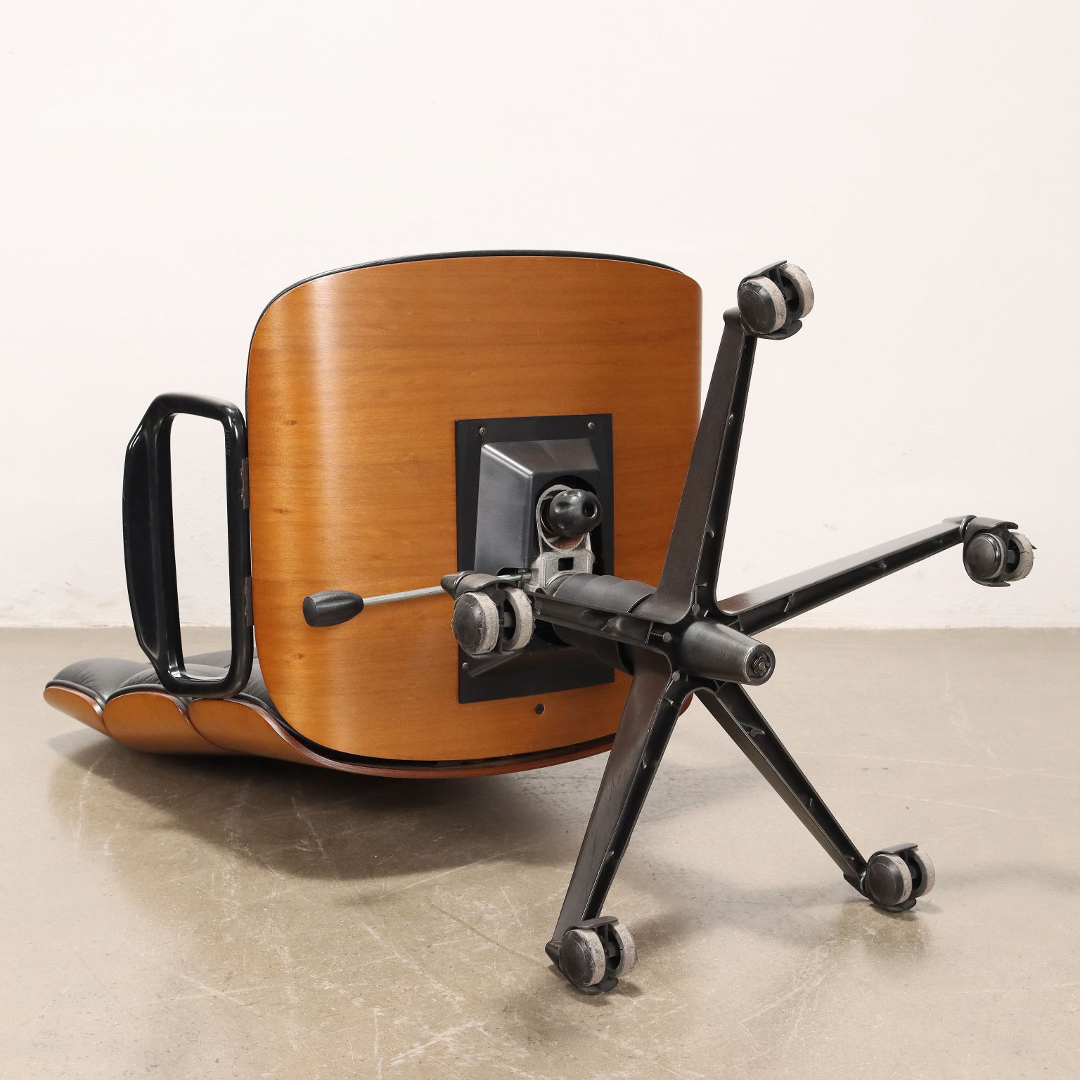 Sedia girevole da ufficio a schienale alto con scocca in legno curvato, seduta e schienale con imbottitura in espanso e rivestimento in pelle, struttura e razze in metallo. Presente il marchio della manifattura. Buone Condizioni.