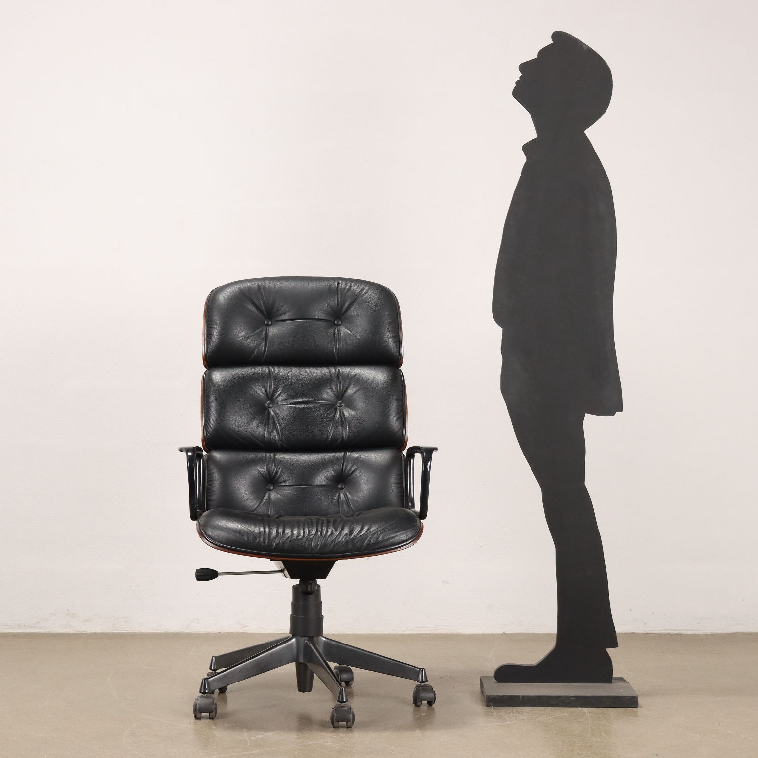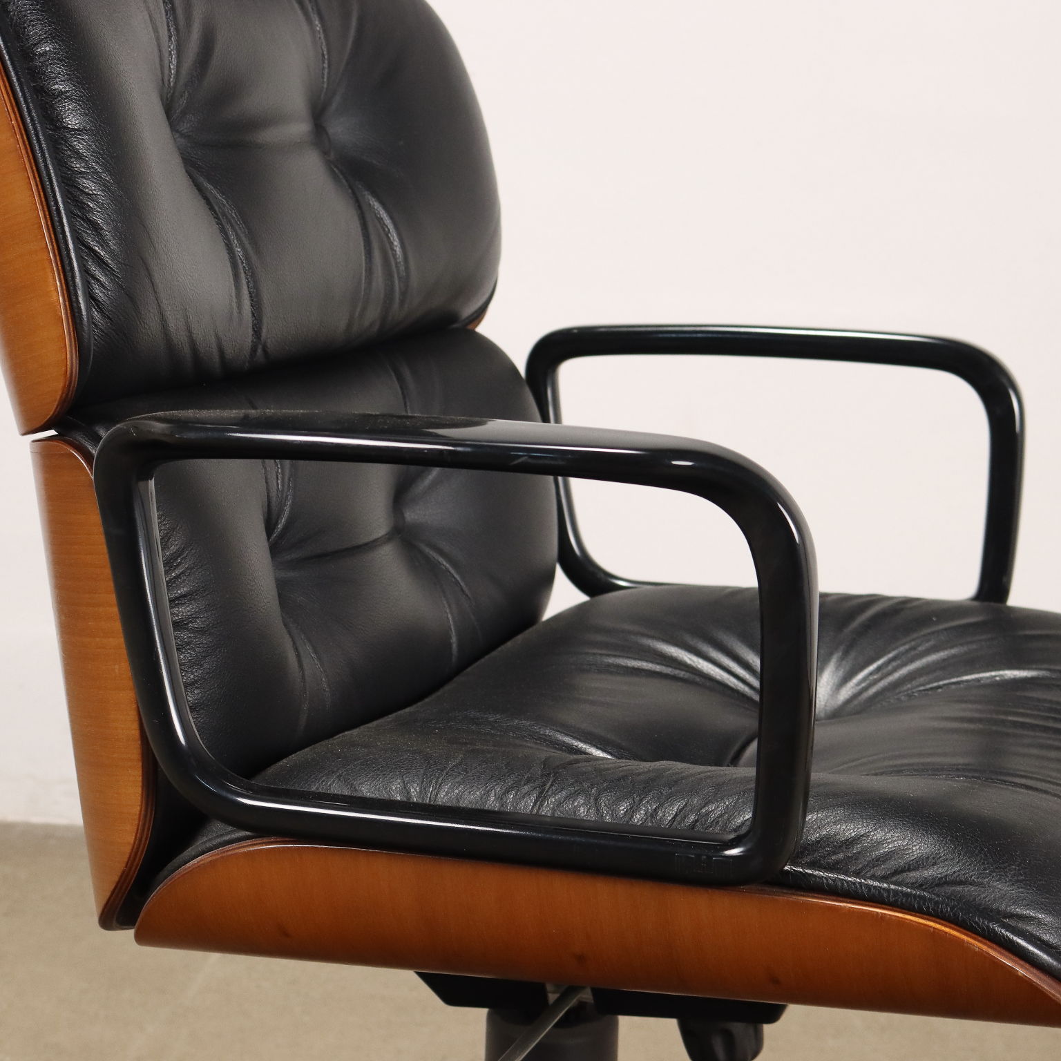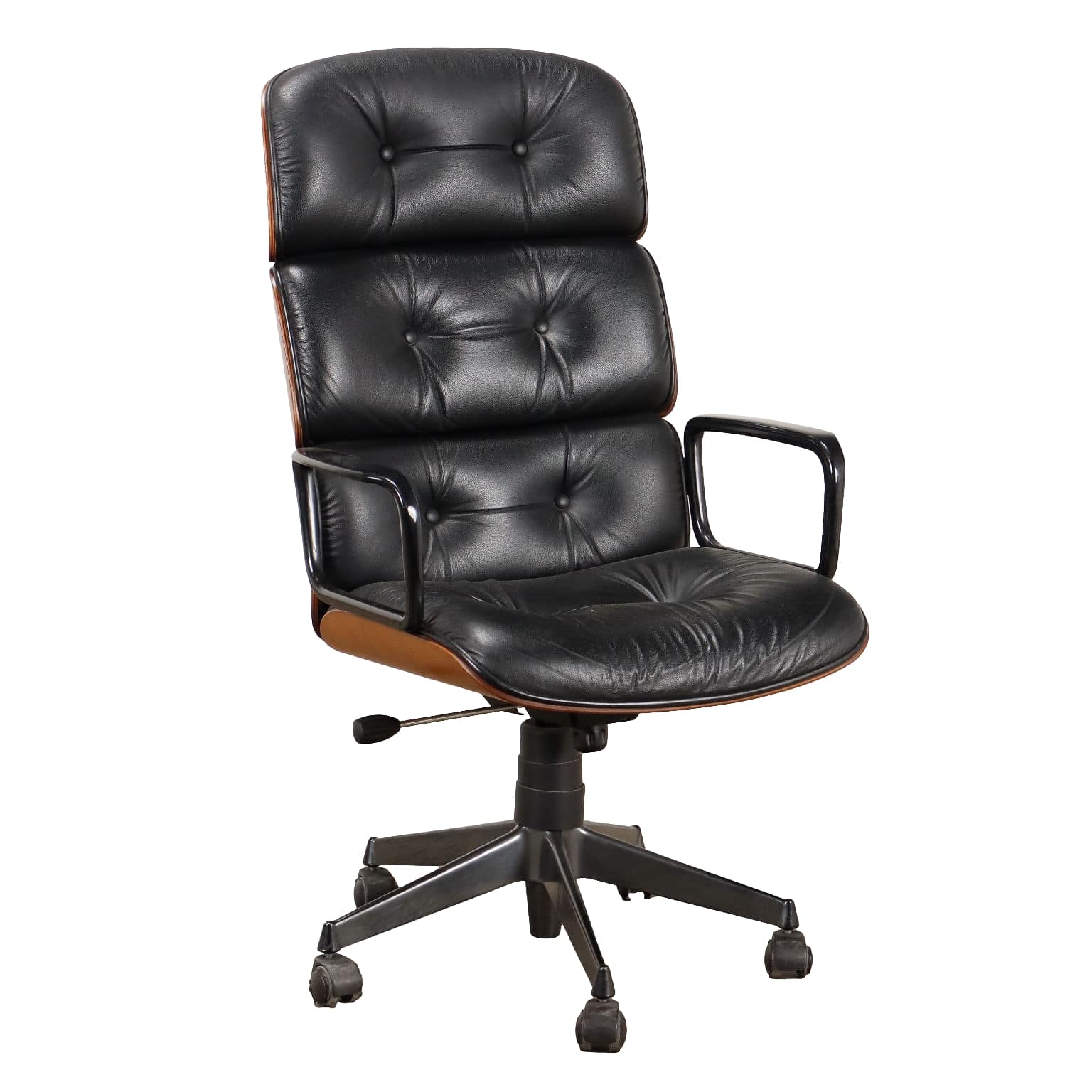 Sedia girevole da ufficio a schienale alto con scocca in legno curvato, seduta e schienale con imbottitura in espanso e rivestimento in pelle, struttura e razze in metallo. Presente il marchio della manifattura. Buone Condizioni.