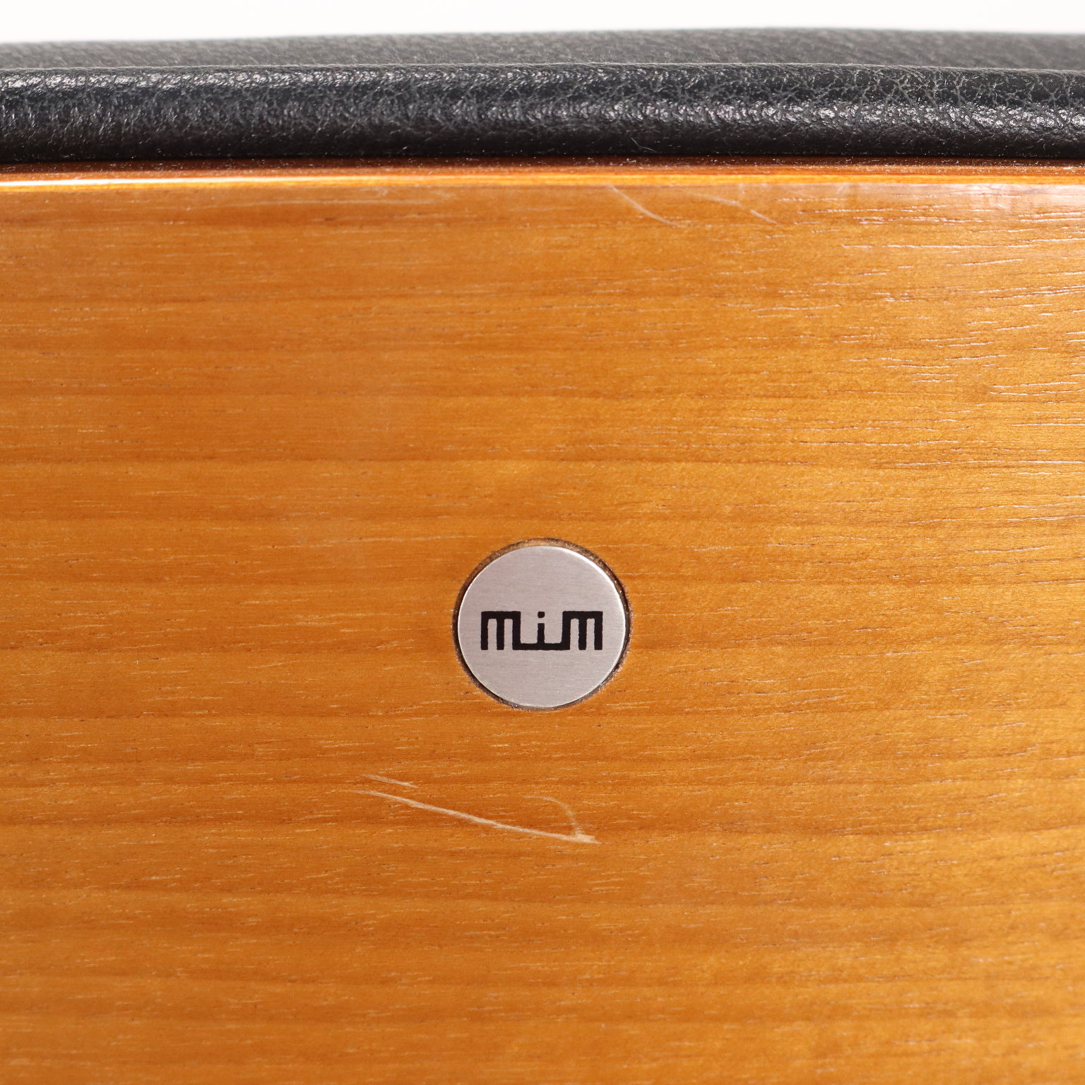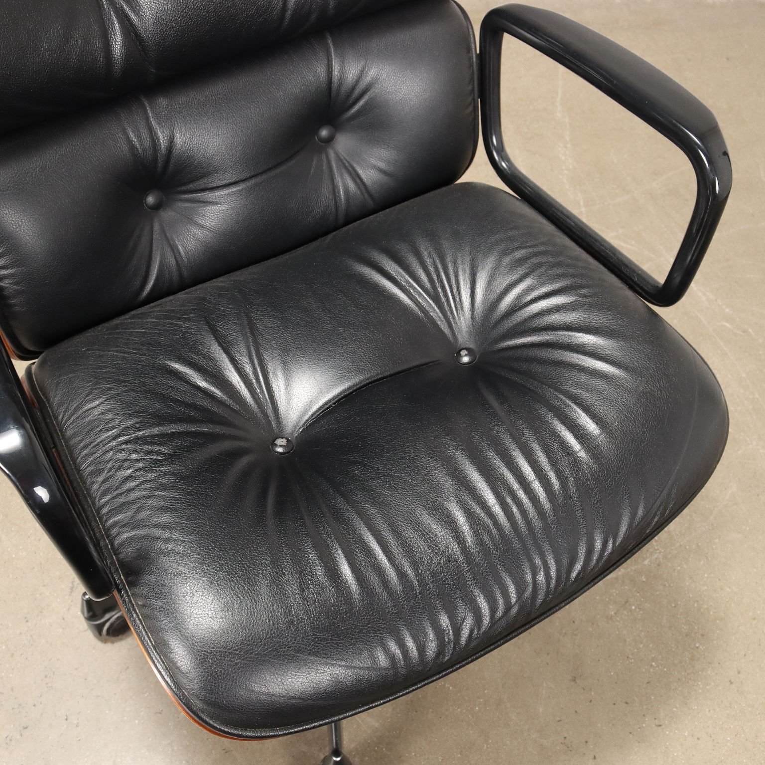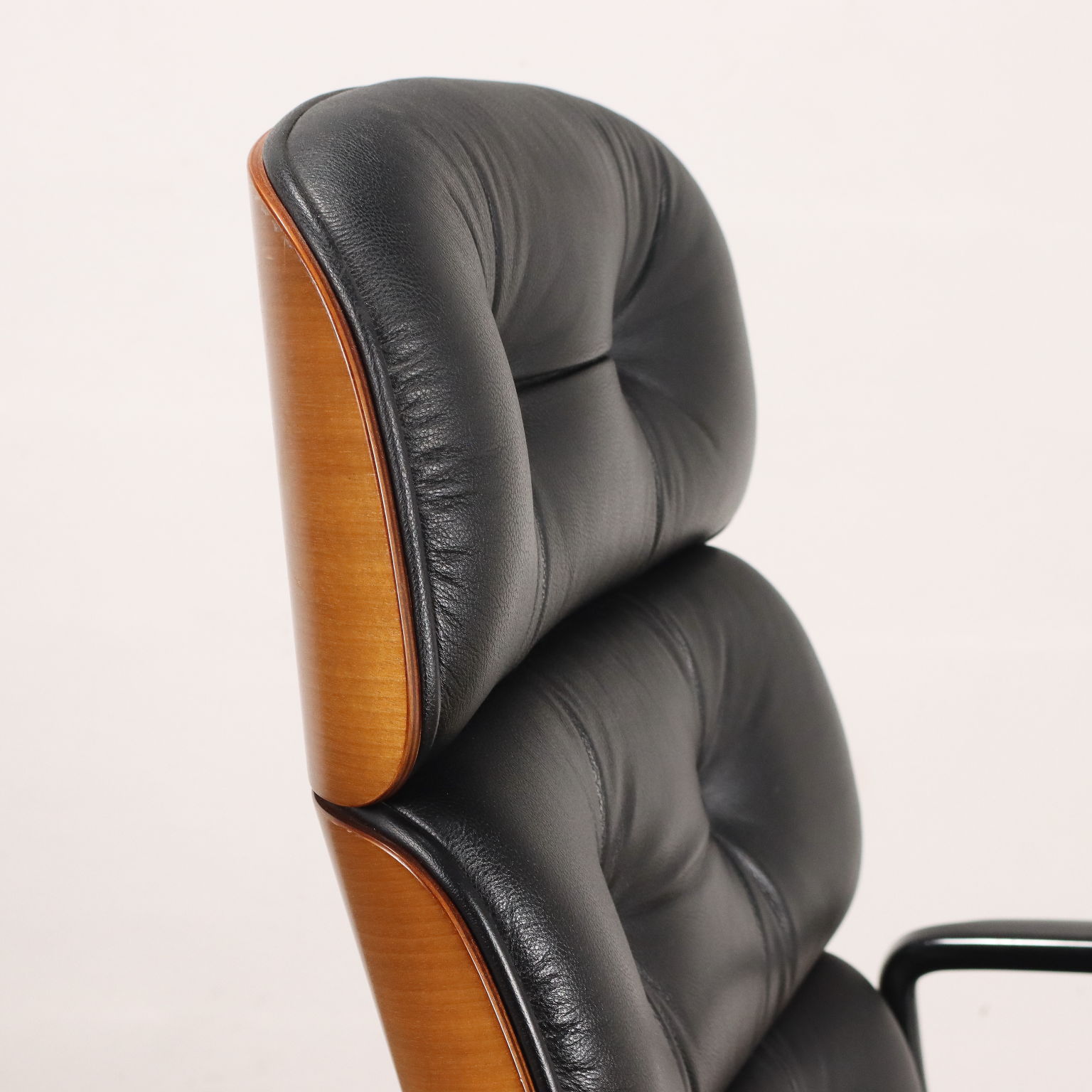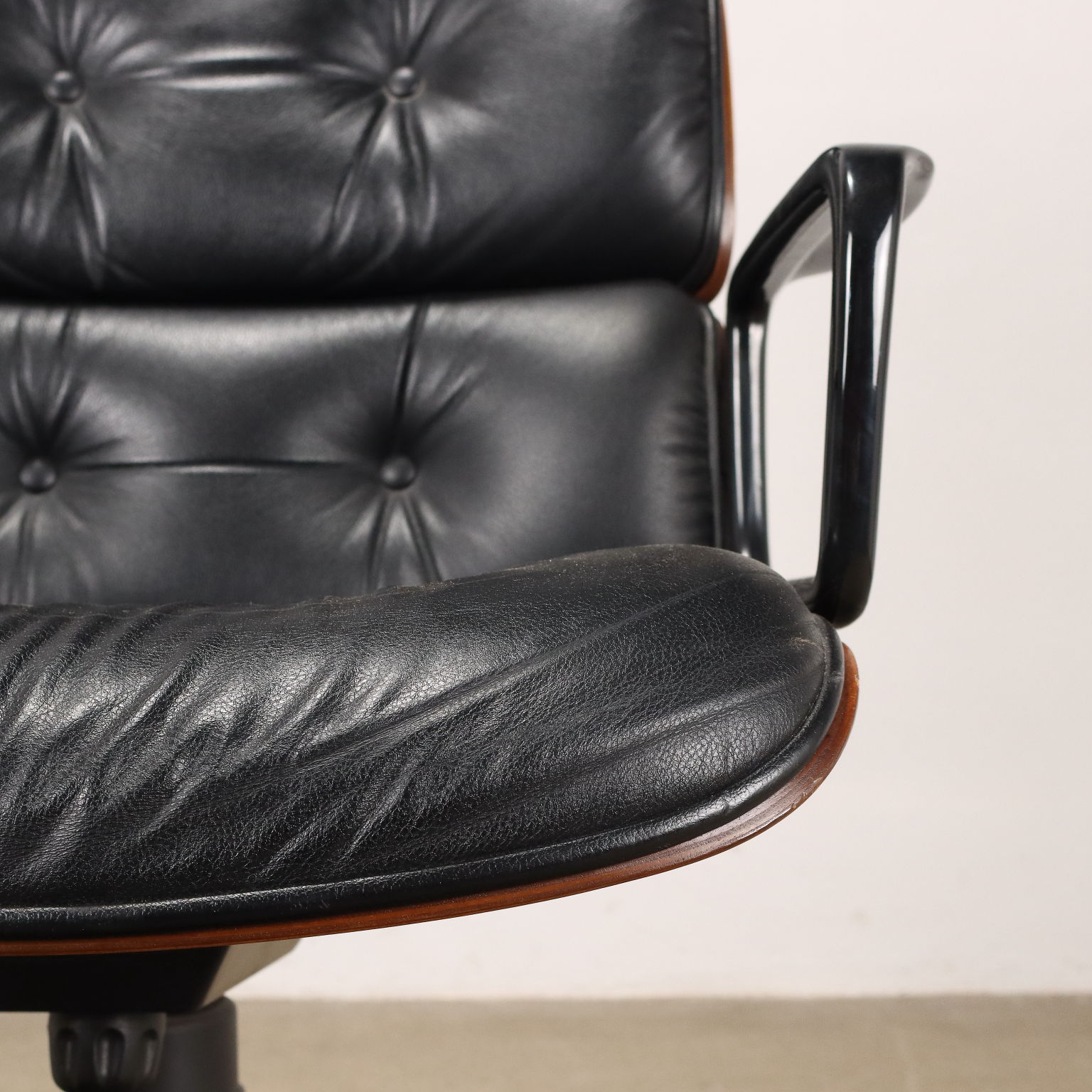 Sedia girevole da ufficio a schienale alto con scocca in legno curvato, seduta e schienale con imbottitura in espanso e rivestimento in pelle, struttura e razze in metallo. Presente il marchio della manifattura. Buone Condizioni.
