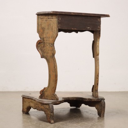 Inginocchiatoio barocco sorretto da montanti mossi e intagliati; laccato e dipinto, la laccatura è stata ripresa.