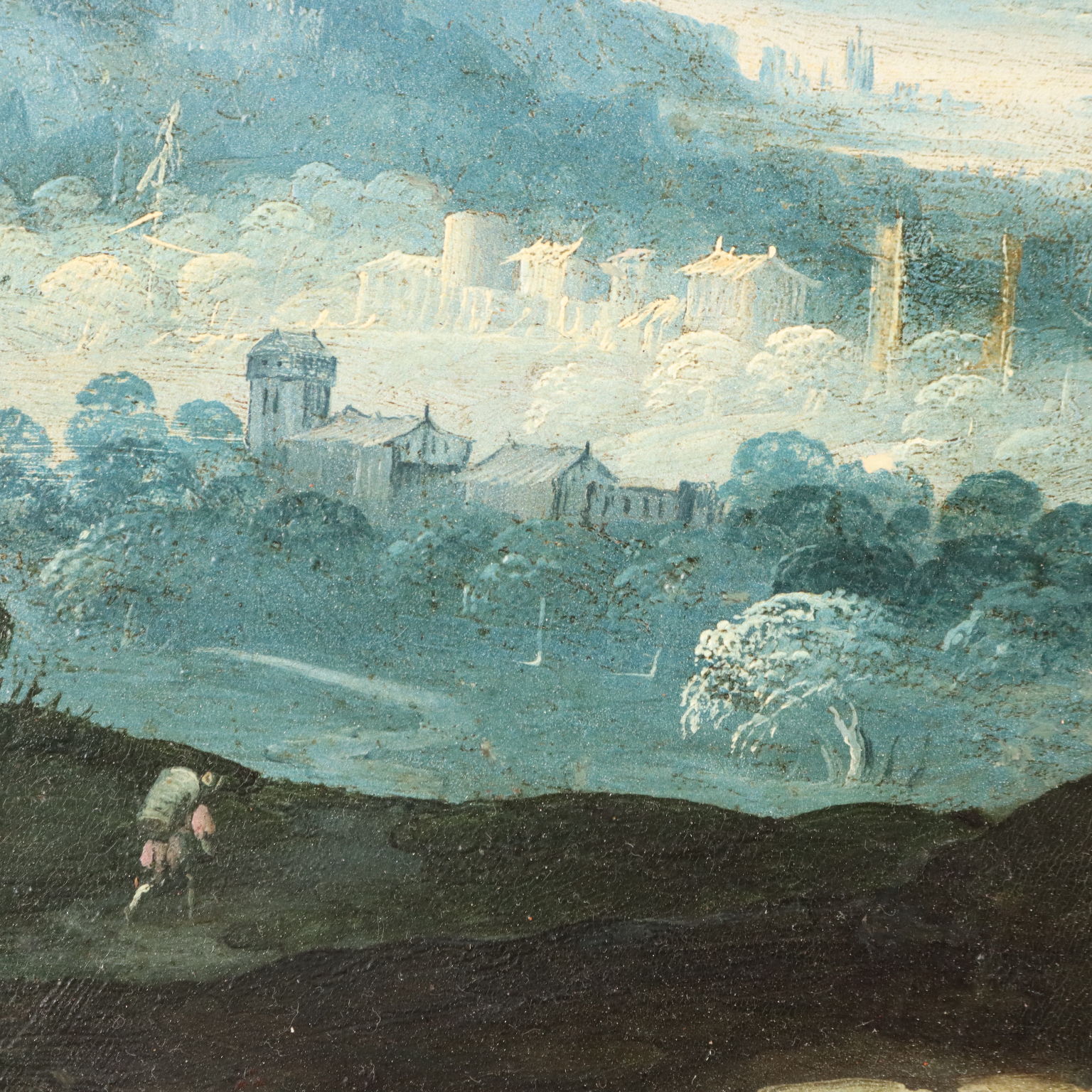 Olio su tavola di noce. Scuola fiamminga del XVI secolo. Il dipinto presenta un paesaggio caratterizzato da un alta pianta frondosa al centro, che divide verticalmente la scena in due parti, svettando dalla terra bruna e scura in primo piano, verso l'orizzonte di boscose colline azzurre, che sfumano poi in un continuum cromatico nel cielo sovrastante, interrotto dalla folta chioma dell'albero. La scena in primo piano è animata di diverse figurine di personaggi in cammino, sparsi nella campagna. Peculiari le scelte cromatiche, i bruni e gli azzurri, che insieme al tipo di paesaggio e alle figure rimandano alla pittura fiamminga; peraltro l' utilizzo di una tavola di noce depone per un artista fiammingo operante in Italia, ove veniva utilizzato tale supporto pittorico, inconsueto nel nord- Europa. Il dipinto è presentato in cornice coeva.