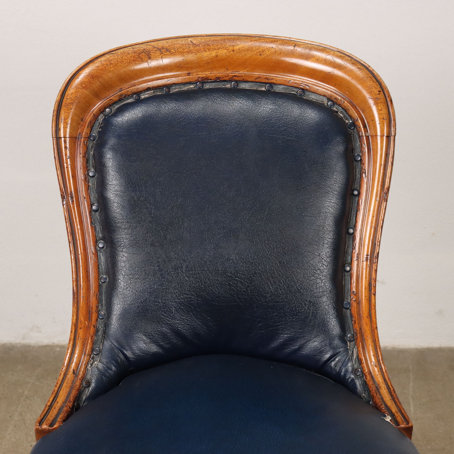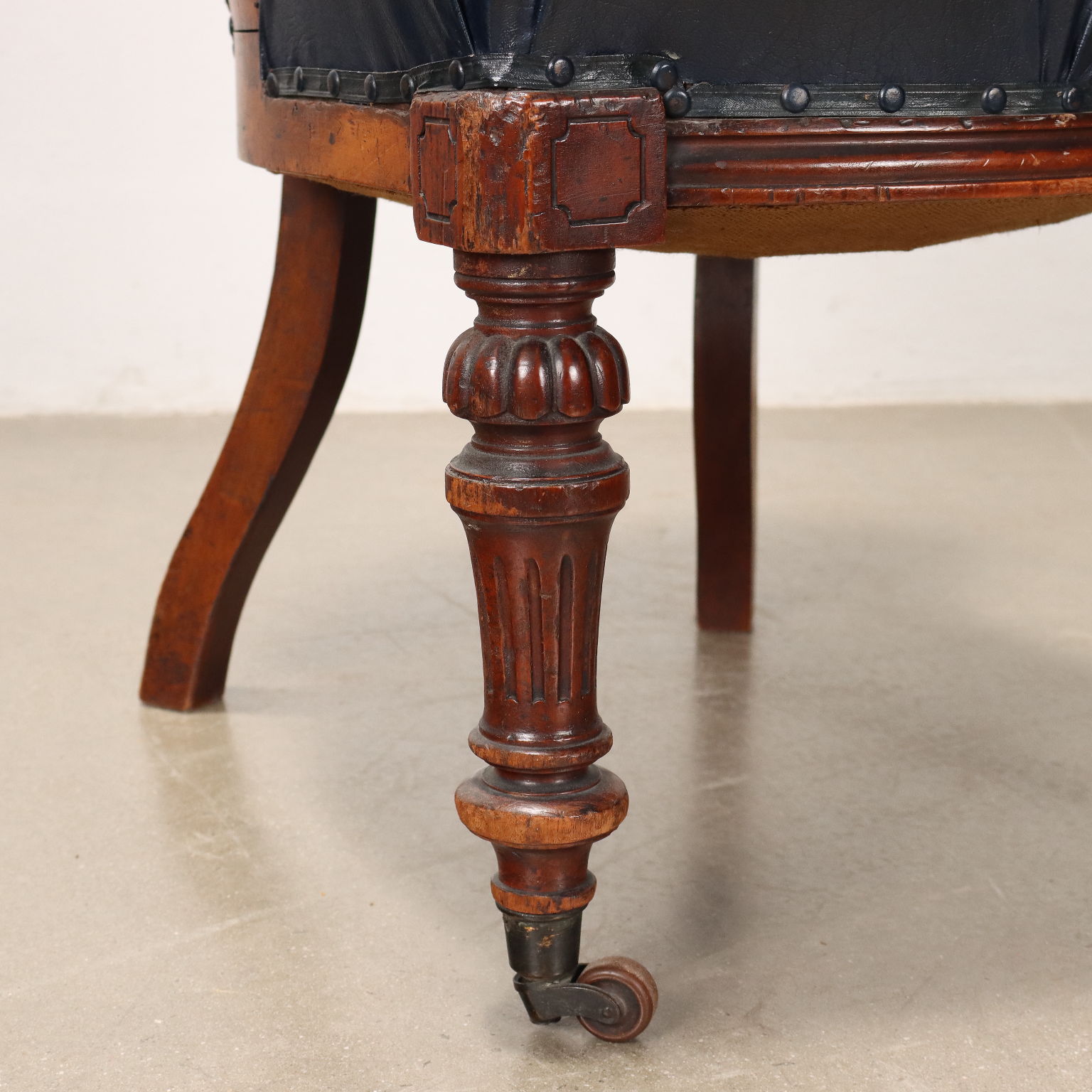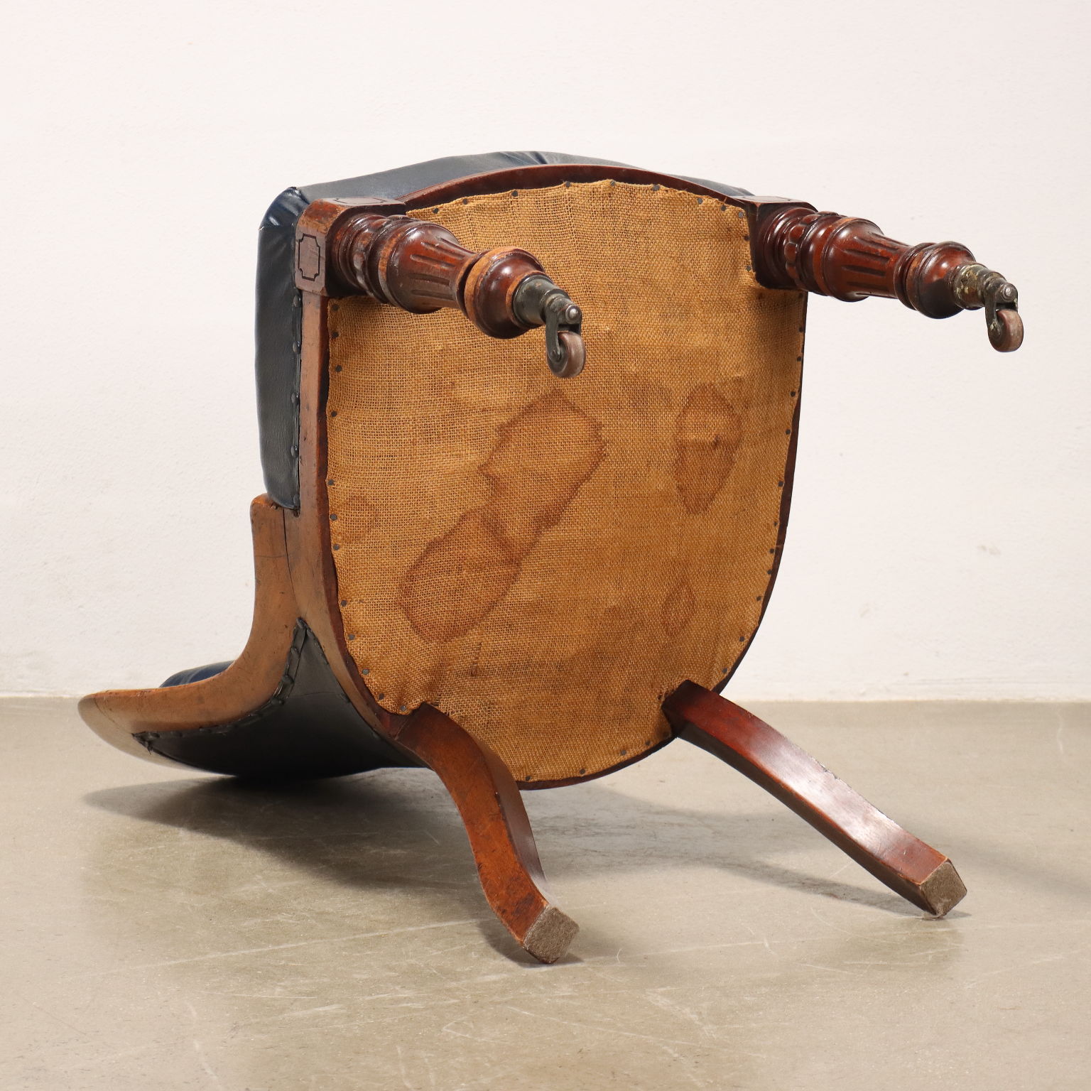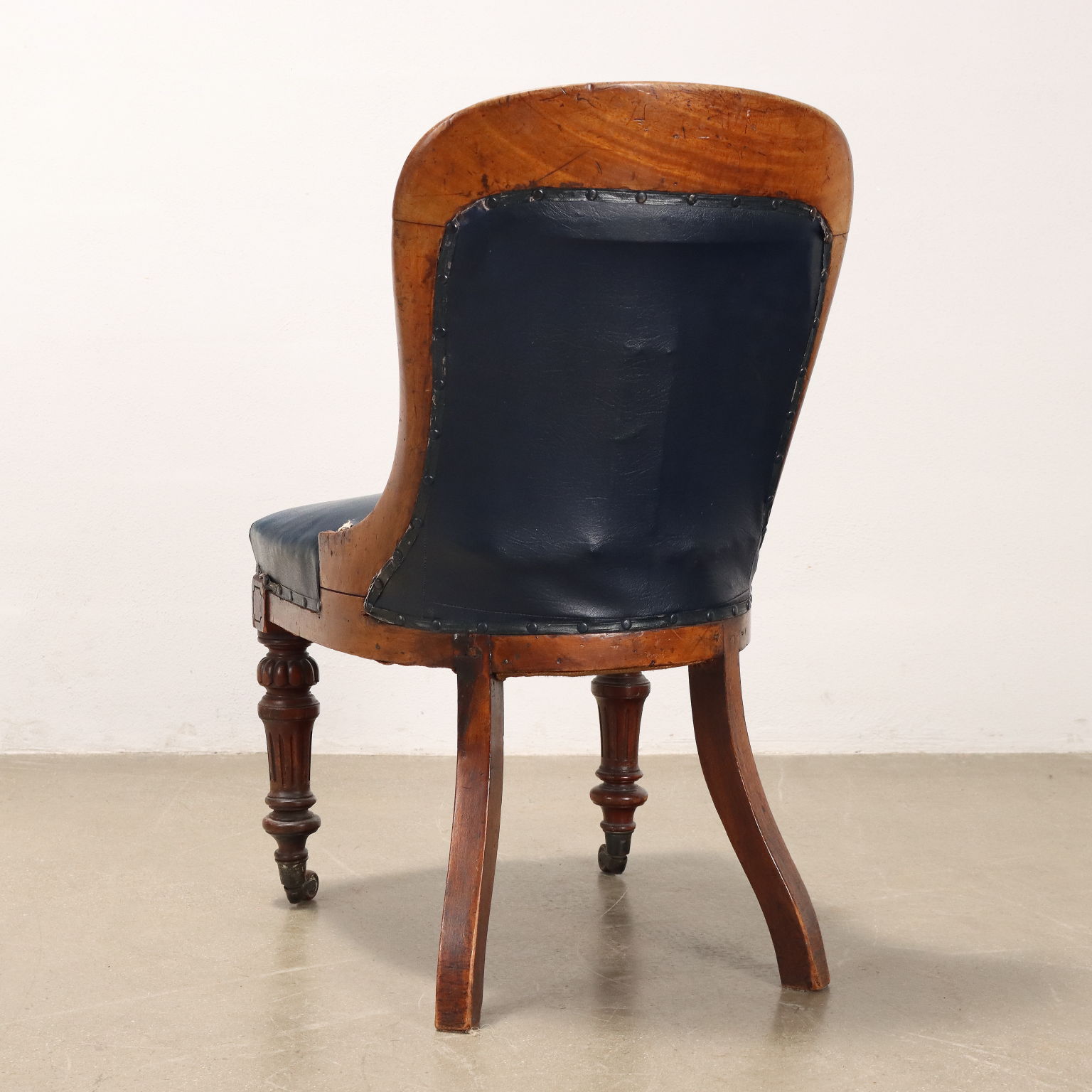 Sedia Luigi Filippo in mogano, Francia metà XIX secolo. Gambe posteriori mosse, anteriori troncoconiche tornite, intagliate e terminanti con ruote. Schienale e seduta imbottiti.