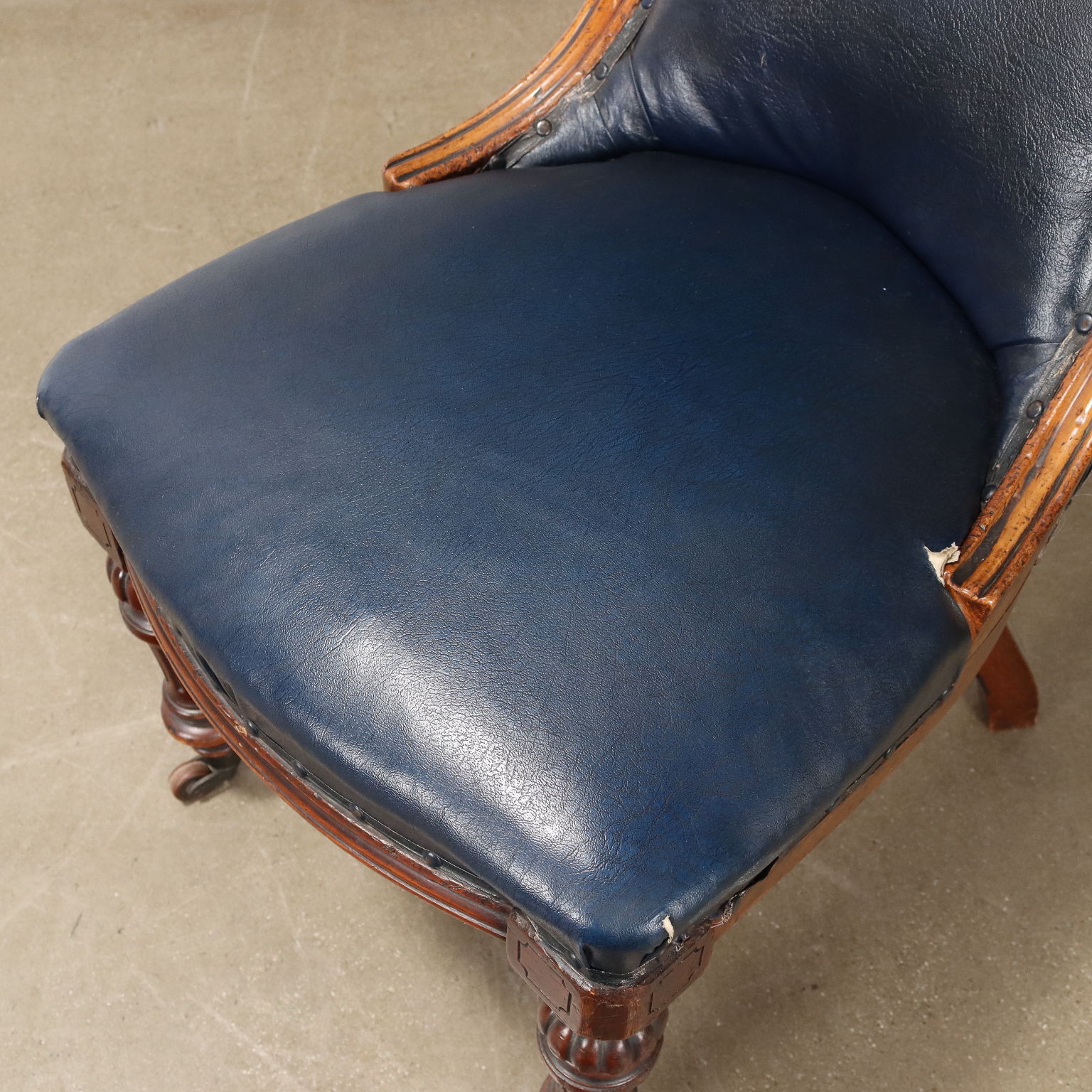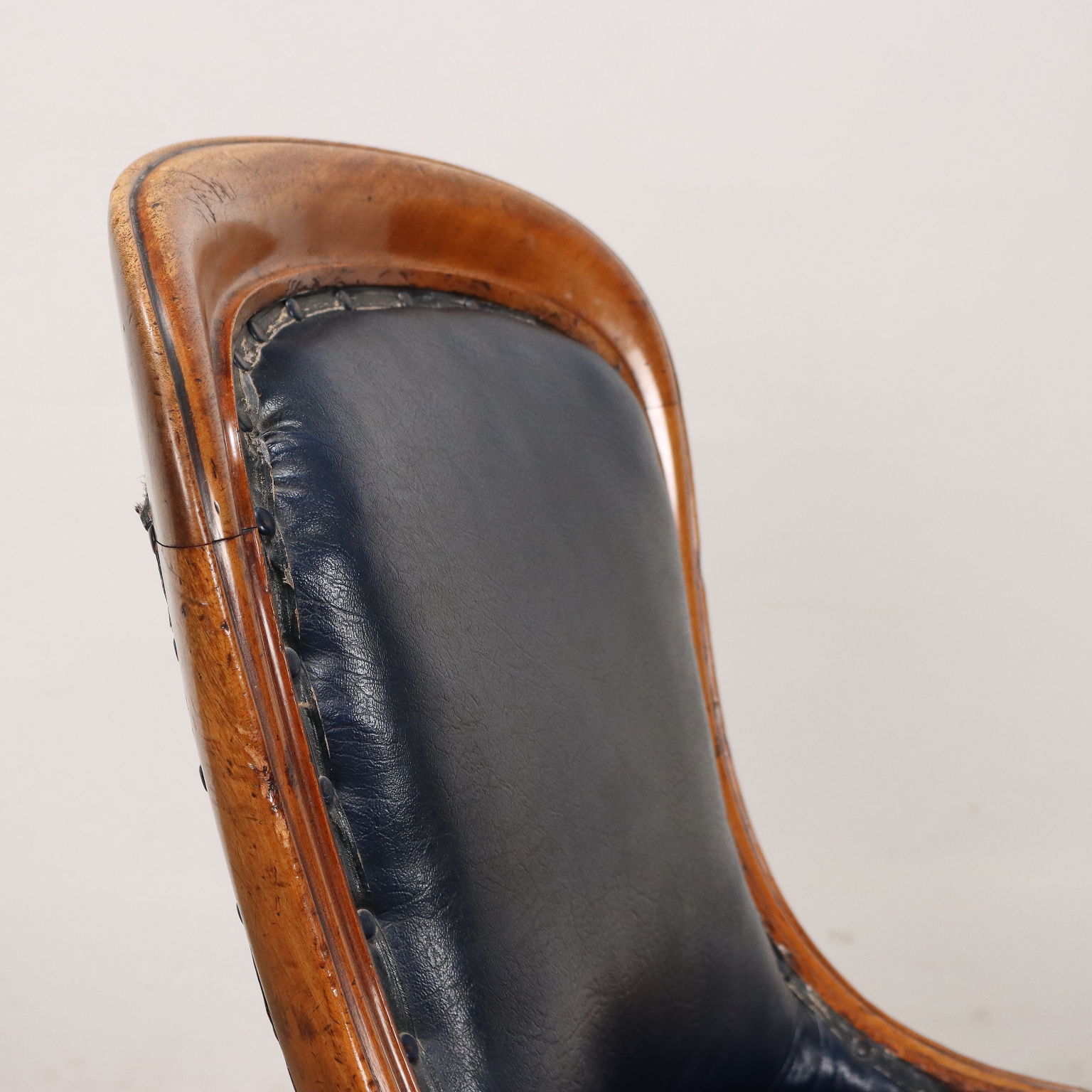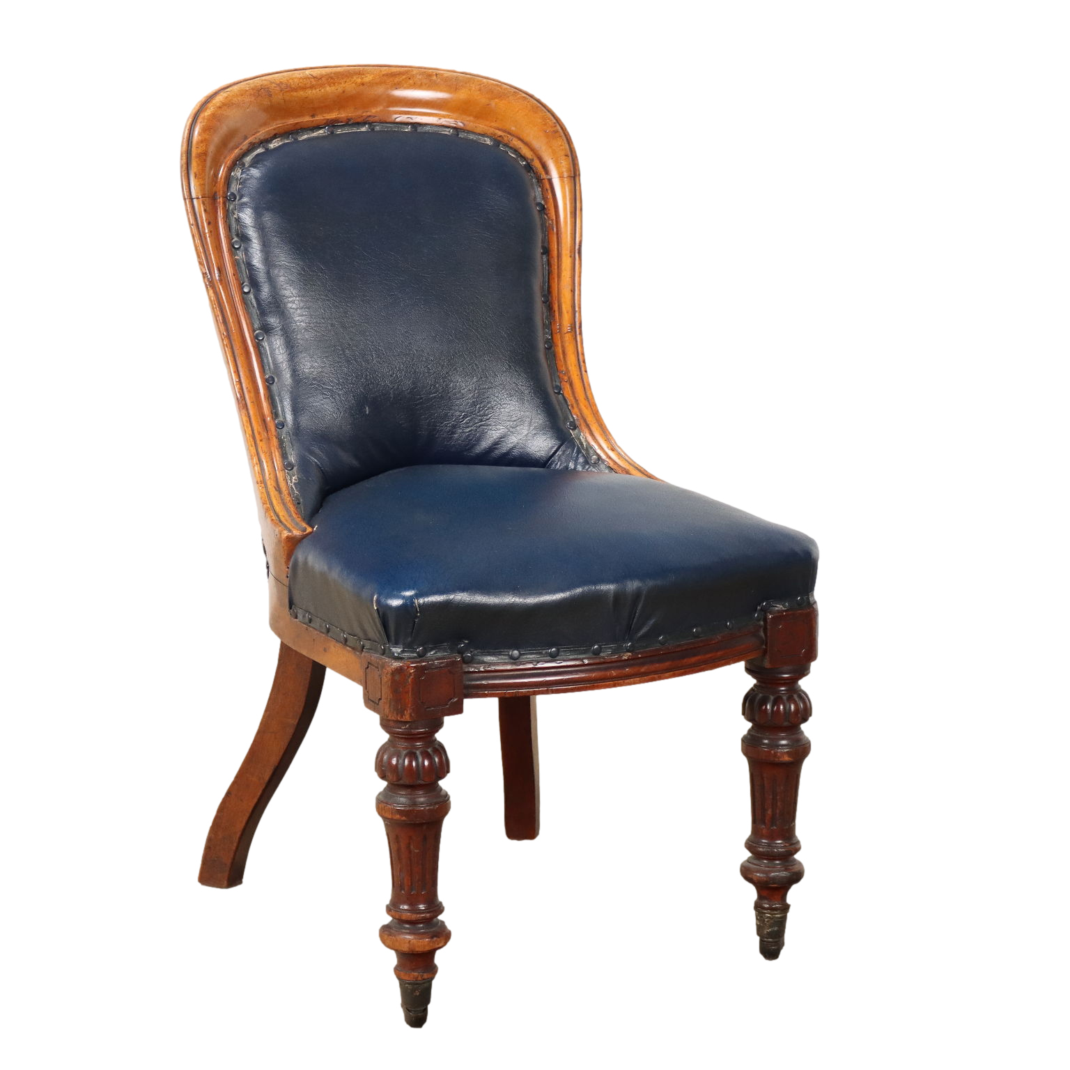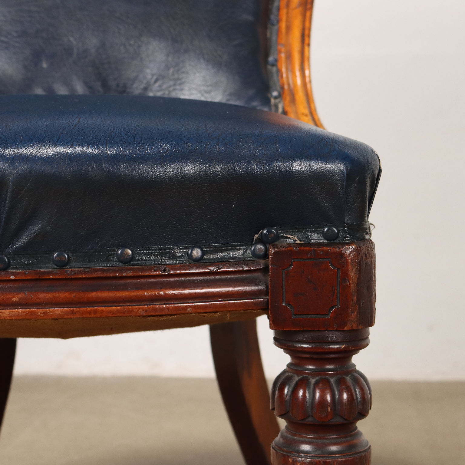 Sedia Luigi Filippo in mogano, Francia metà XIX secolo. Gambe posteriori mosse, anteriori troncoconiche tornite, intagliate e terminanti con ruote. Schienale e seduta imbottiti.