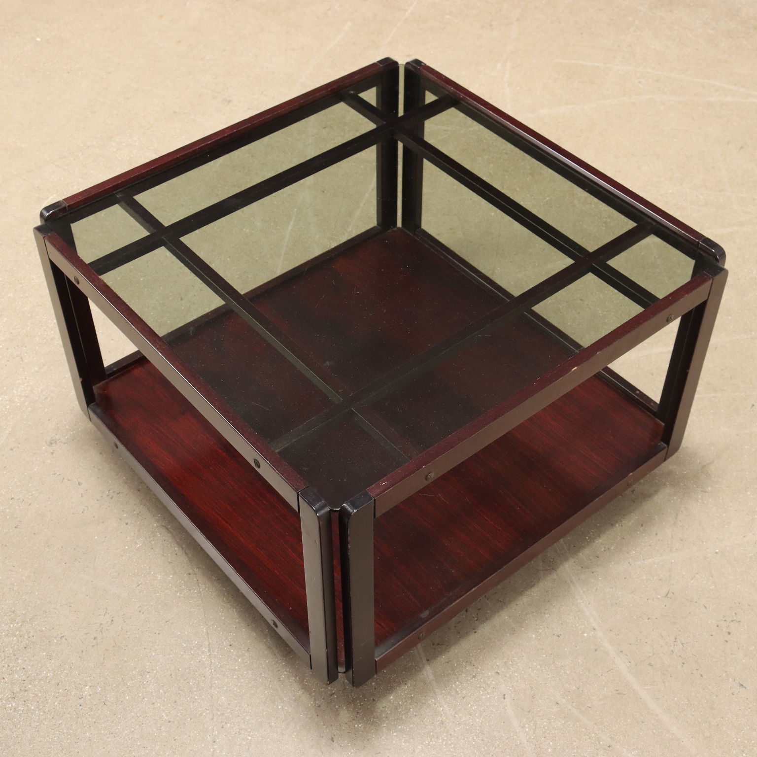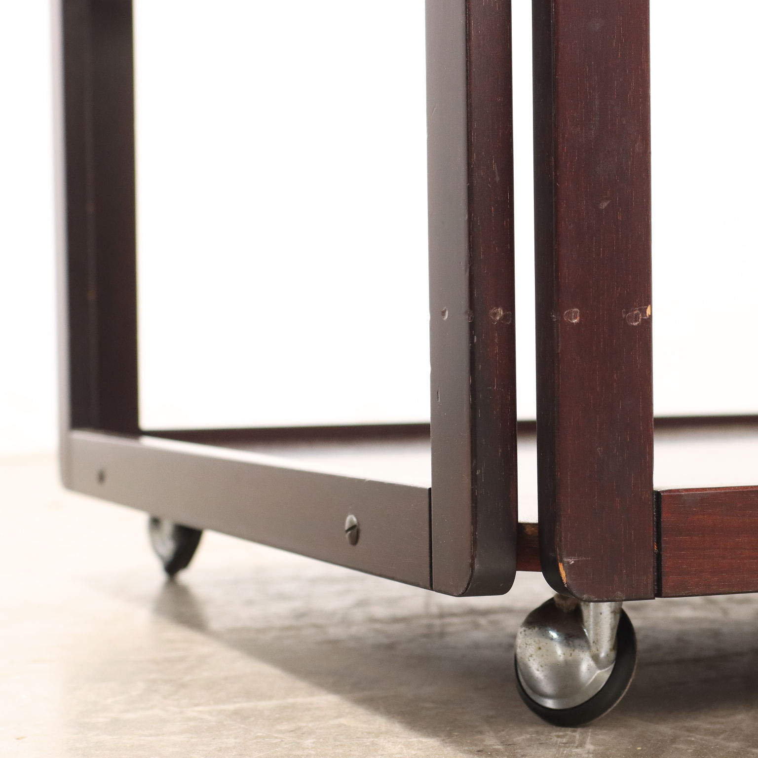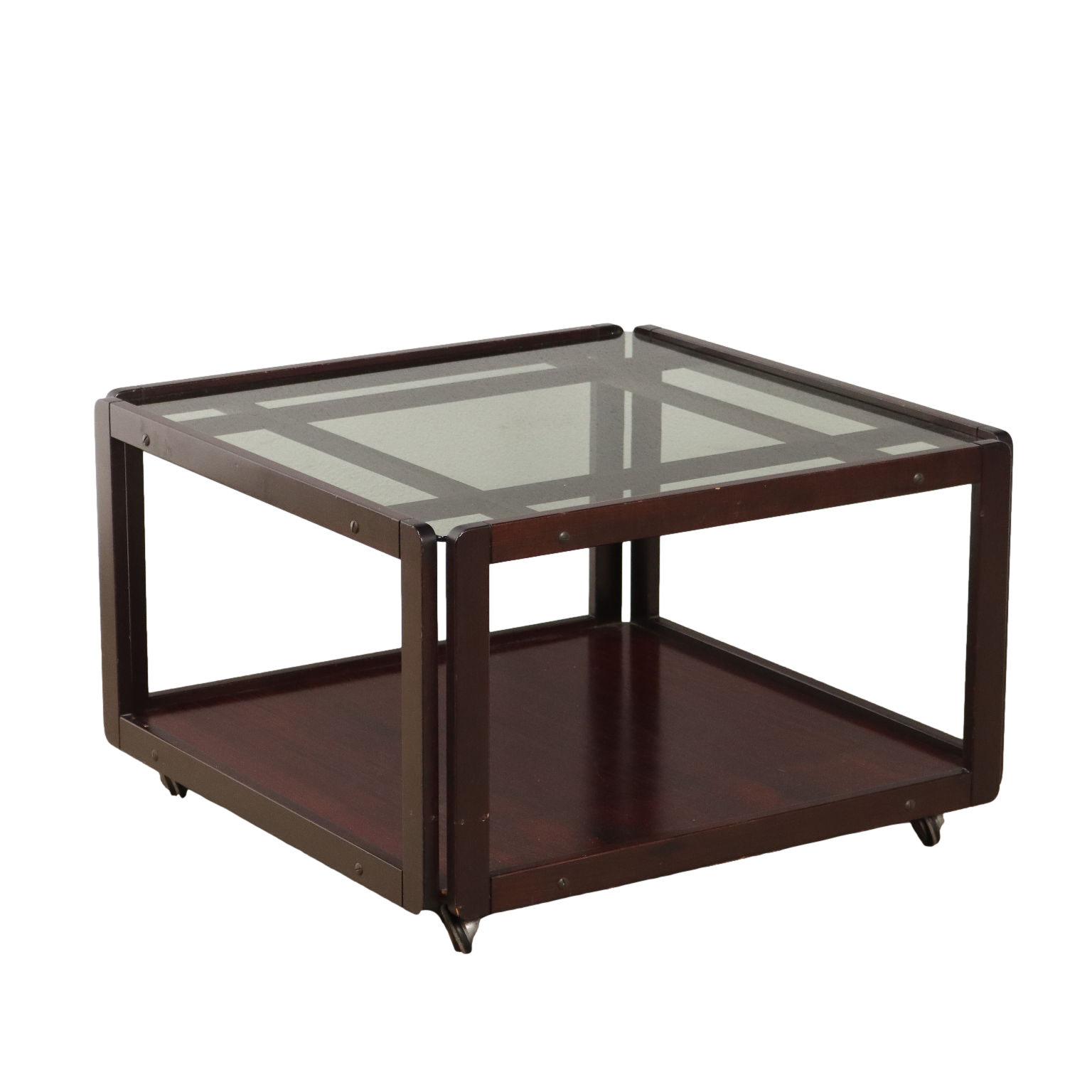 Tavolino con ruote e doppio piano. Legno massello e impiallacciato legno esotico, vetro.