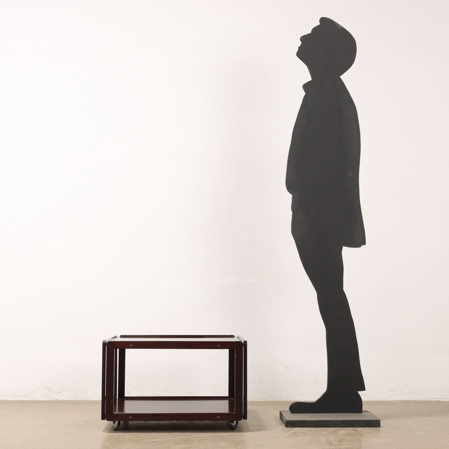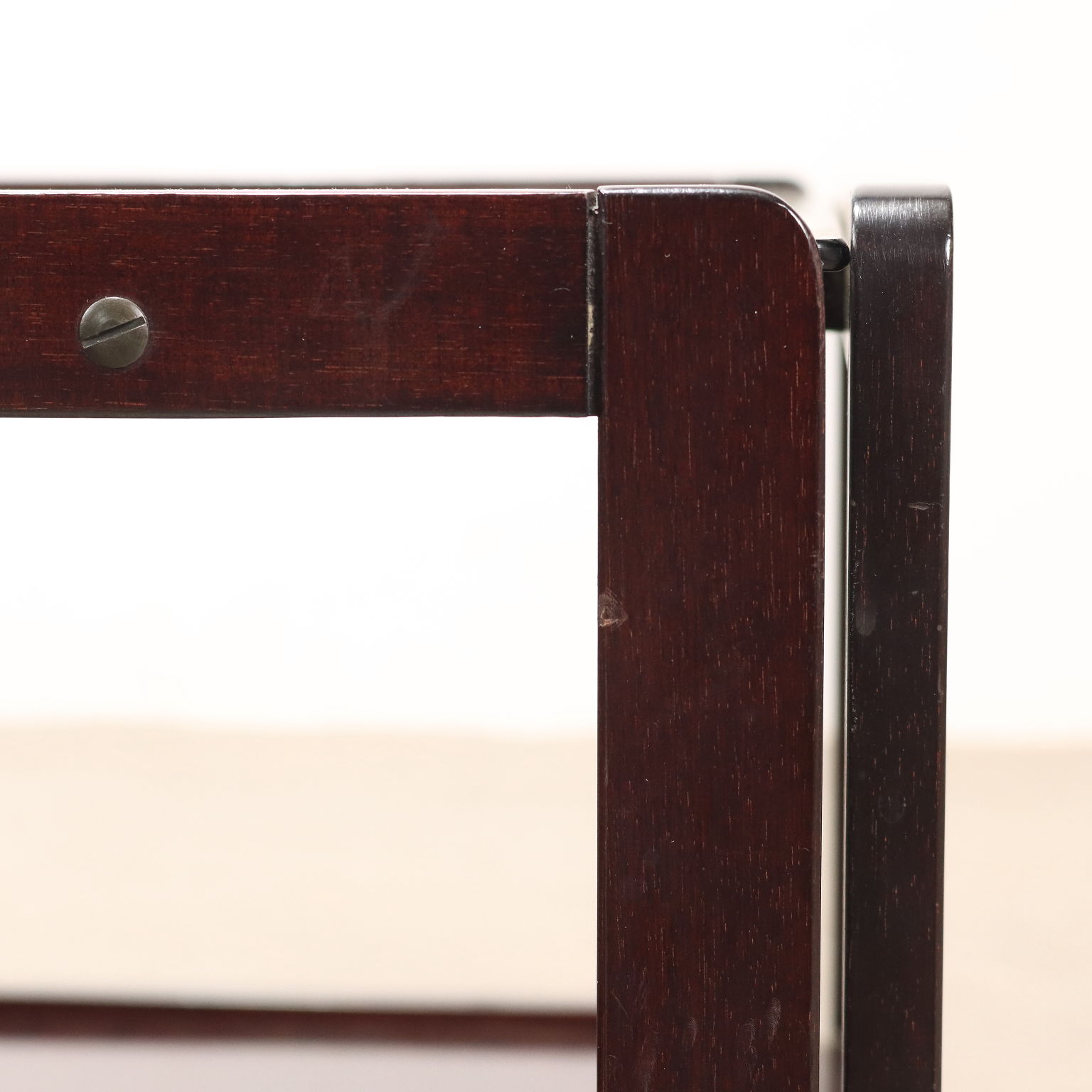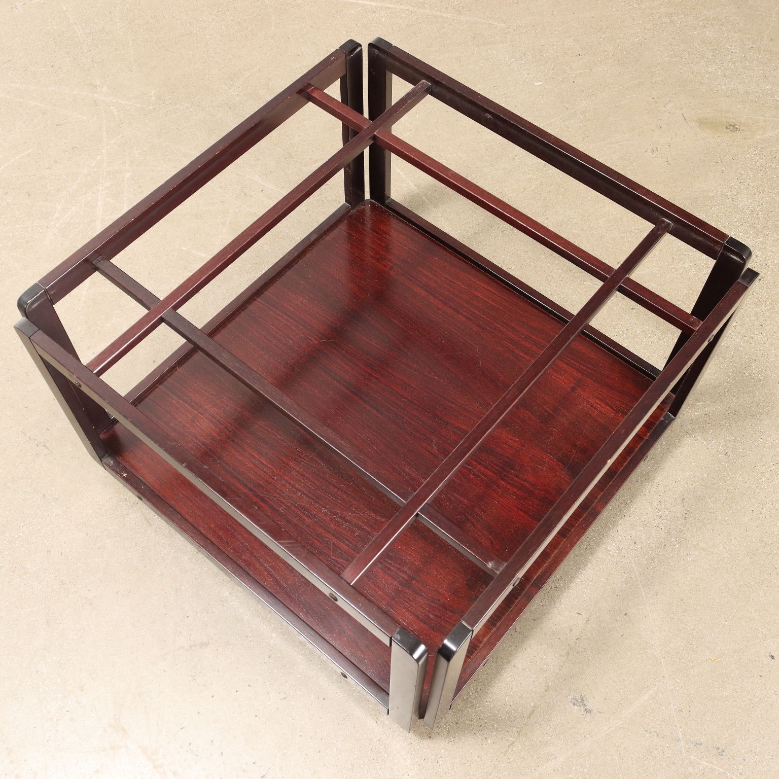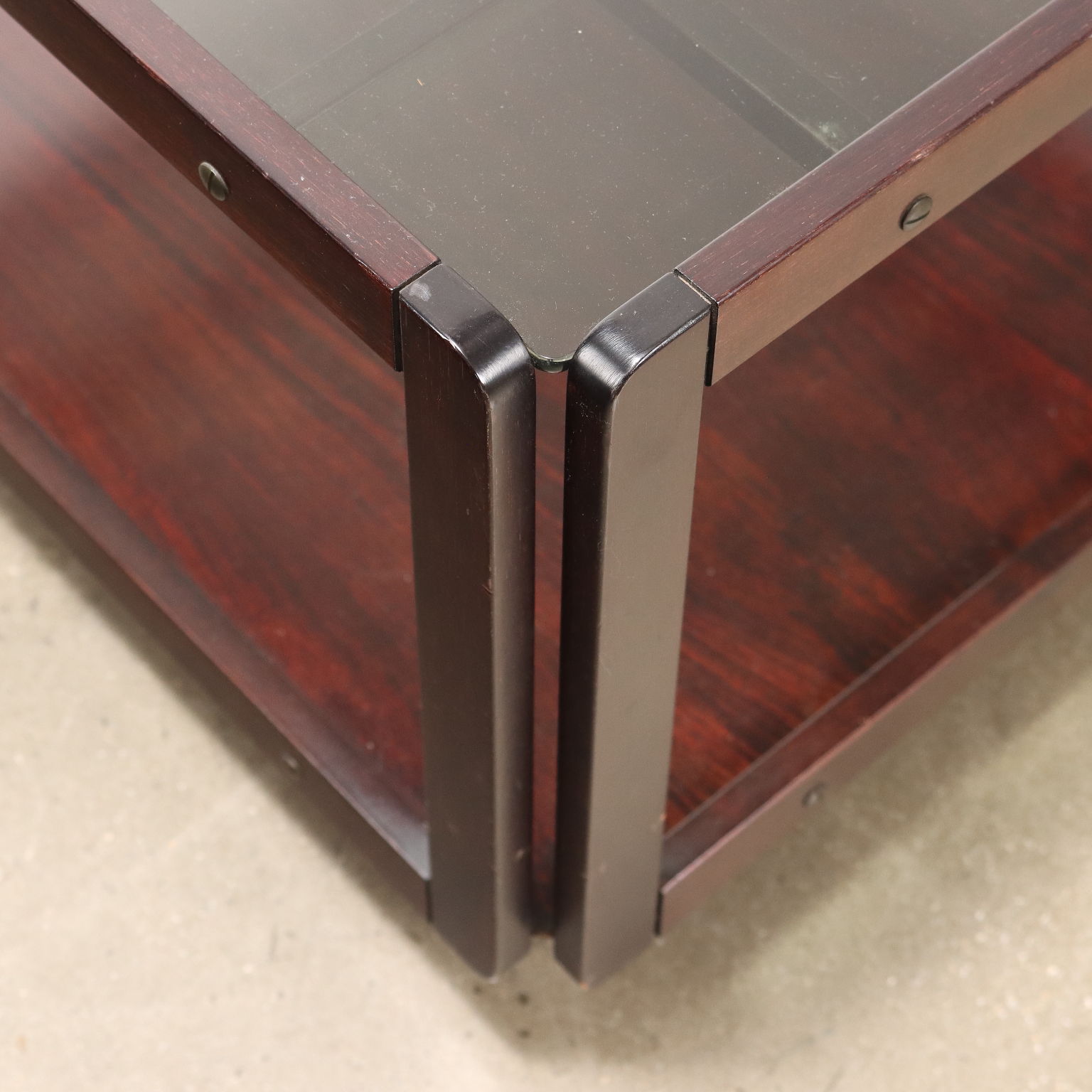 Tavolino con ruote e doppio piano. Legno massello e impiallacciato legno esotico, vetro.