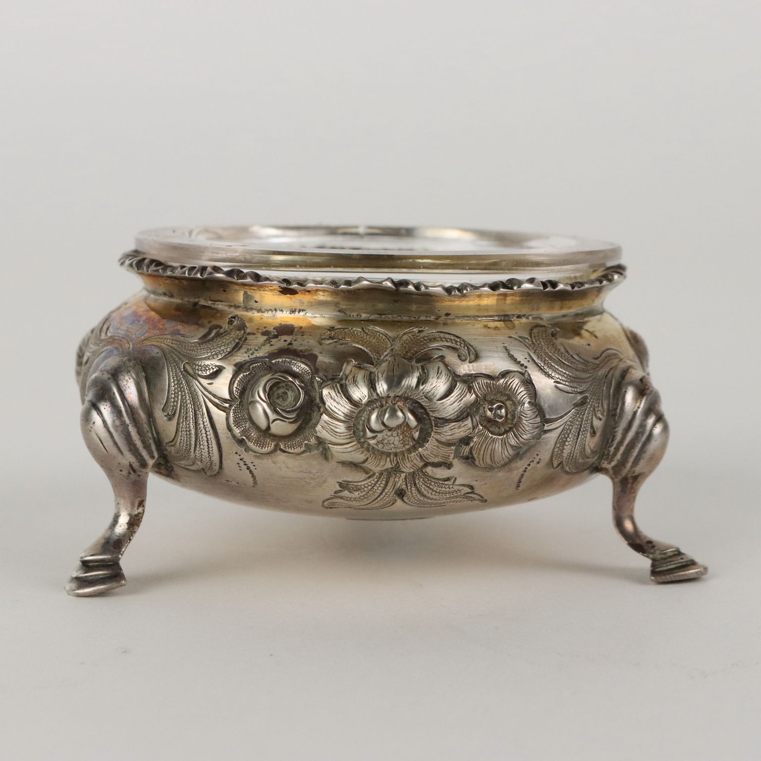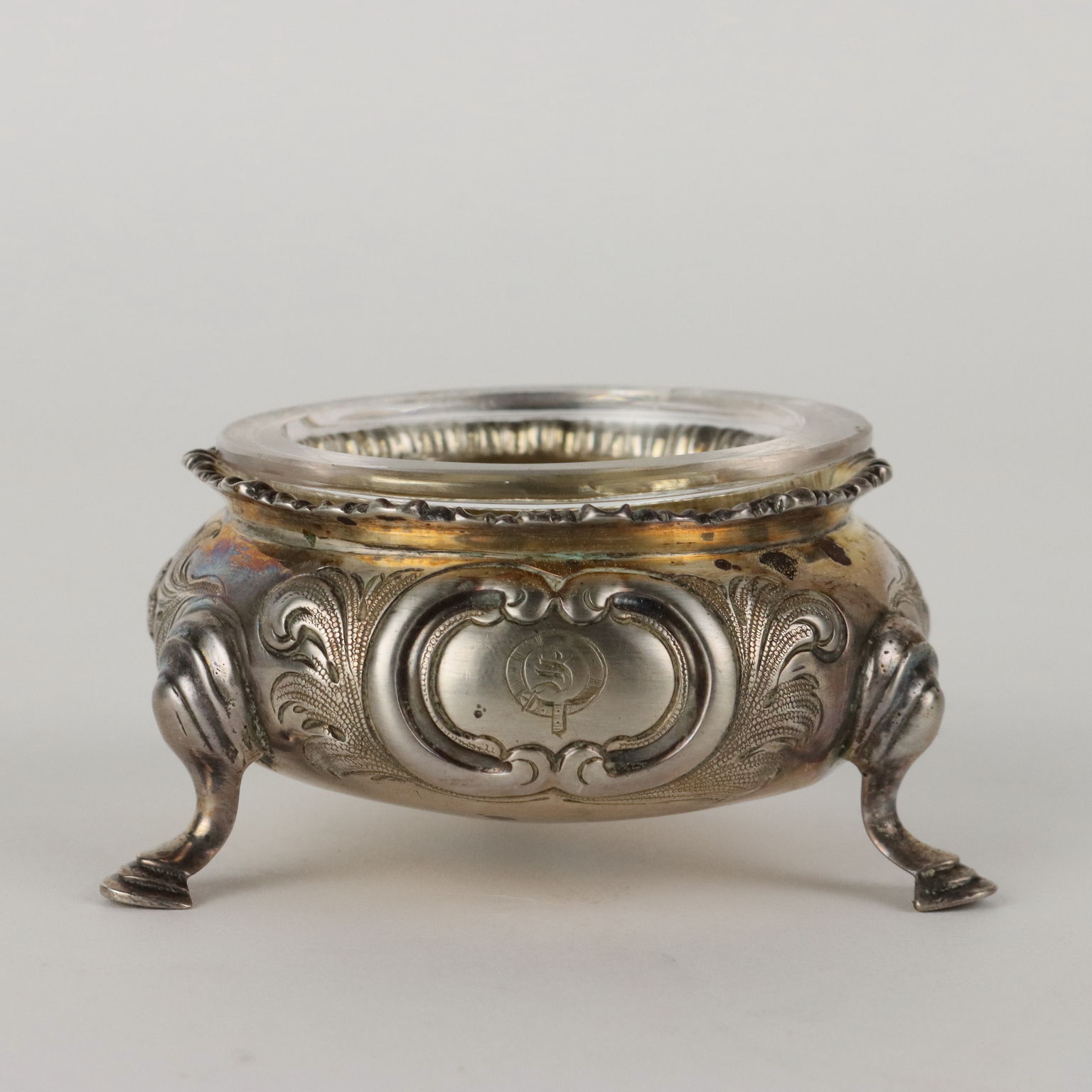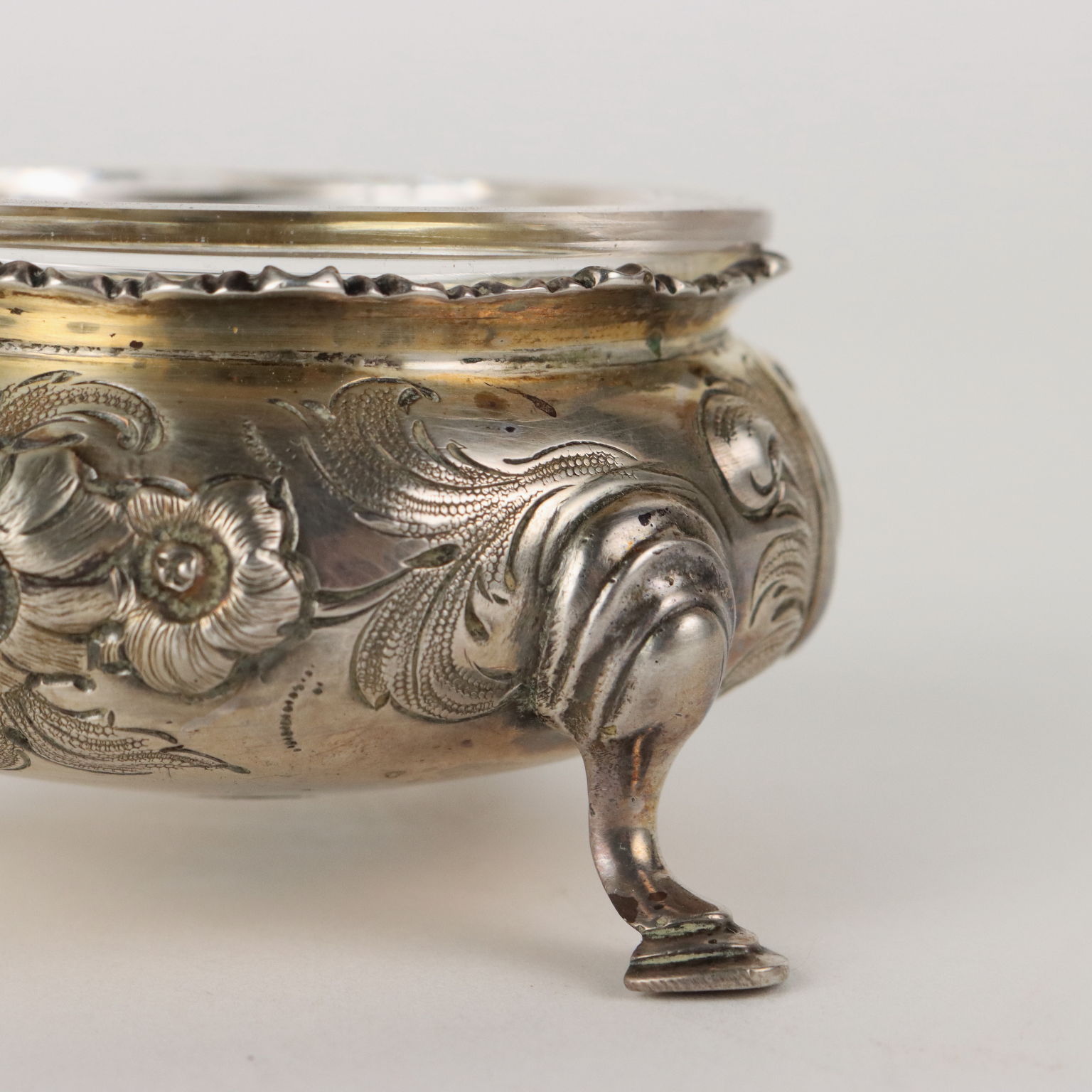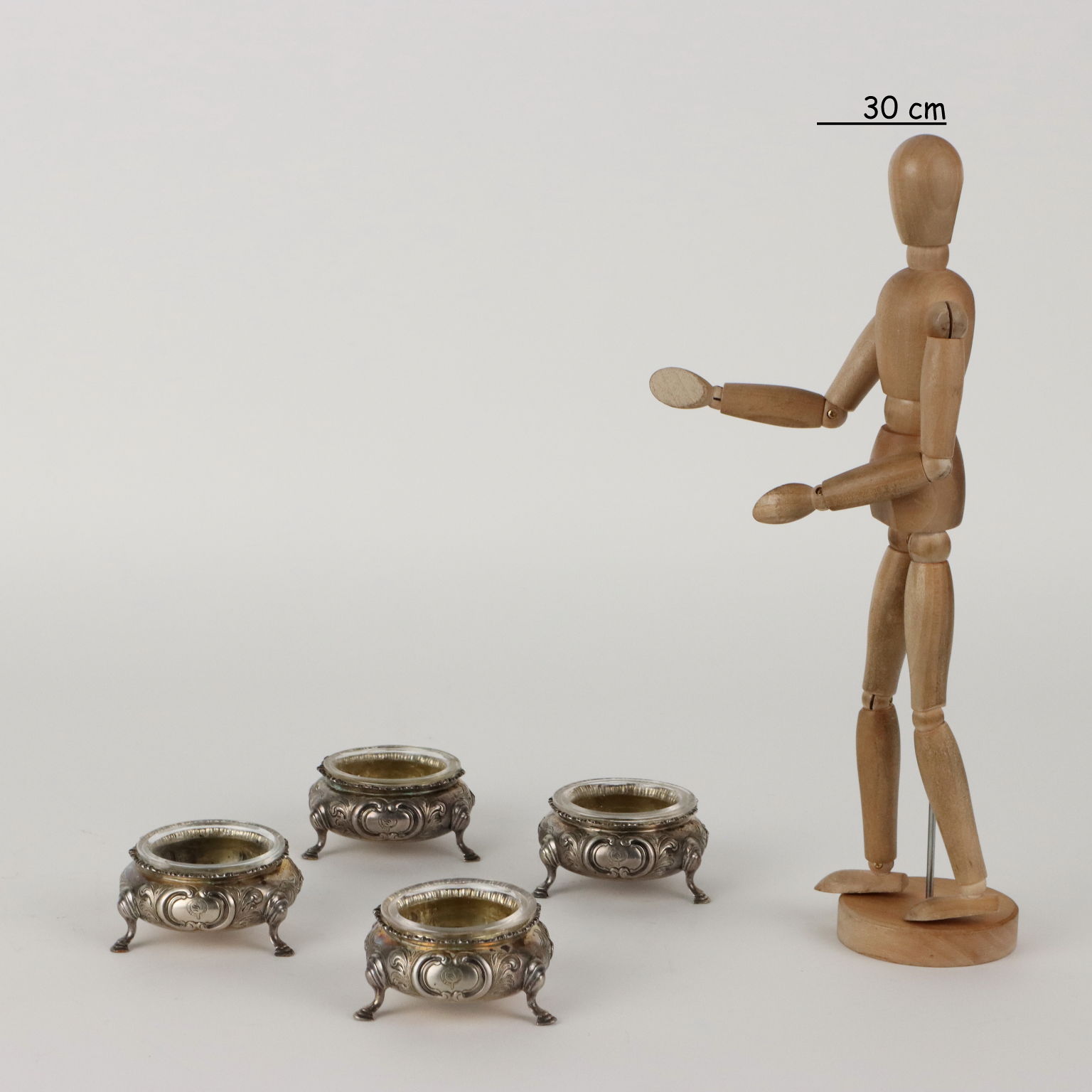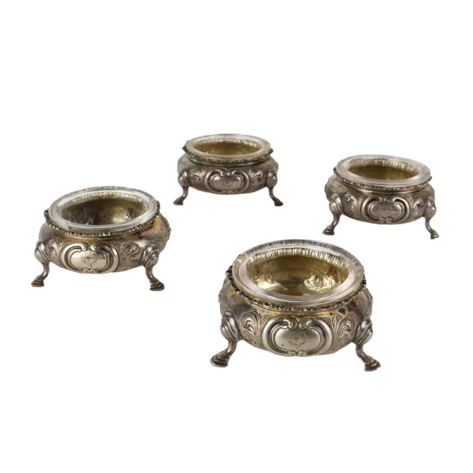 Gruppo di quattro saliere in argento sbalzato e finemente cesellato. Decori a volute fogliacee e fiori. Marchi dell'argento e dell'argentiere non identificato incussi sotto la base. Grammi 252.