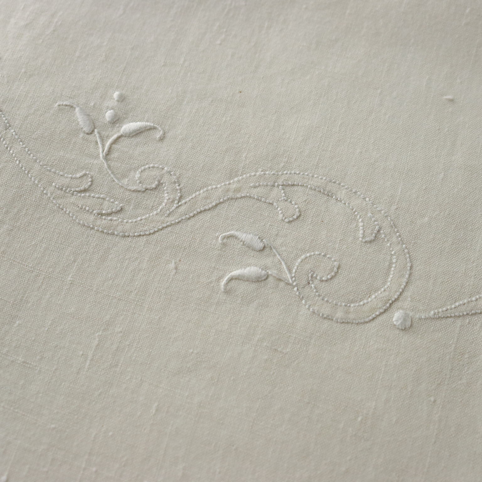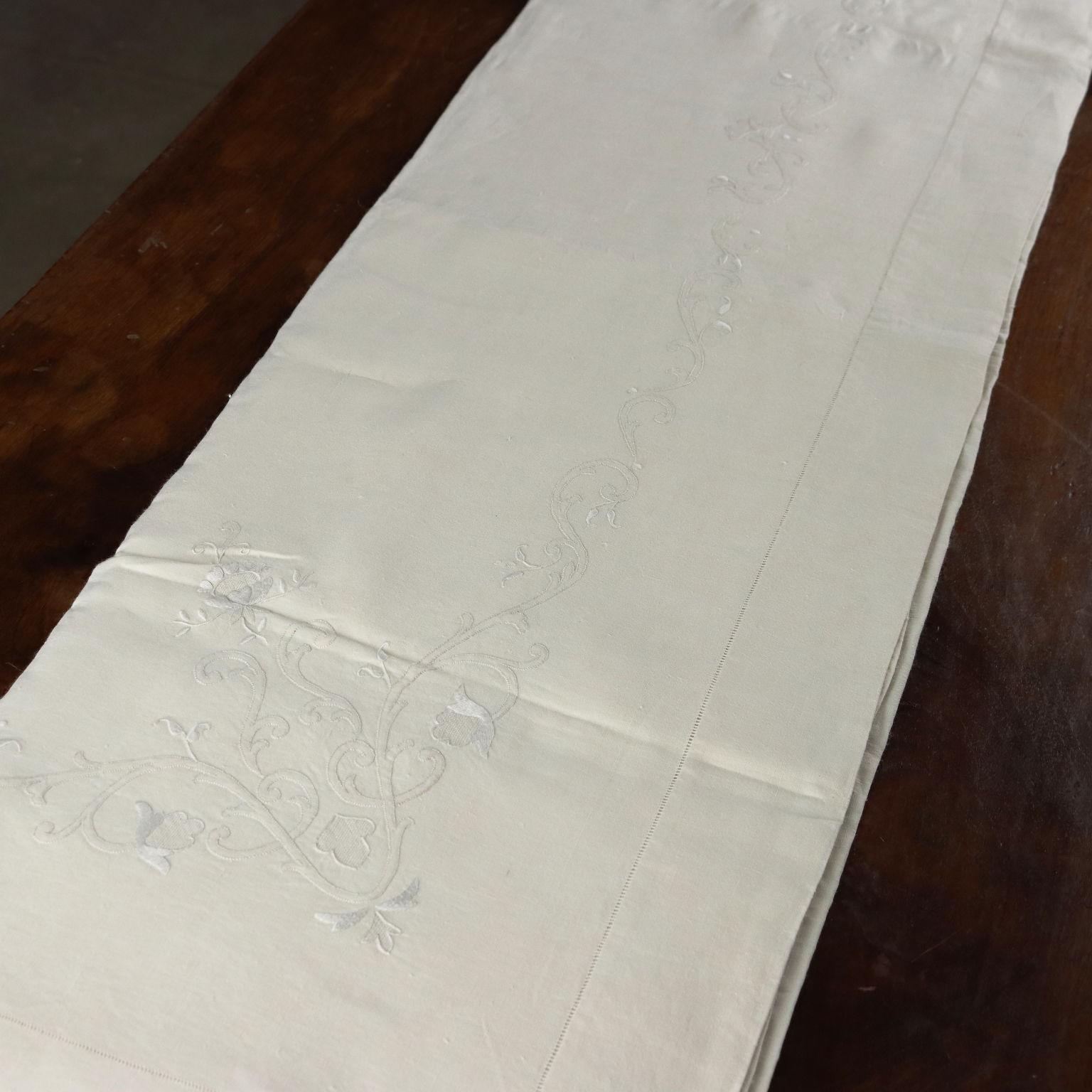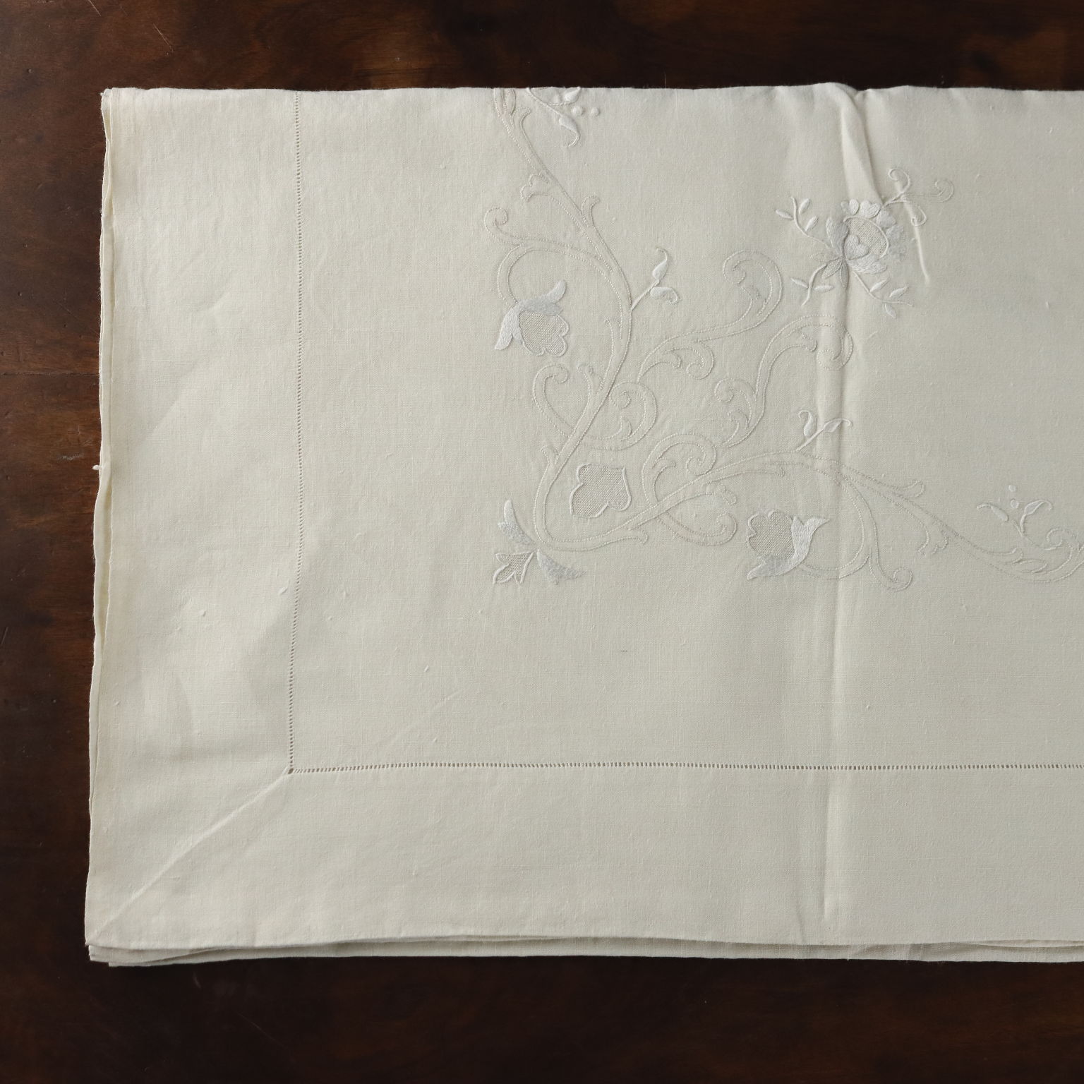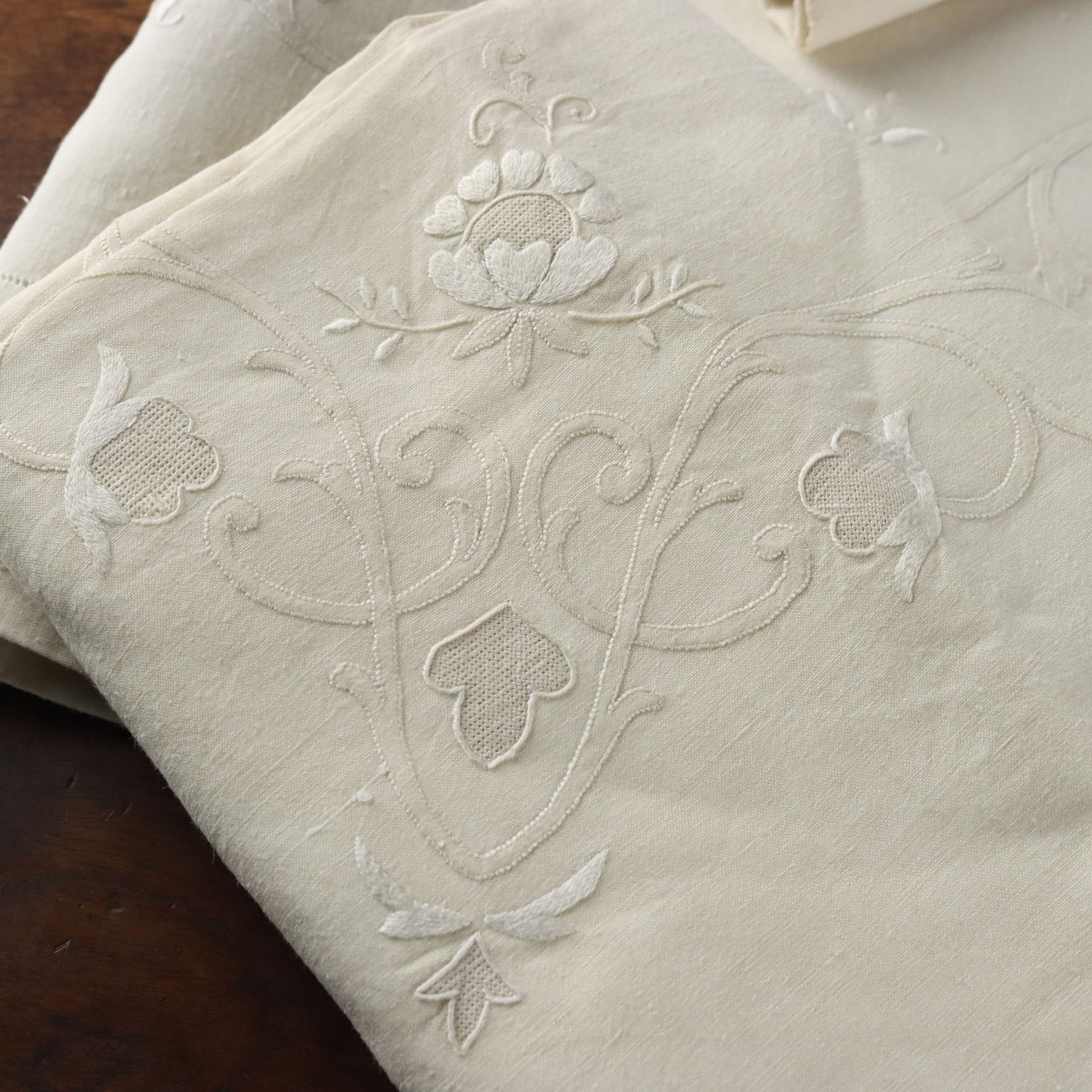 Completo matrimoniale con due federe Elegante e molto raffinata la rovescina ricamata a mano in punto ombra e punto rodi il tutto a tema floreale Le due federe si chiudono con allacciatura a bottoni tipica del periodo Colore avorio Composizione lino Dimensioni Lenzuolo cm 266 x cm 230 Federe cm 84 x cm 46