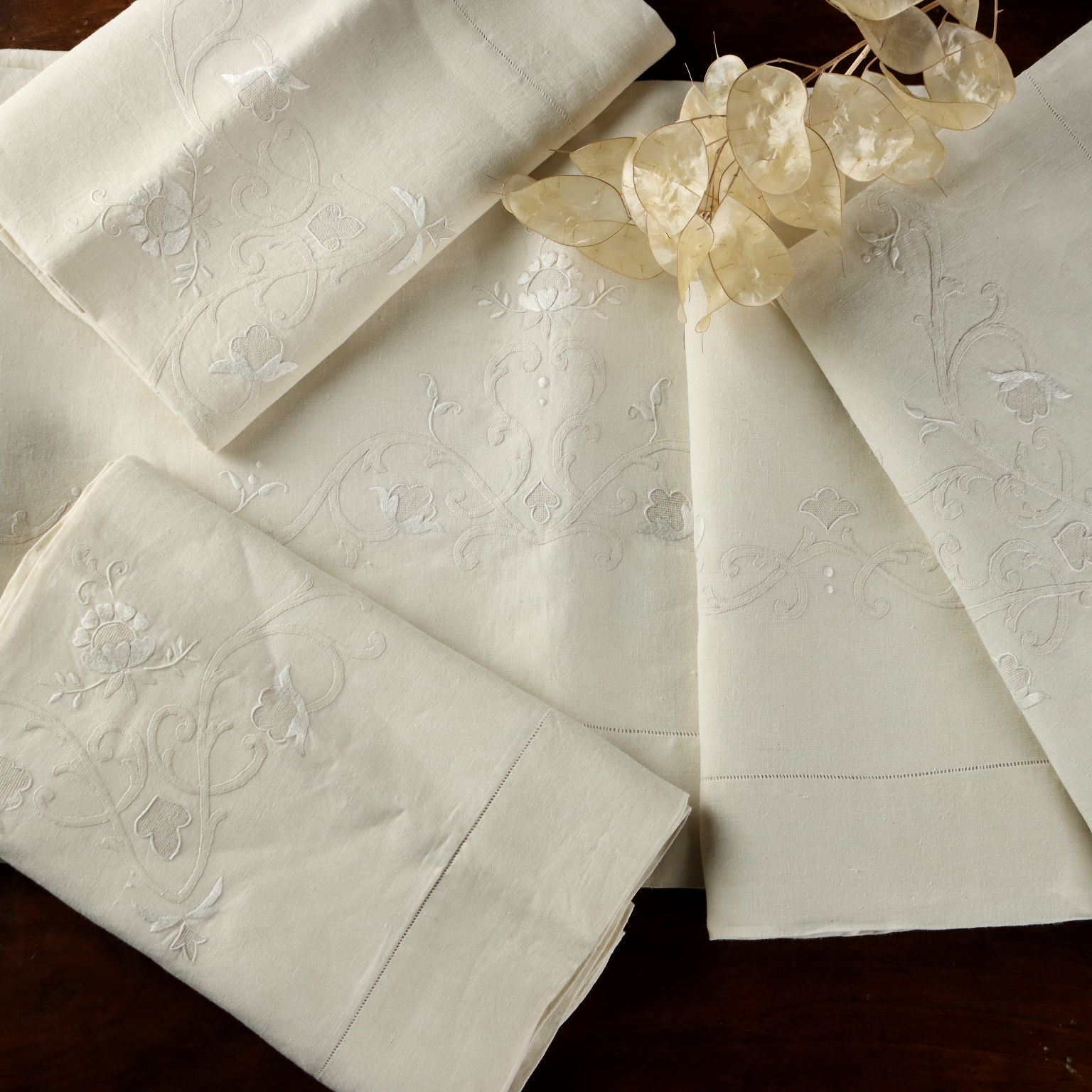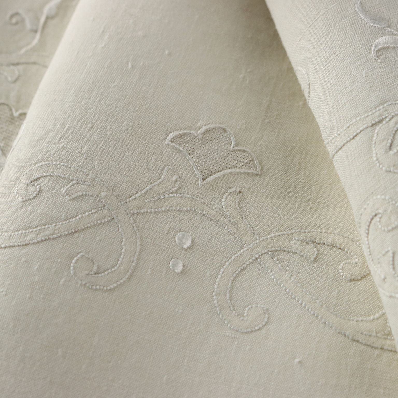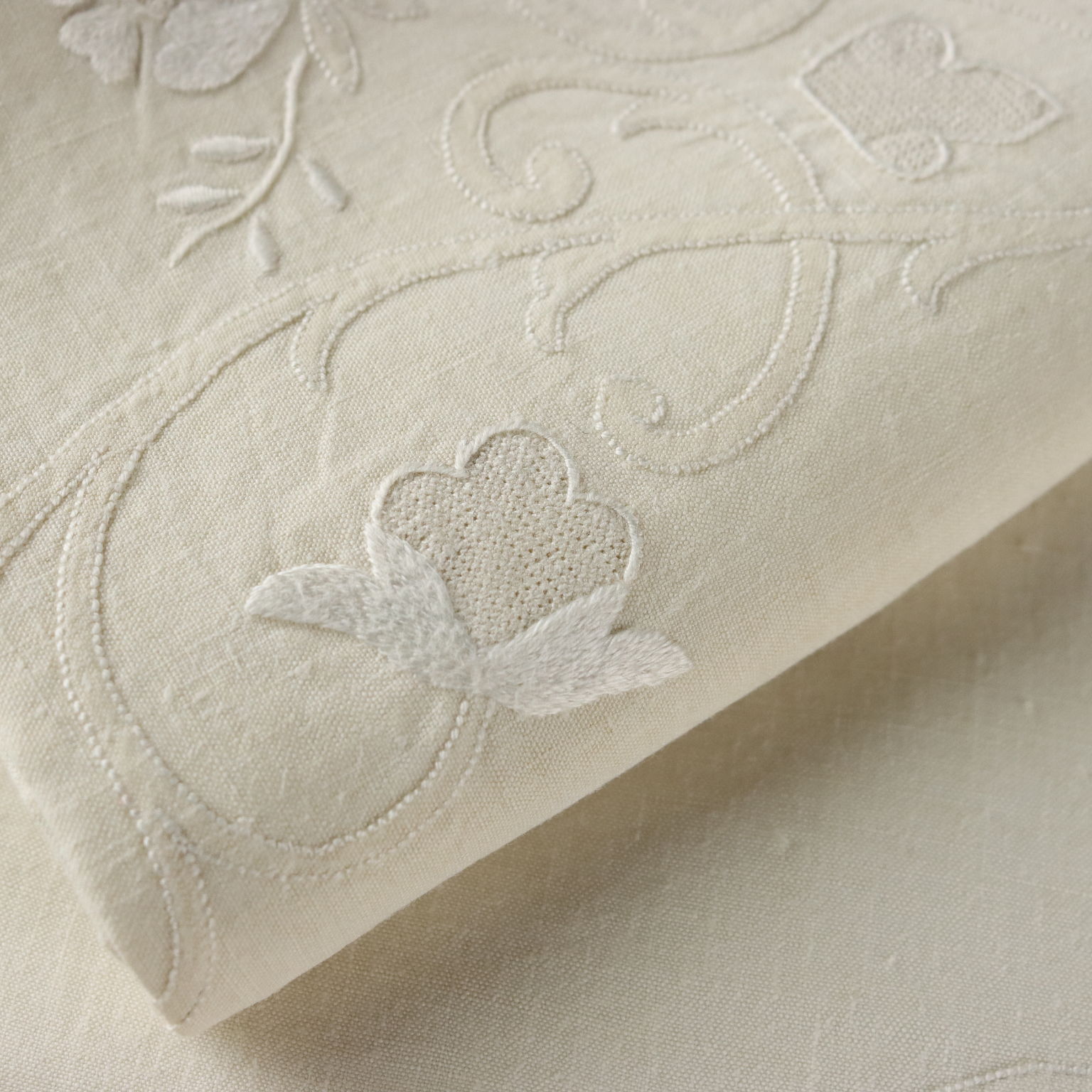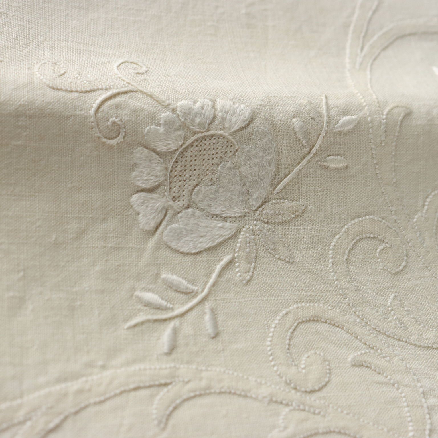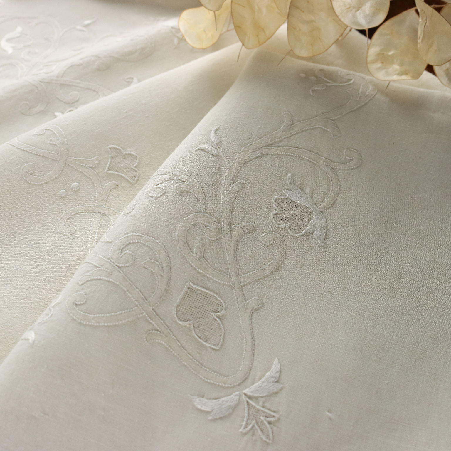 Completo matrimoniale con due federe Elegante e molto raffinata la rovescina ricamata a mano in punto ombra e punto rodi il tutto a tema floreale Le due federe si chiudono con allacciatura a bottoni tipica del periodo Colore avorio Composizione lino Dimensioni Lenzuolo cm 266 x cm 230 Federe cm 84 x cm 46