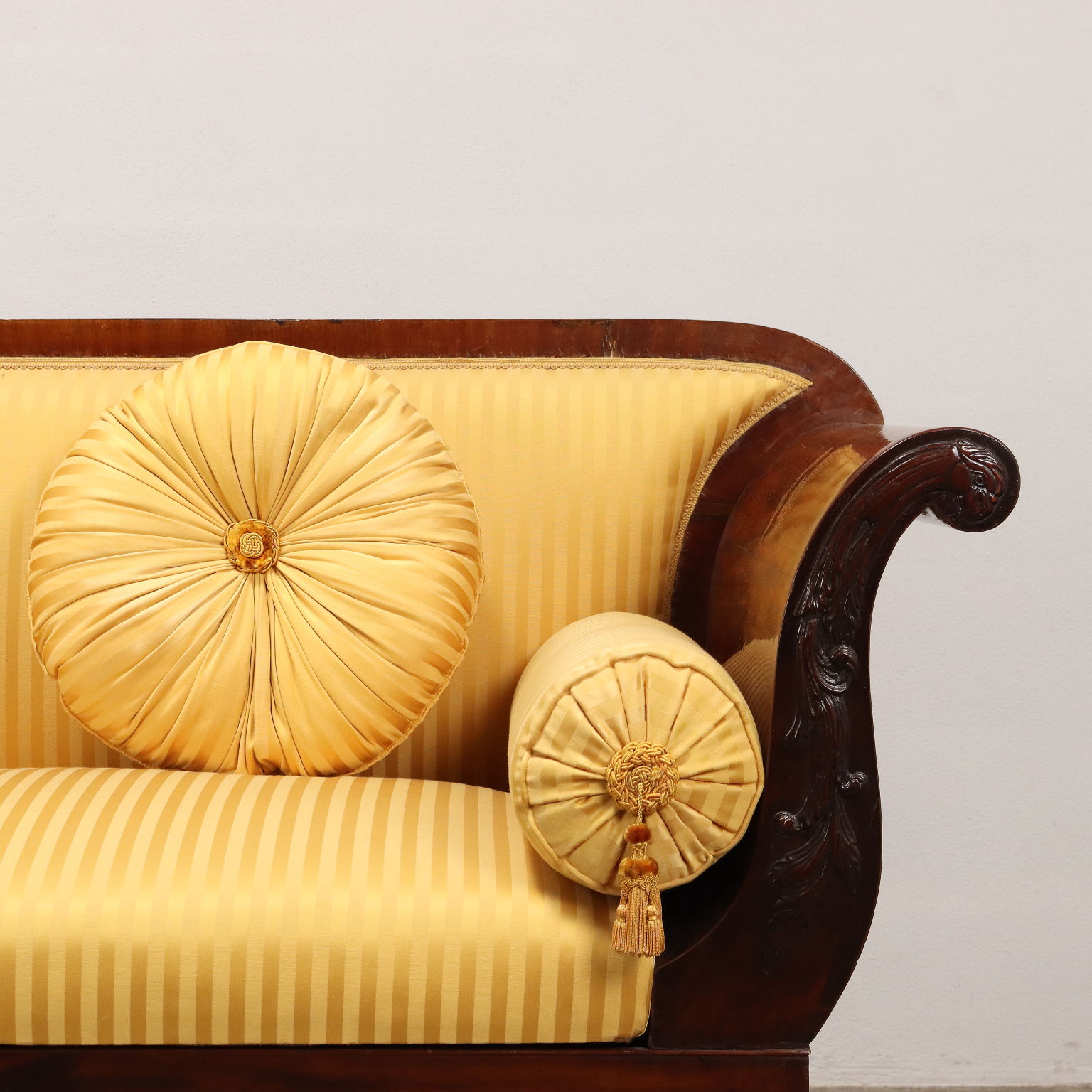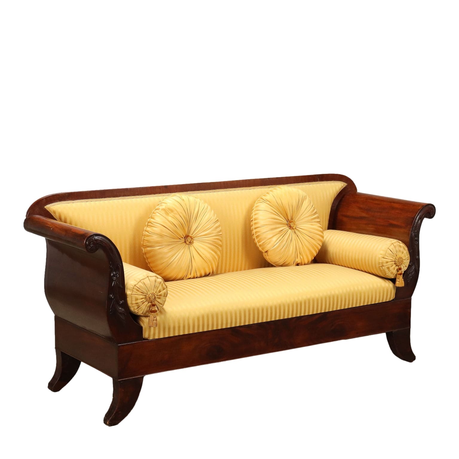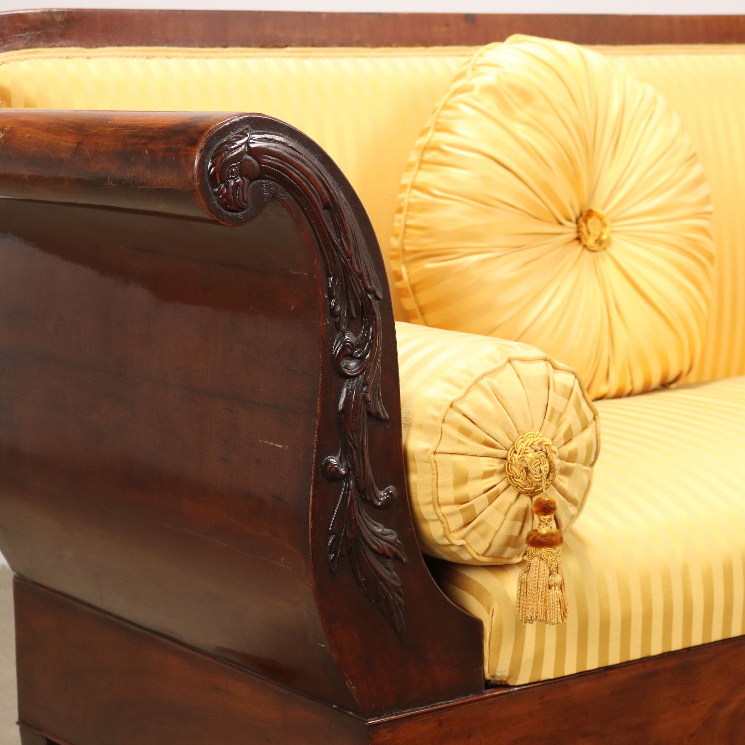 Divano a barca Luigi Filippo in mogano, poggiante su piedi a sciabola, montanti con intagli fogliacei culminanti con testa d'aquila. Seduta e schienale imbottiti, foderati in tessuto rigato. Presenti cuscini abbinati. Italia, metà XIX Secolo.