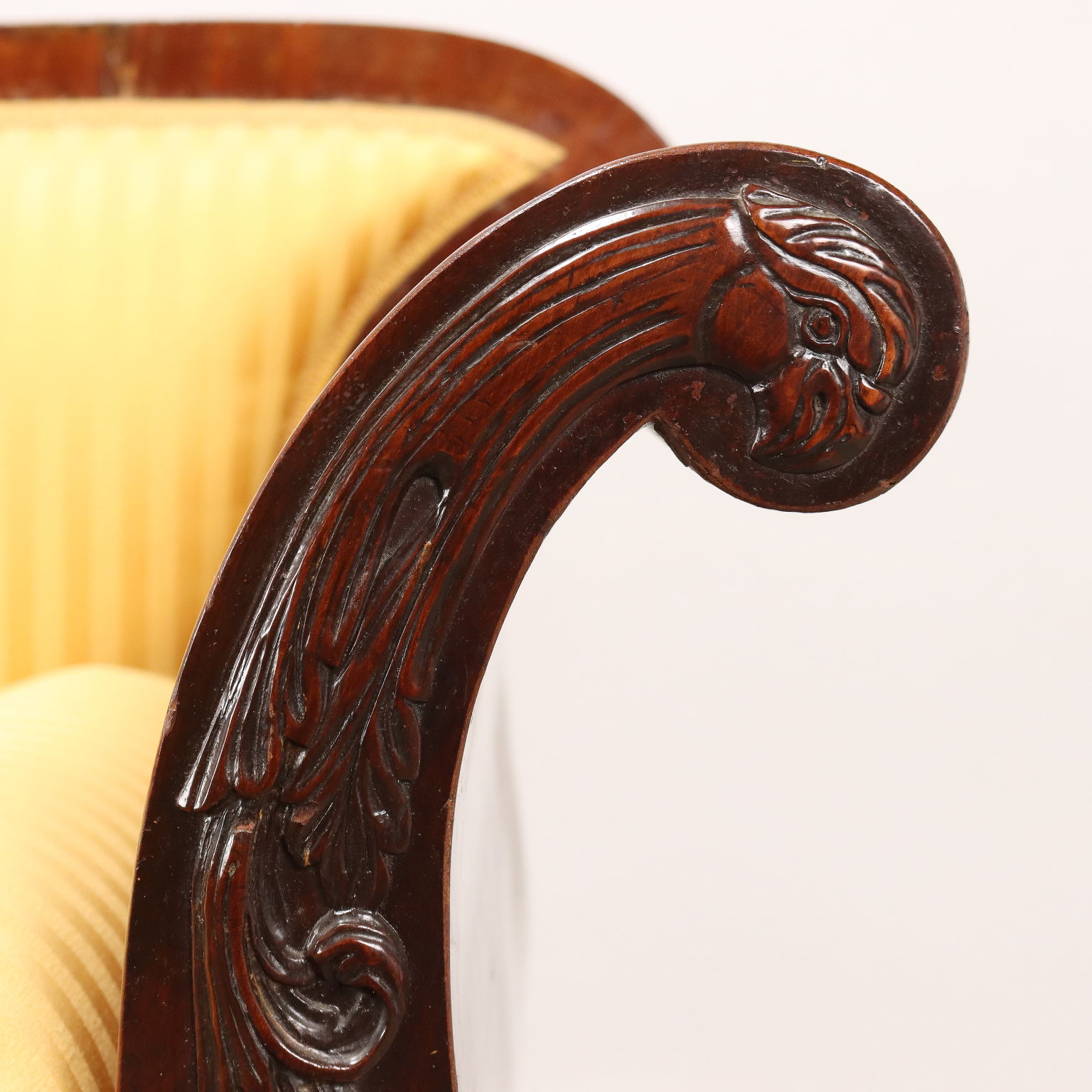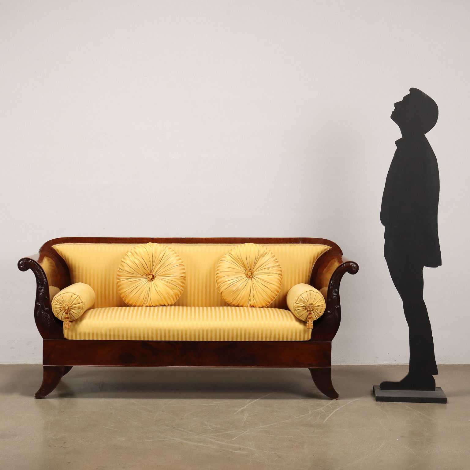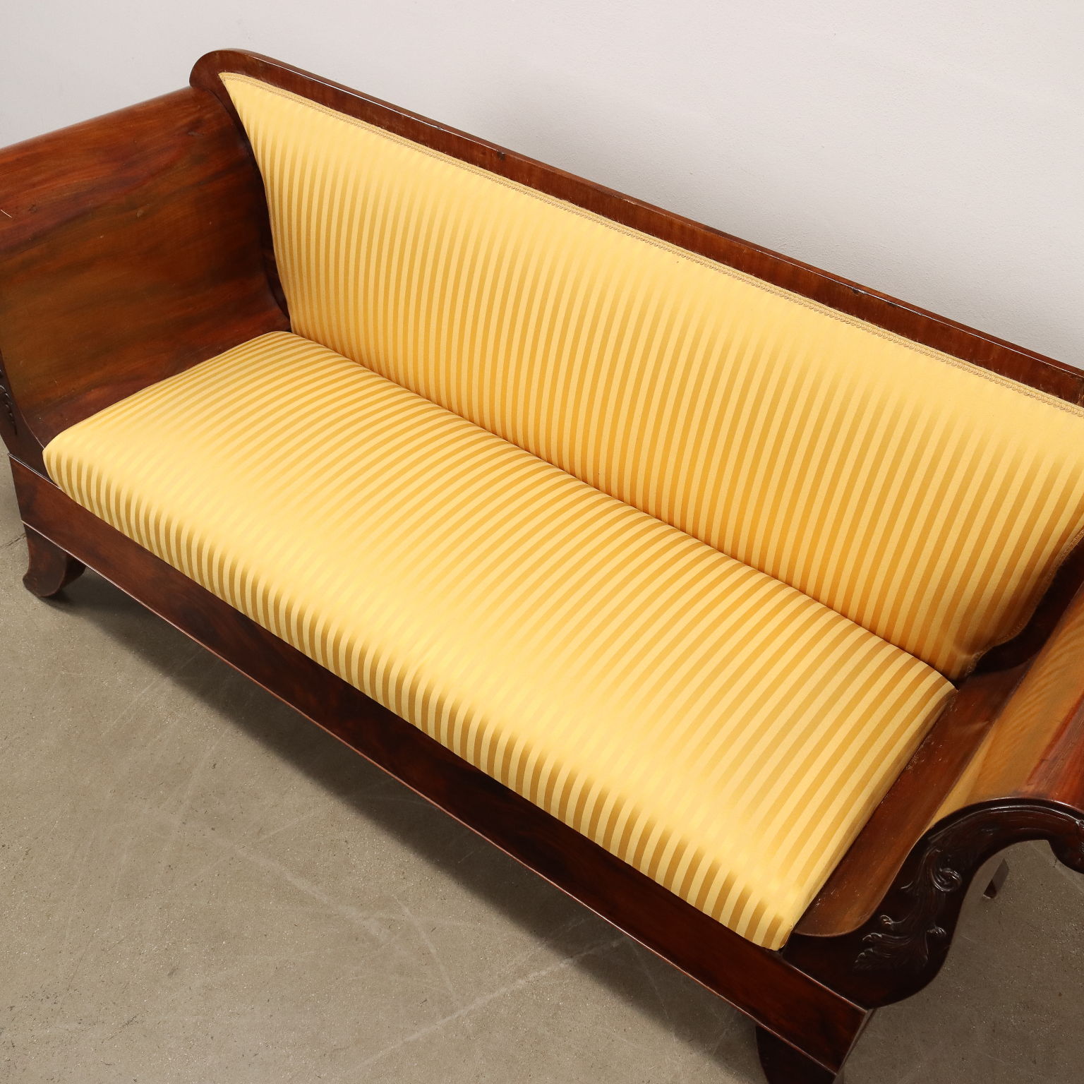 Divano a barca Luigi Filippo in mogano, poggiante su piedi a sciabola, montanti con intagli fogliacei culminanti con testa d'aquila. Seduta e schienale imbottiti, foderati in tessuto rigato. Presenti cuscini abbinati. Italia, metà XIX Secolo.