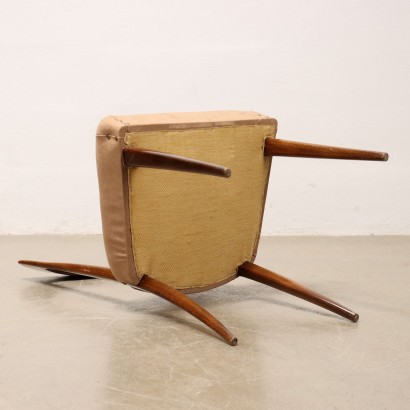 Gruppo di sei sedie vintage di manifattura italiana con struttura in legno, imbottitura a molle e rivestimento originale in tessuto.