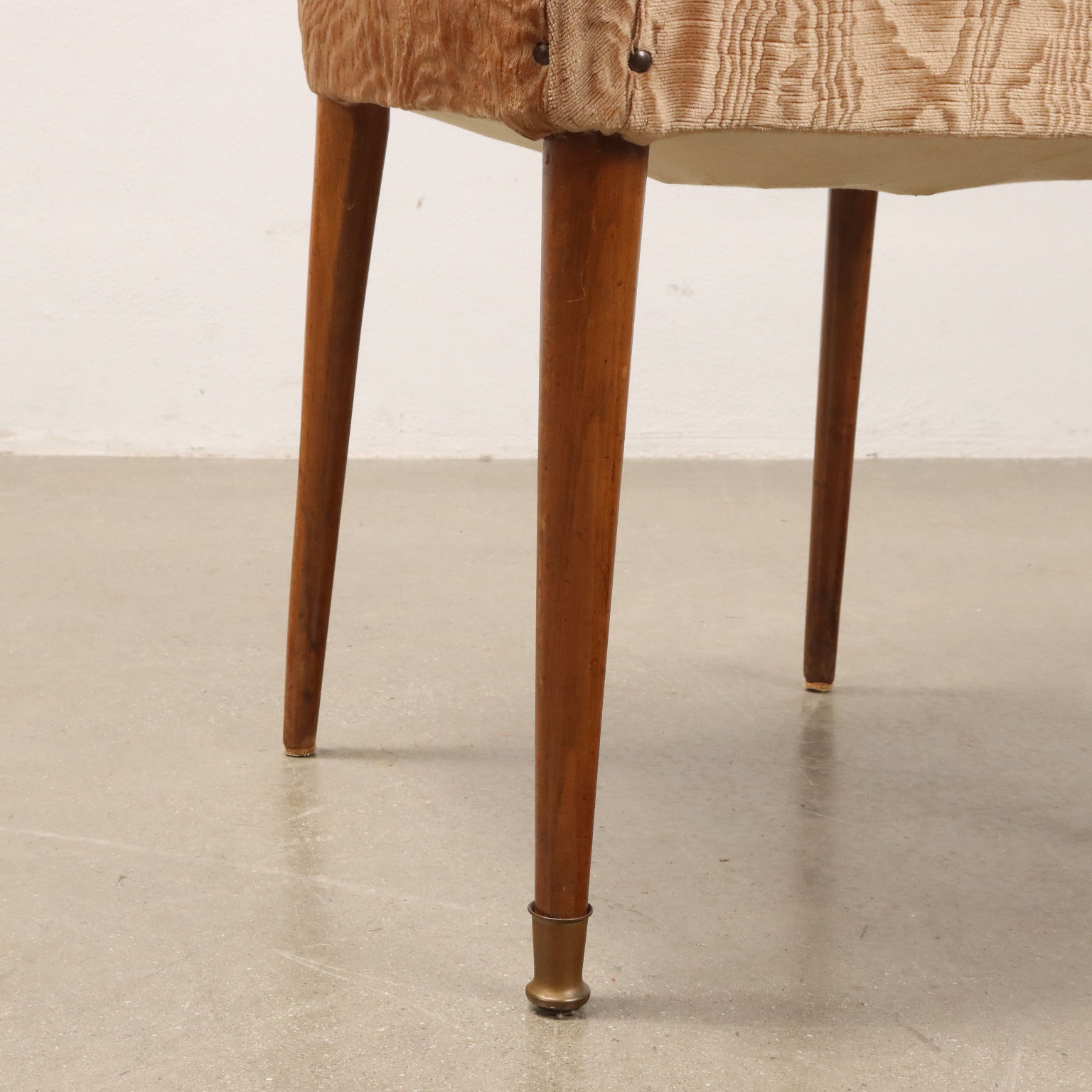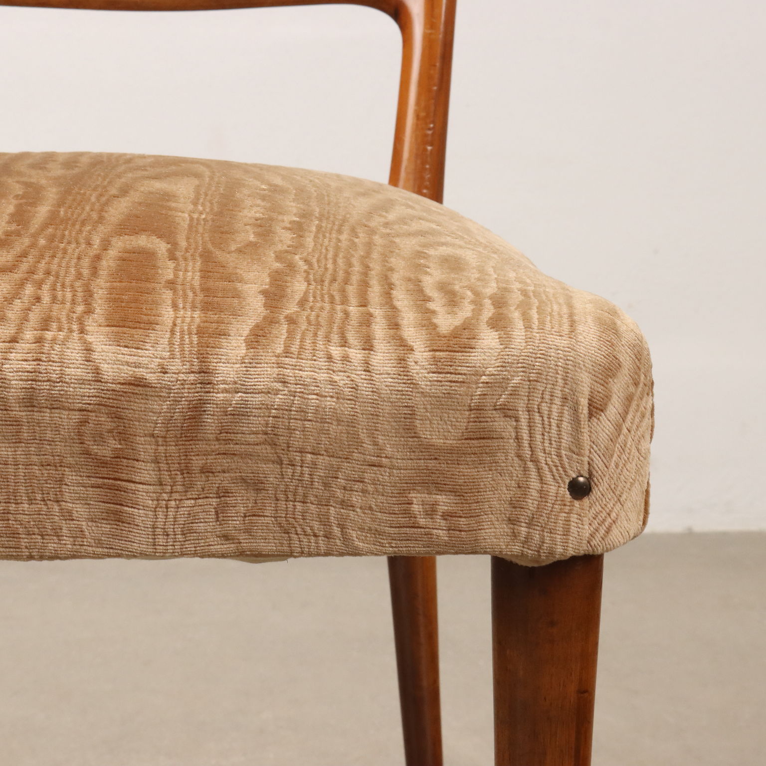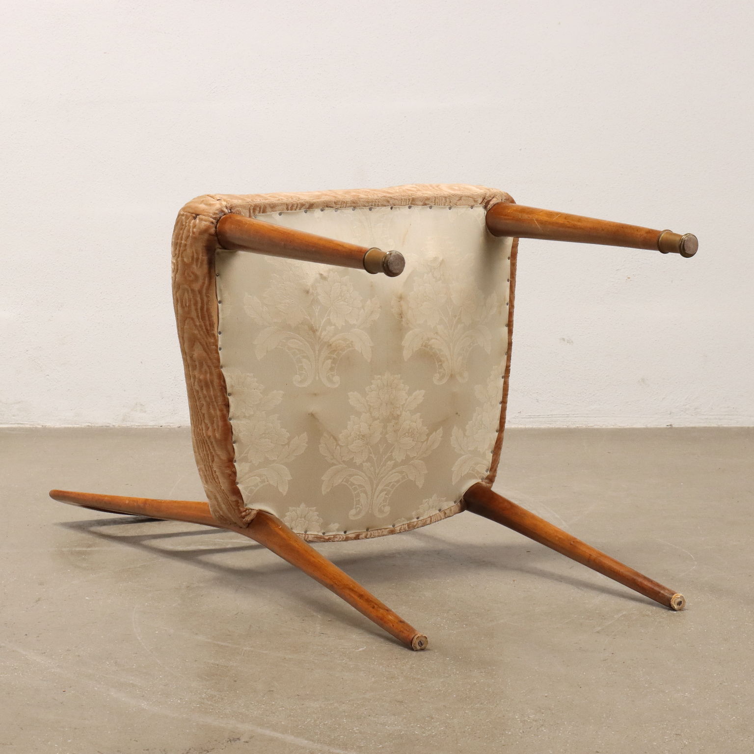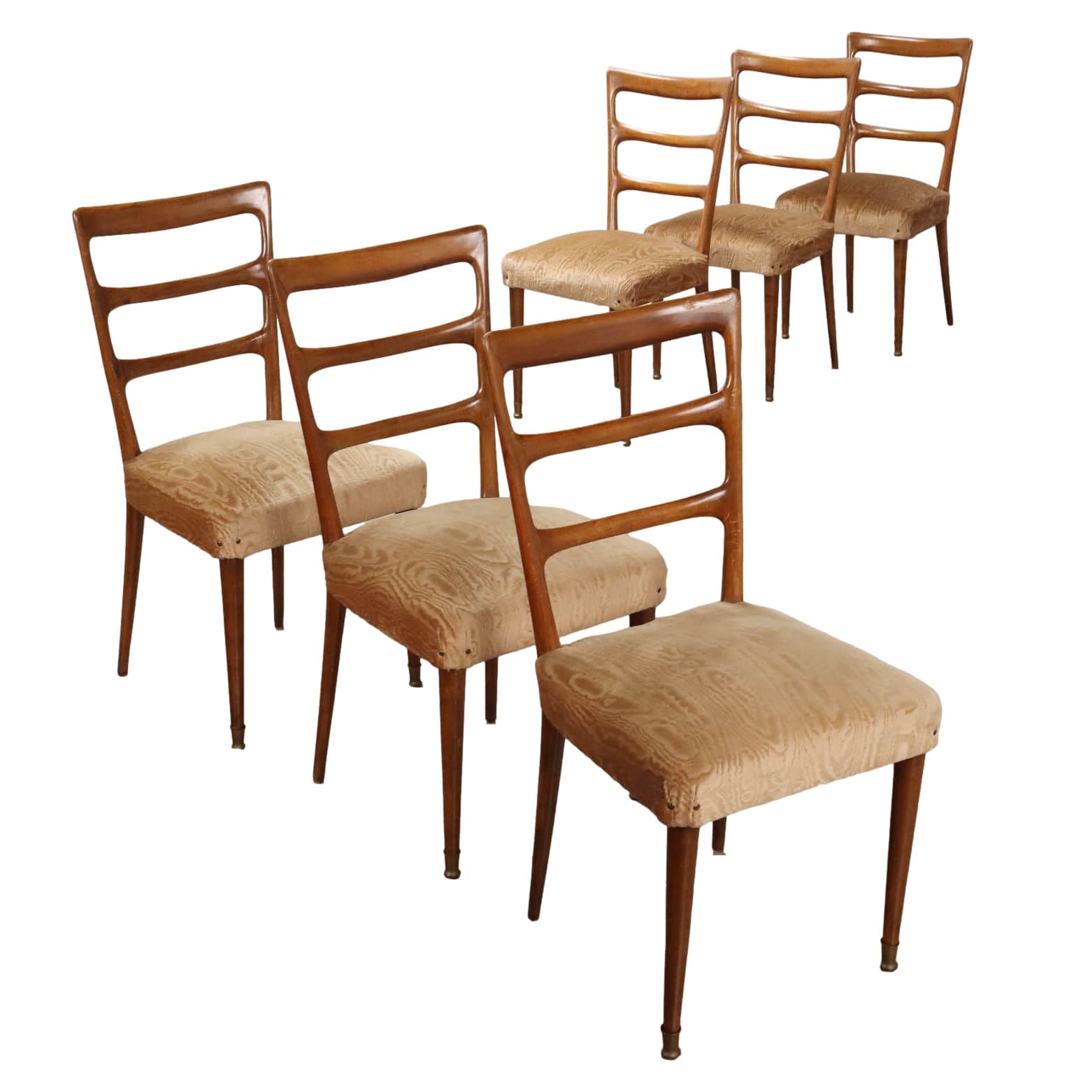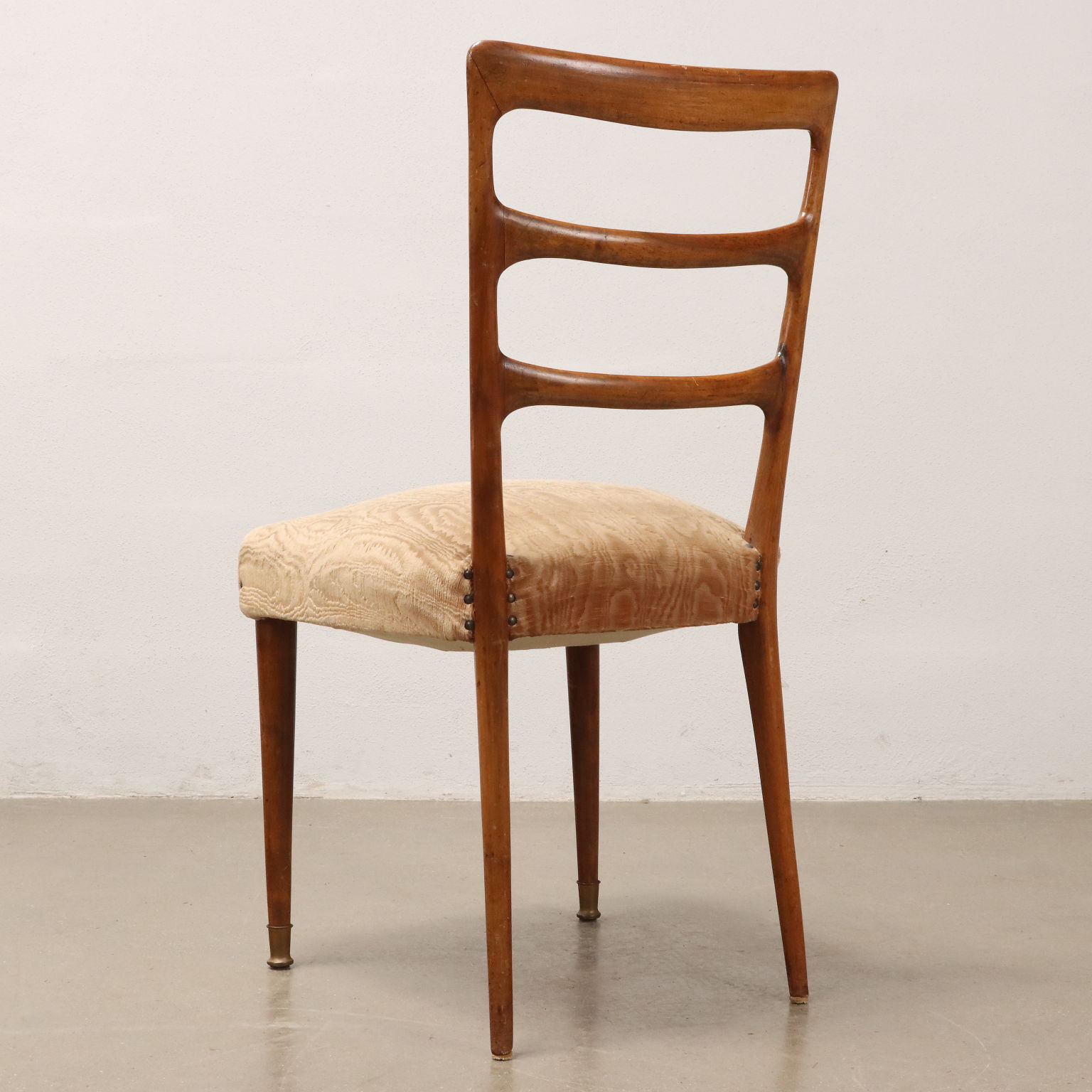 Gruppo di sedie vintage di manifattura italiana con struttura in legno di faggio, imbottitura a molle e rivestimento originale in tessuto; piedini con scarpetta in ottone.