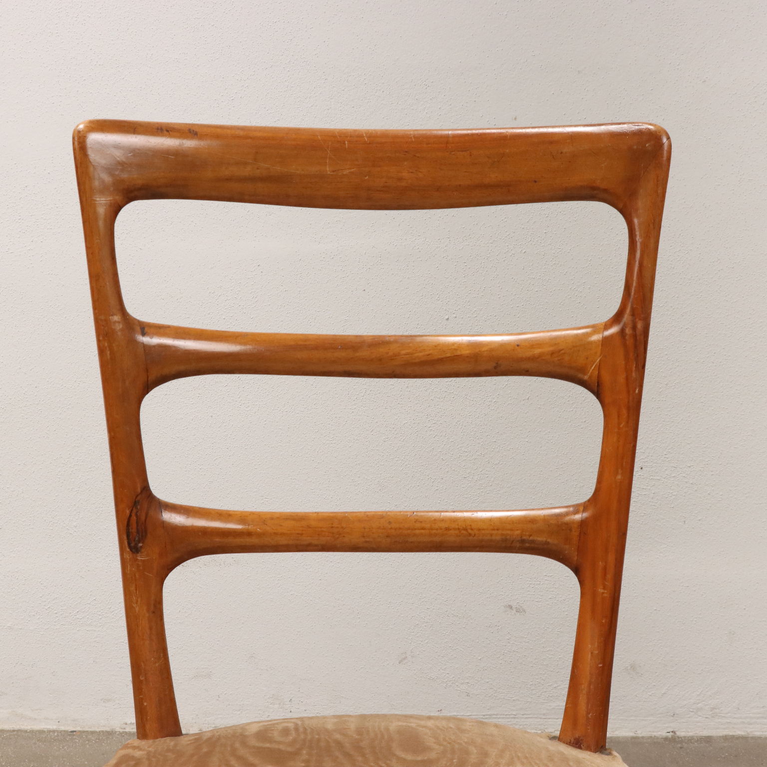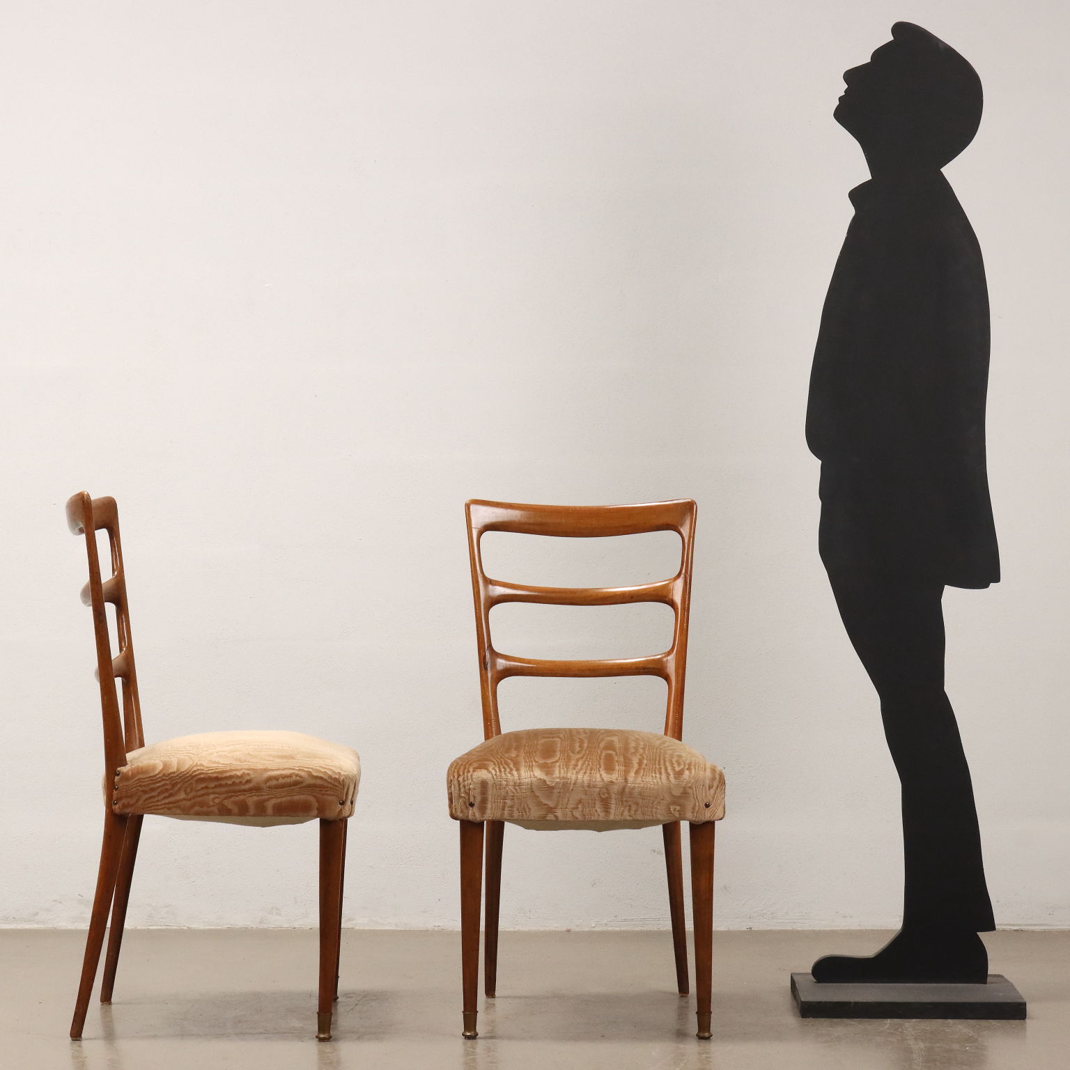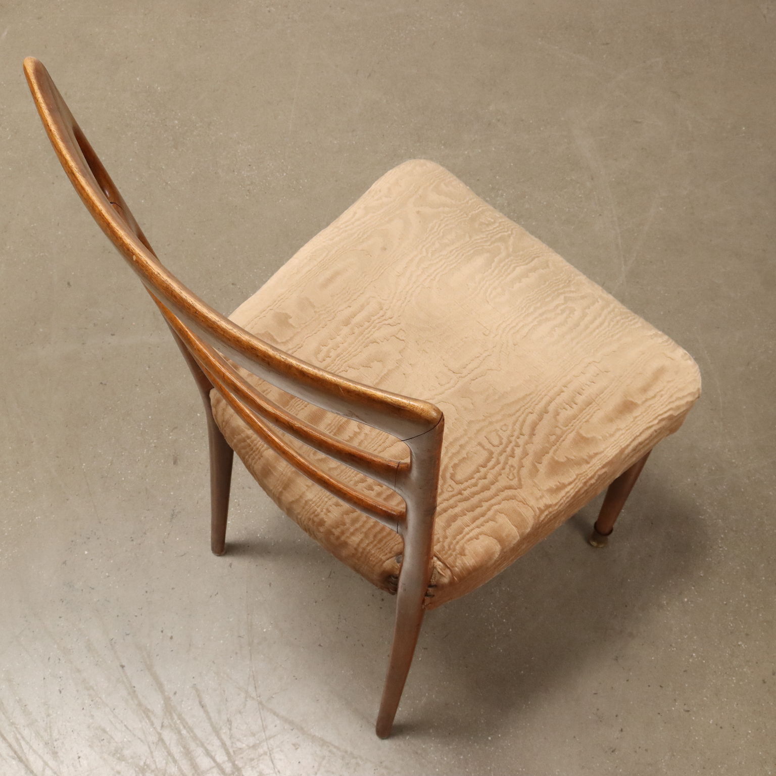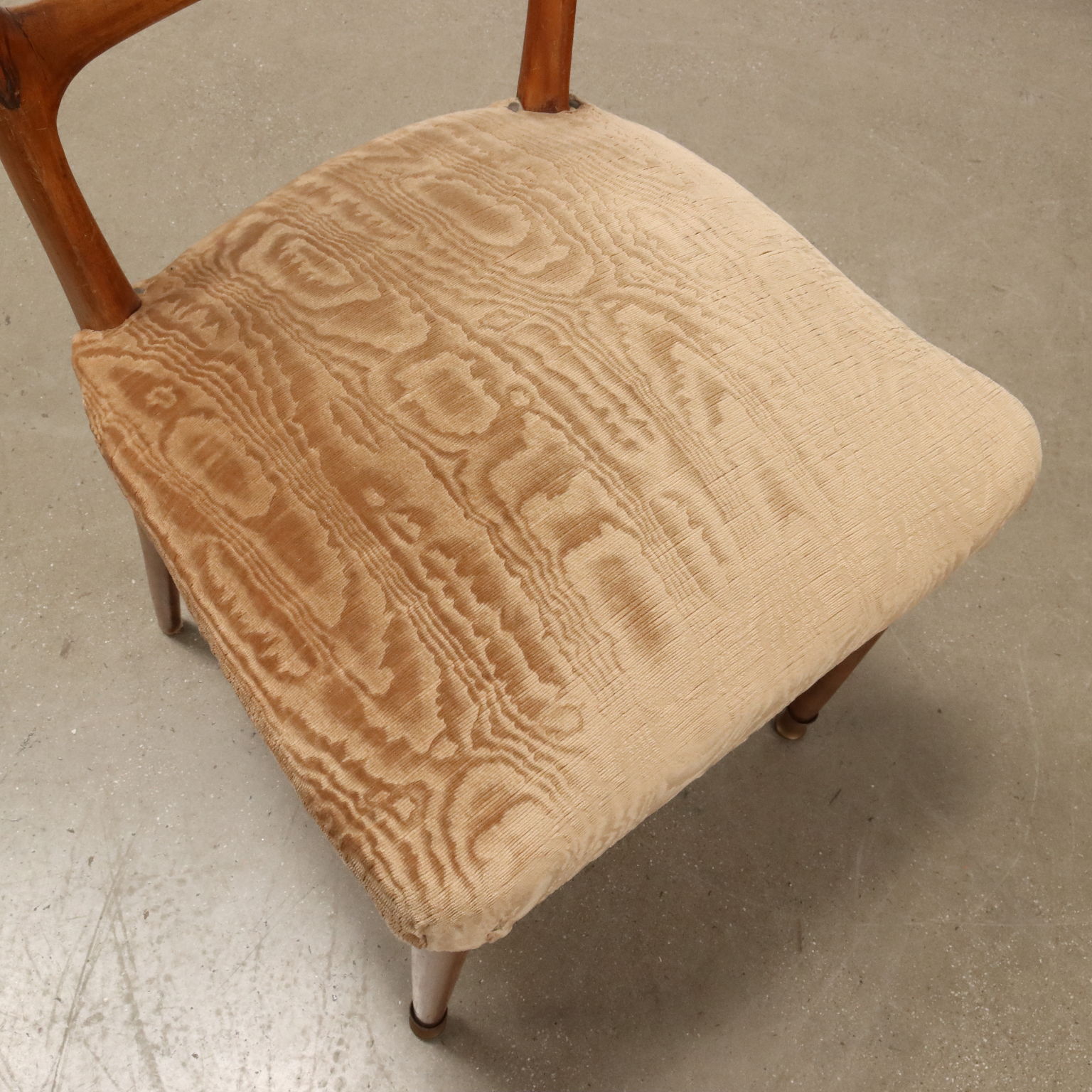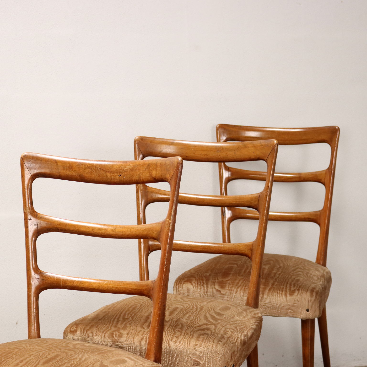 Gruppo di sedie vintage di manifattura italiana con struttura in legno di faggio, imbottitura a molle e rivestimento originale in tessuto; piedini con scarpetta in ottone.