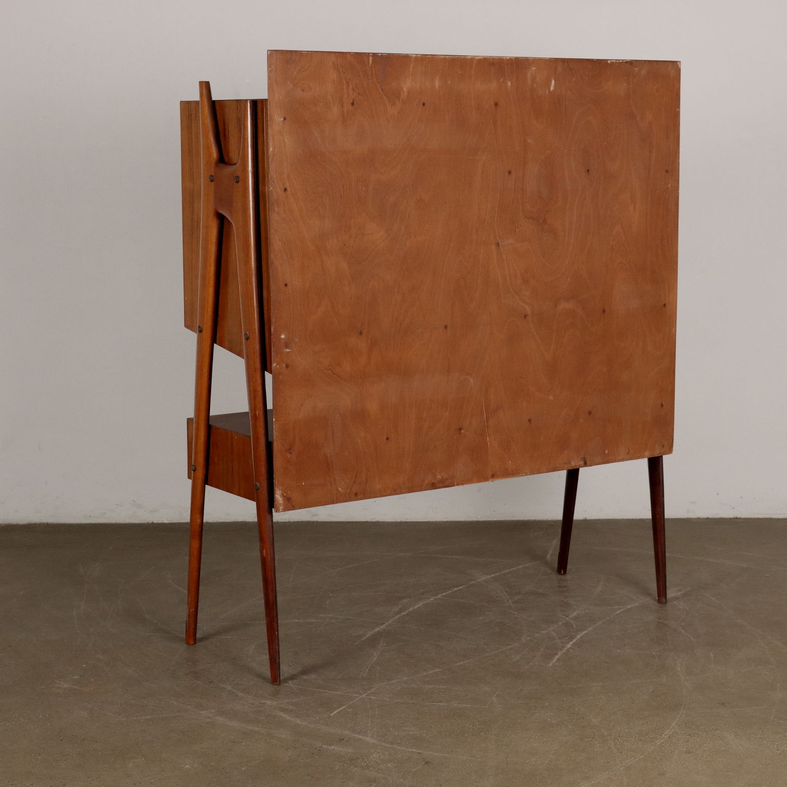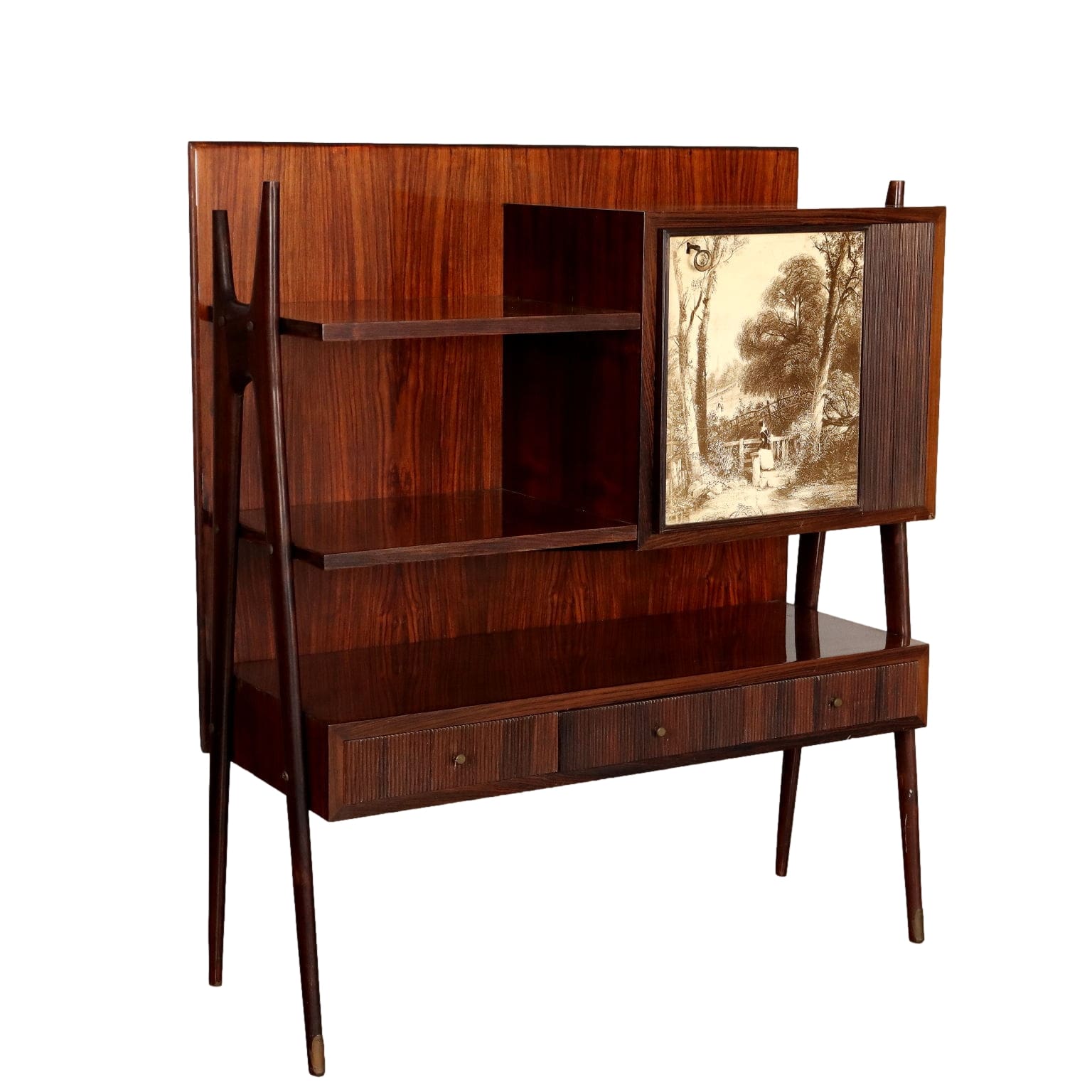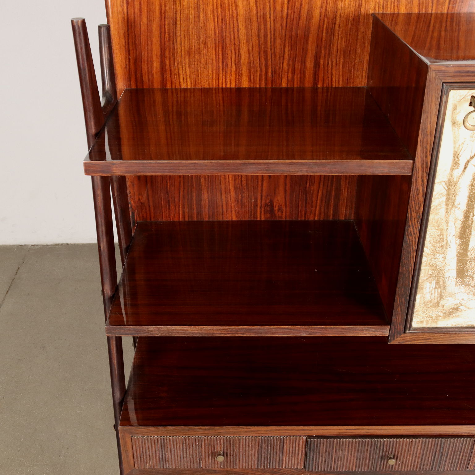 Elegante arredo vintage di manifattura italiana in legno impiallacciato legno esotico con mensole, vano con anta battente e specchi interni e tre cassetti con fronte 'grissinato'. Maniglie e piedini in ottone. Discrete condizioni