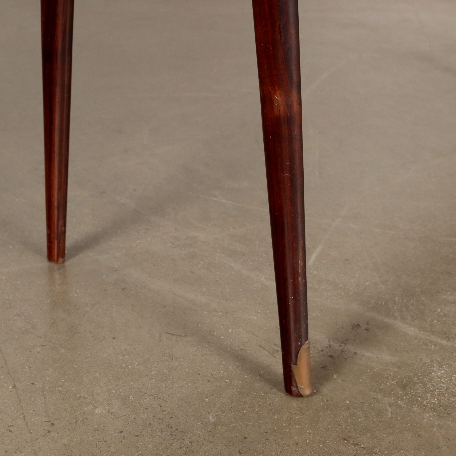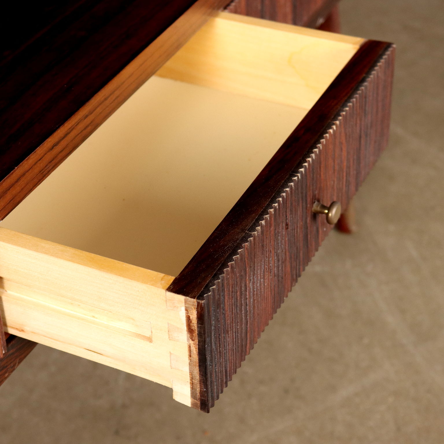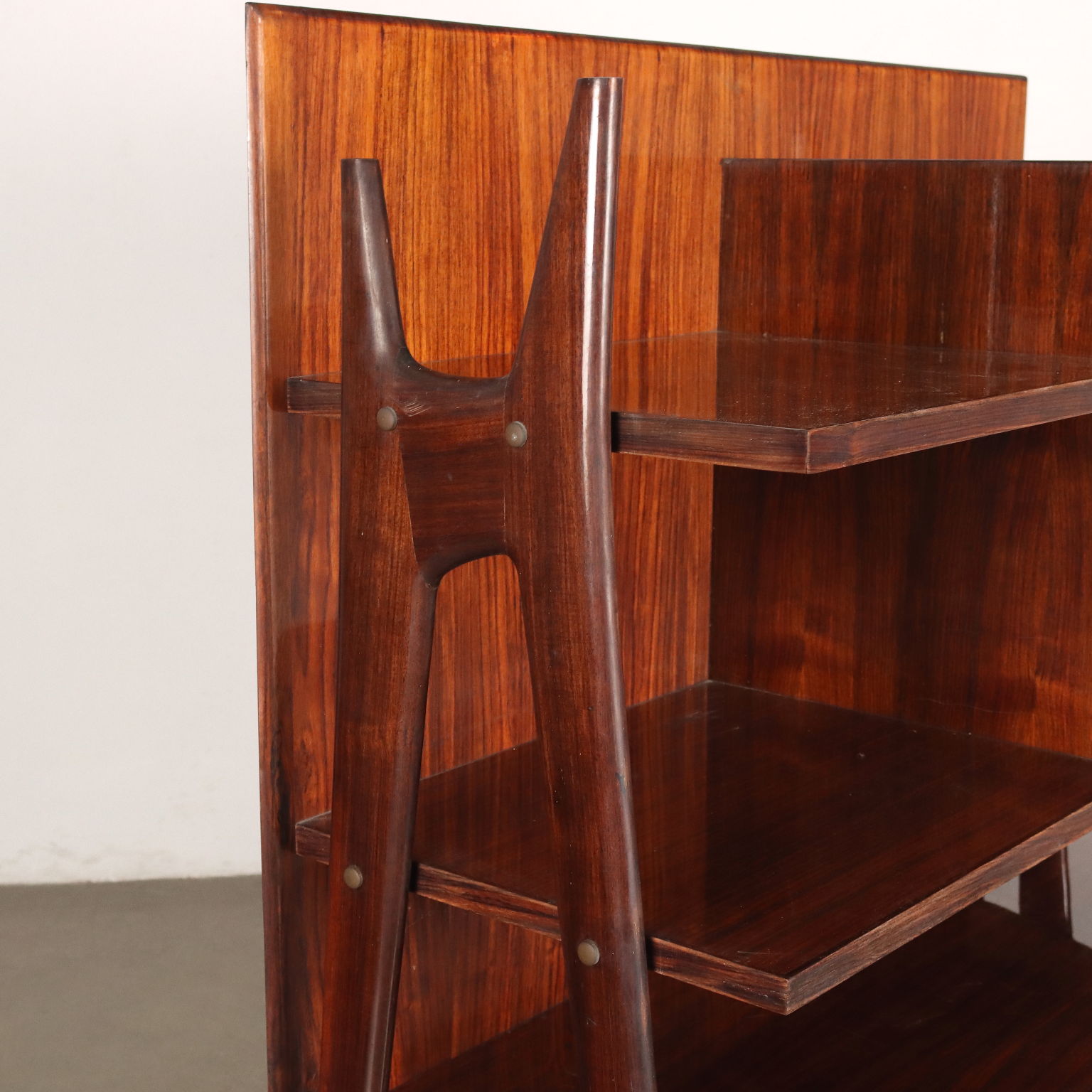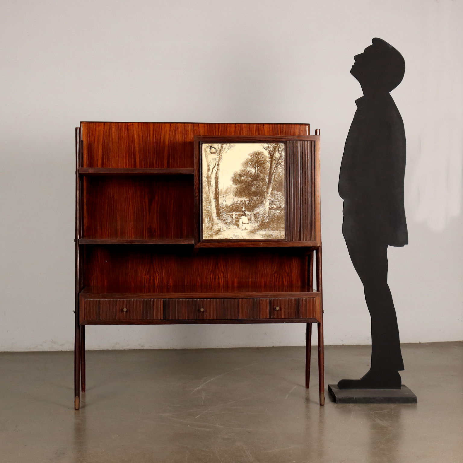 Elegante arredo vintage di manifattura italiana in legno impiallacciato legno esotico con mensole, vano con anta battente e specchi interni e tre cassetti con fronte 'grissinato'. Maniglie e piedini in ottone. Discrete condizioni