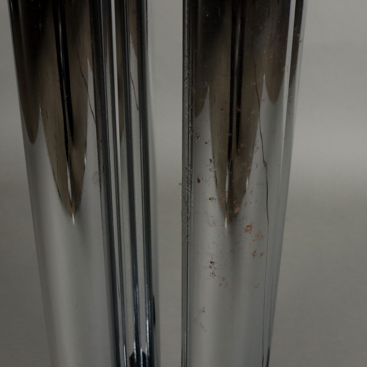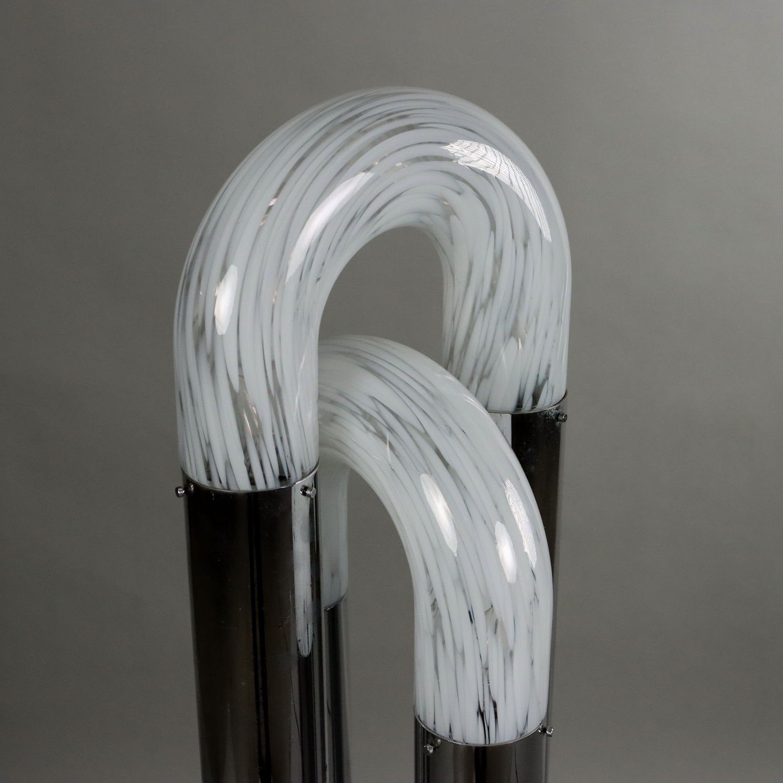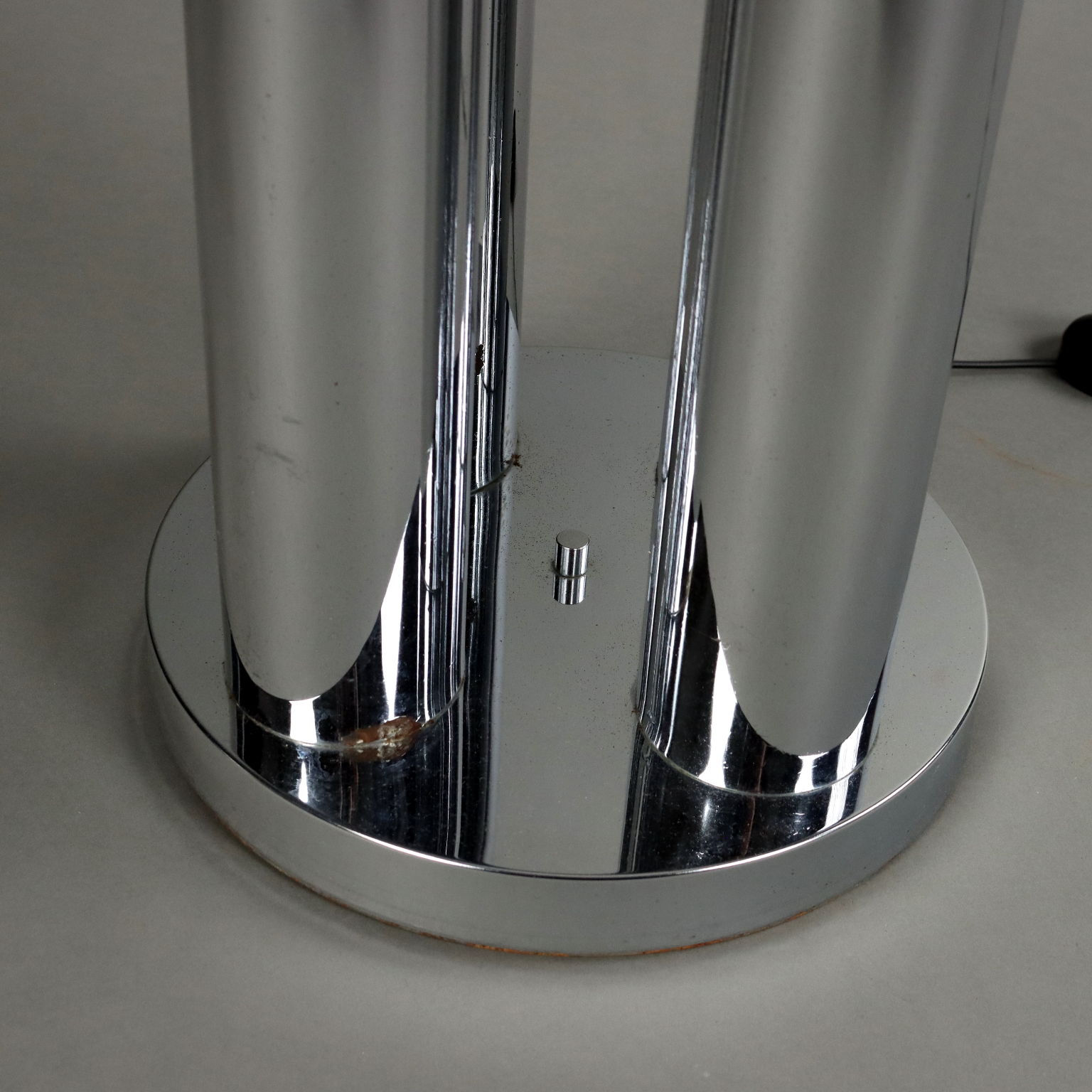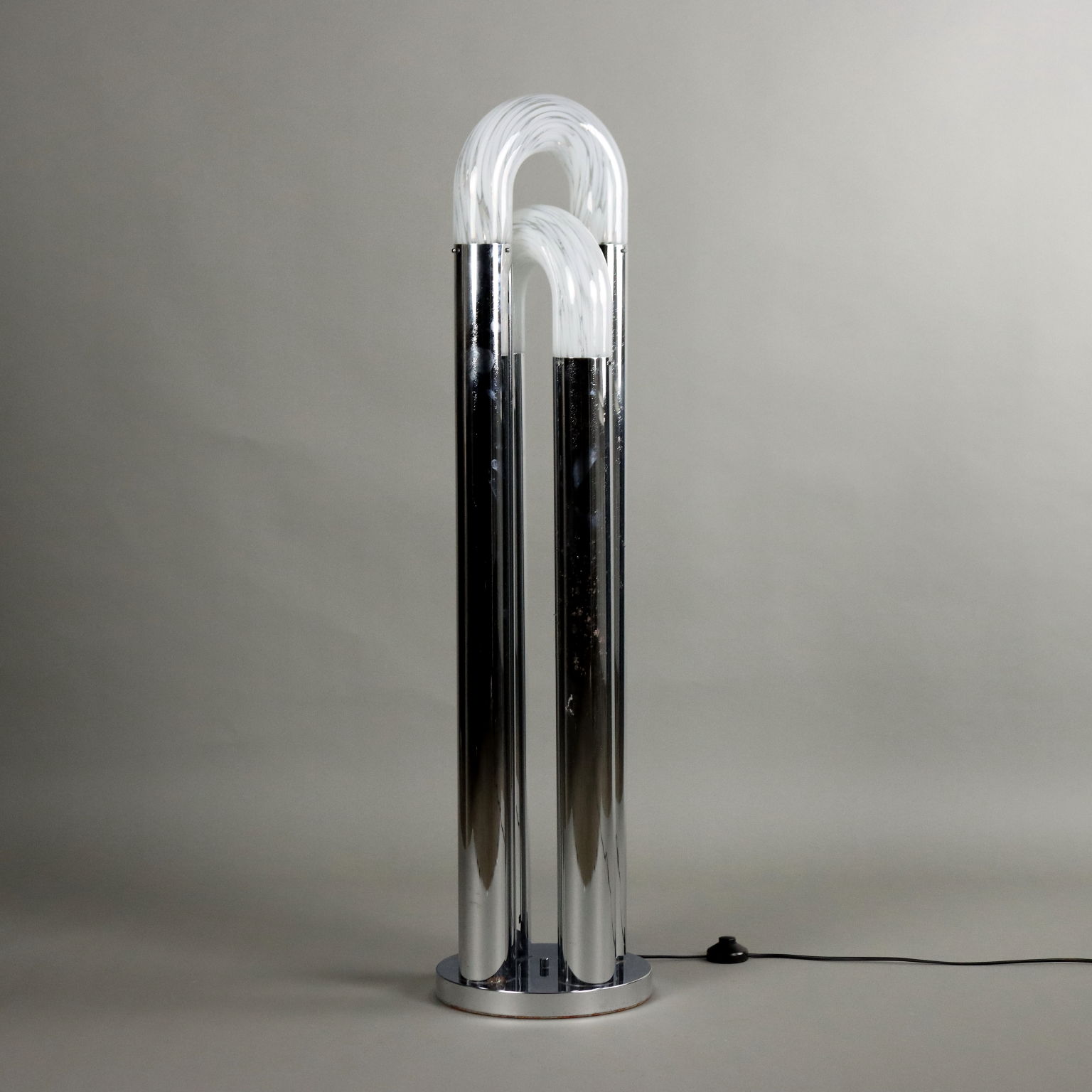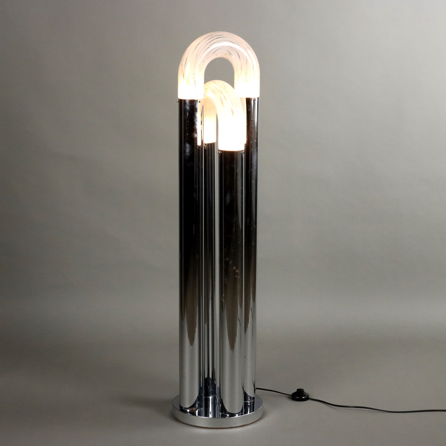 Lampada da terra vintage tipo space-ace nello stile di Carlo Nason con struttura in metallo cromato e doppia illuminazione racchiusa in vetri curvati e lavorati. In buone condizioni generali, presenta qualche imperfezione nella parte cromata visibile in foto.
