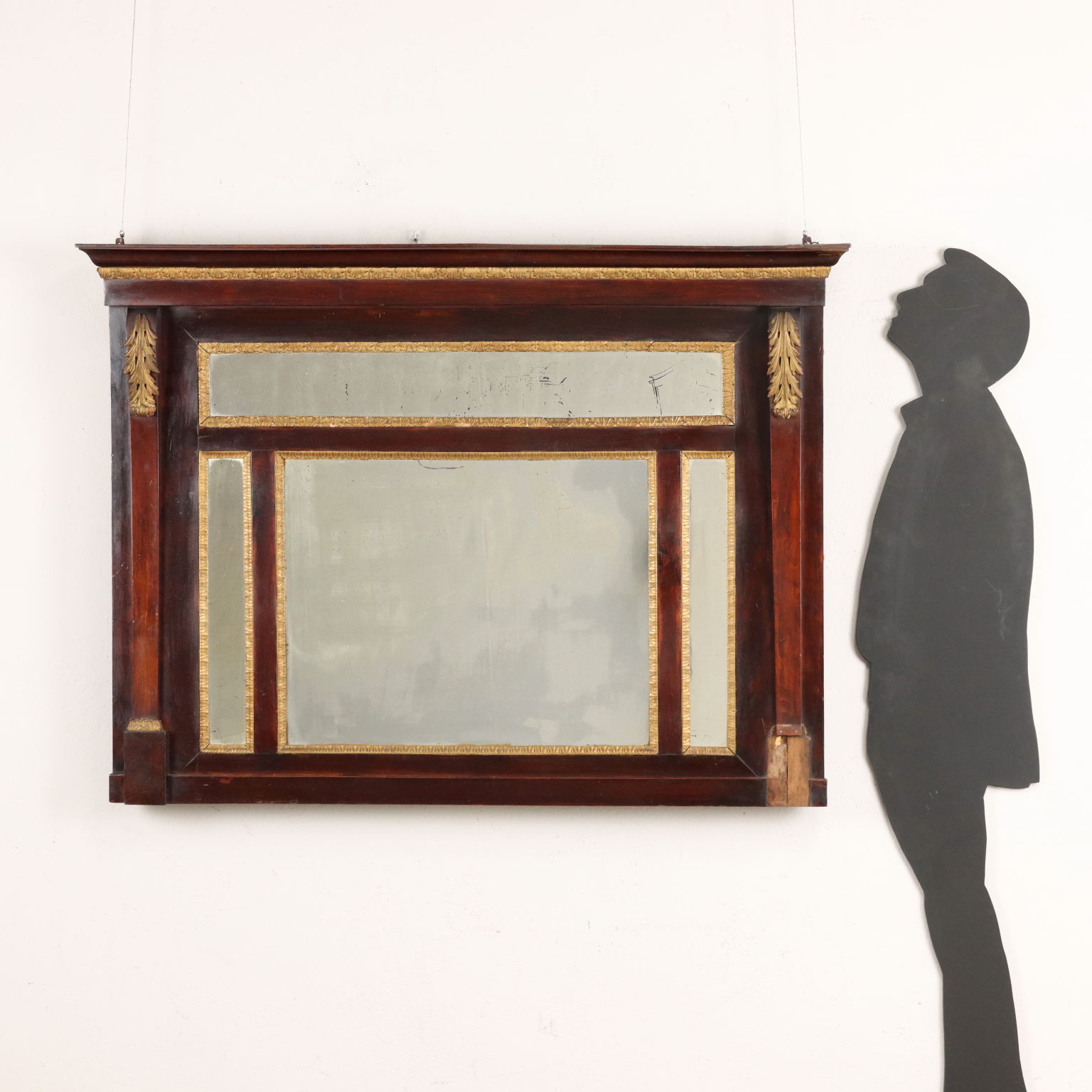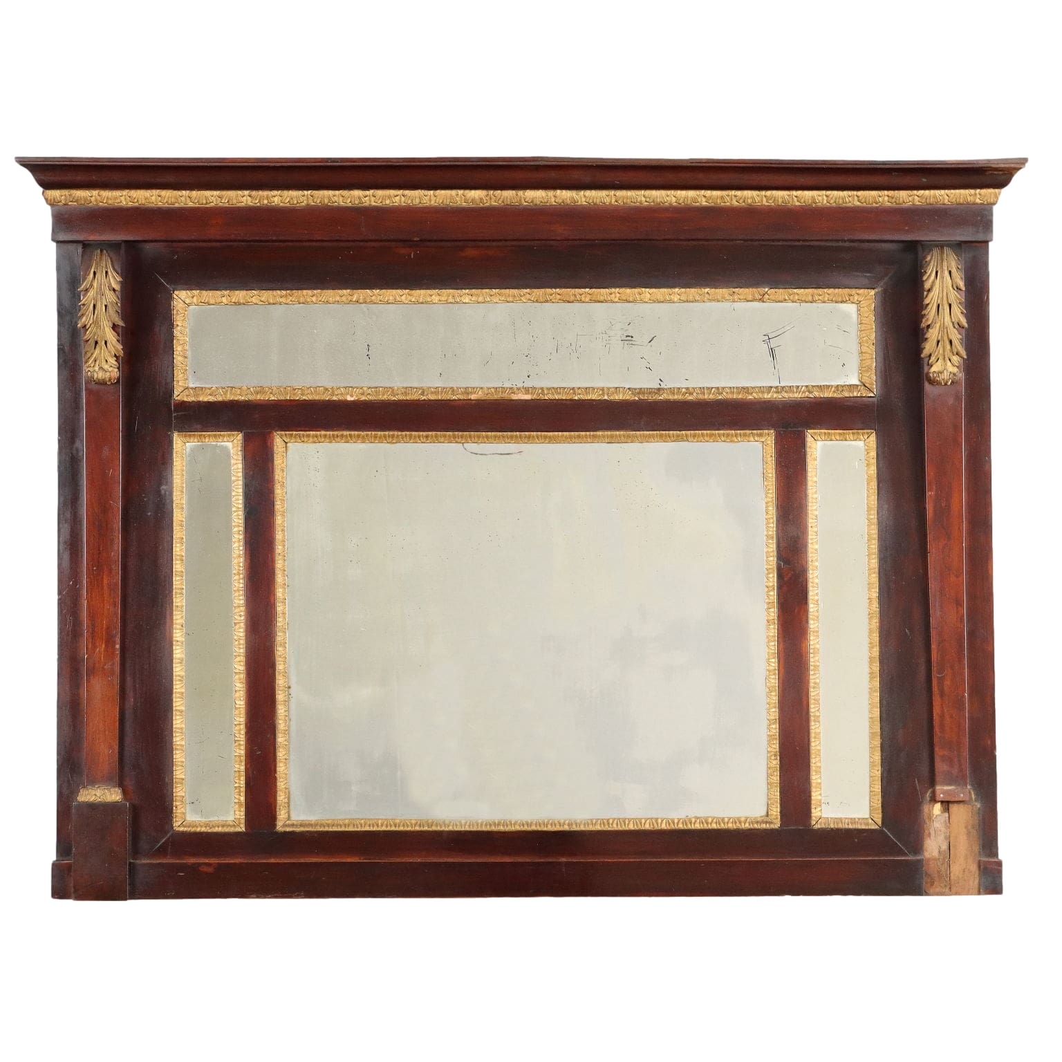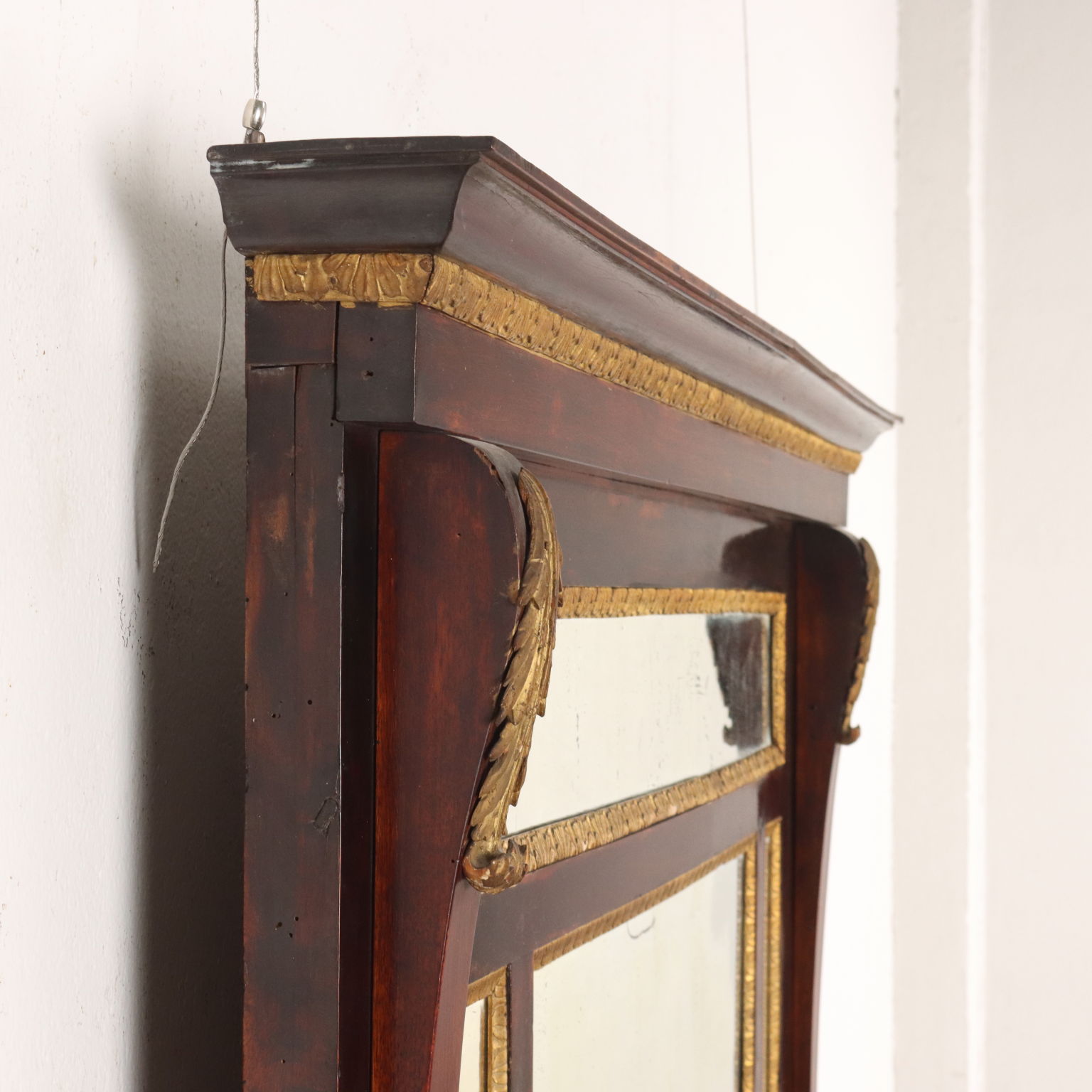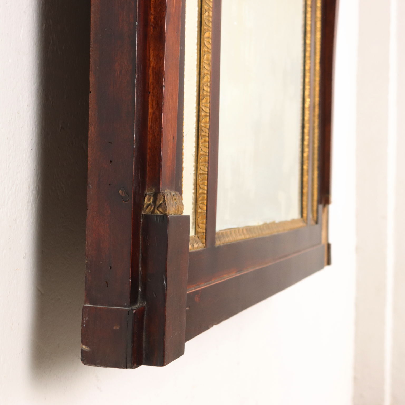 Caminiera restaurazione in mogano, presenta specchio centrale, coppia di specchi dal formato verticale laterali e uno nella fascia superiore; sono posti entro cornicette intagliate a foglioline susseguenti e dorate. Coppia di lesene mosse (una mancante del plinto) e ornate con motivi fogliacei dorati inquadrano la composizione di specchi e sostengono la fascia superiore.