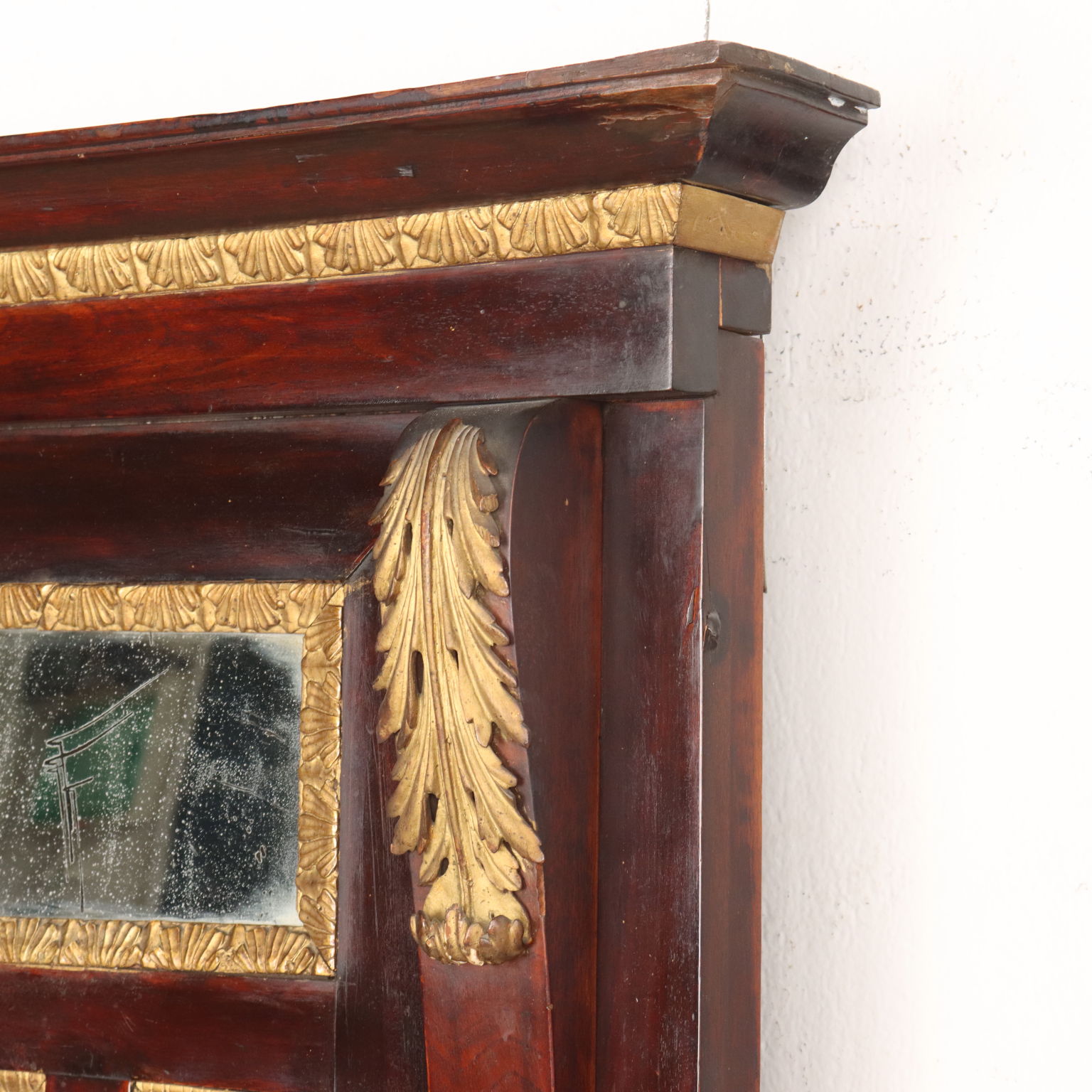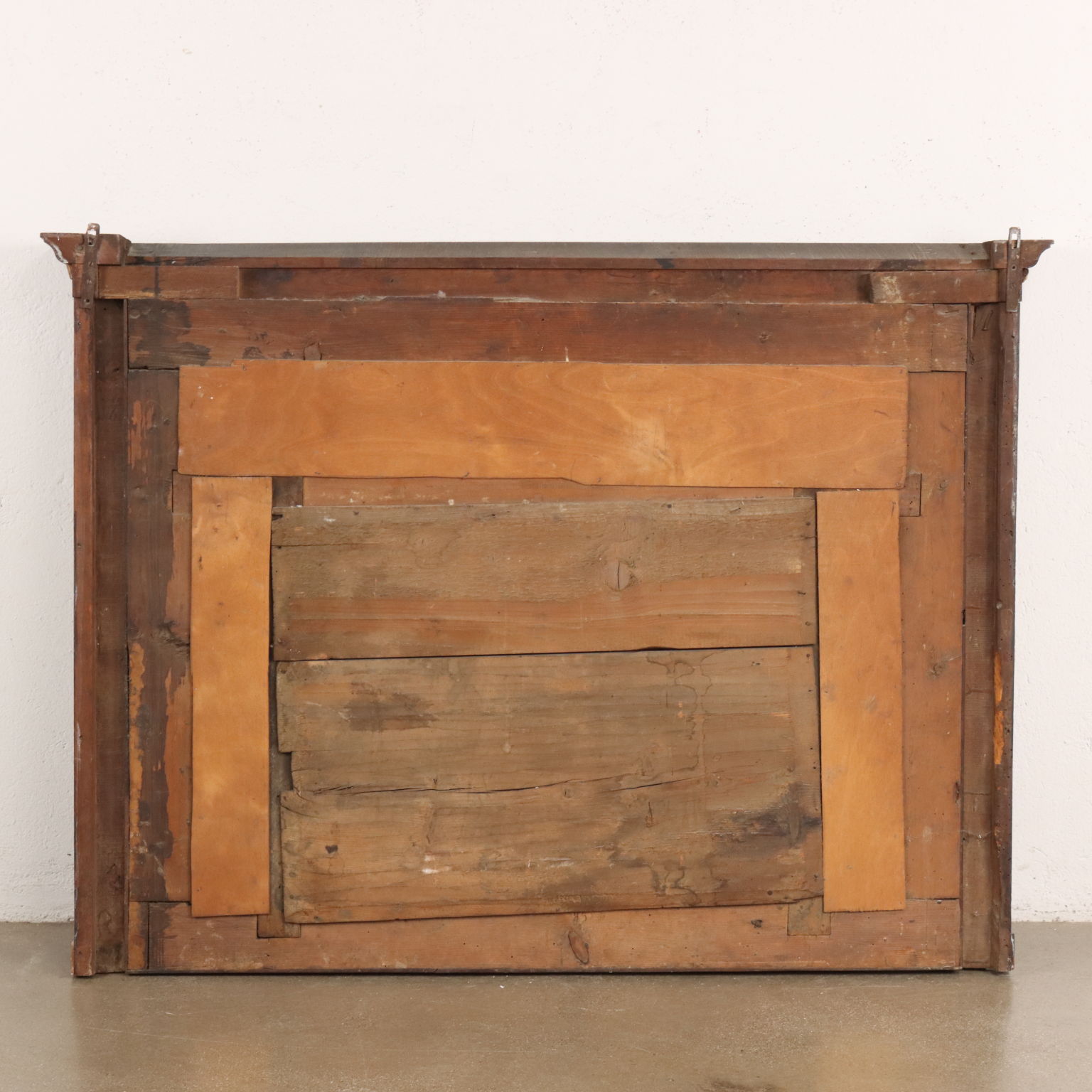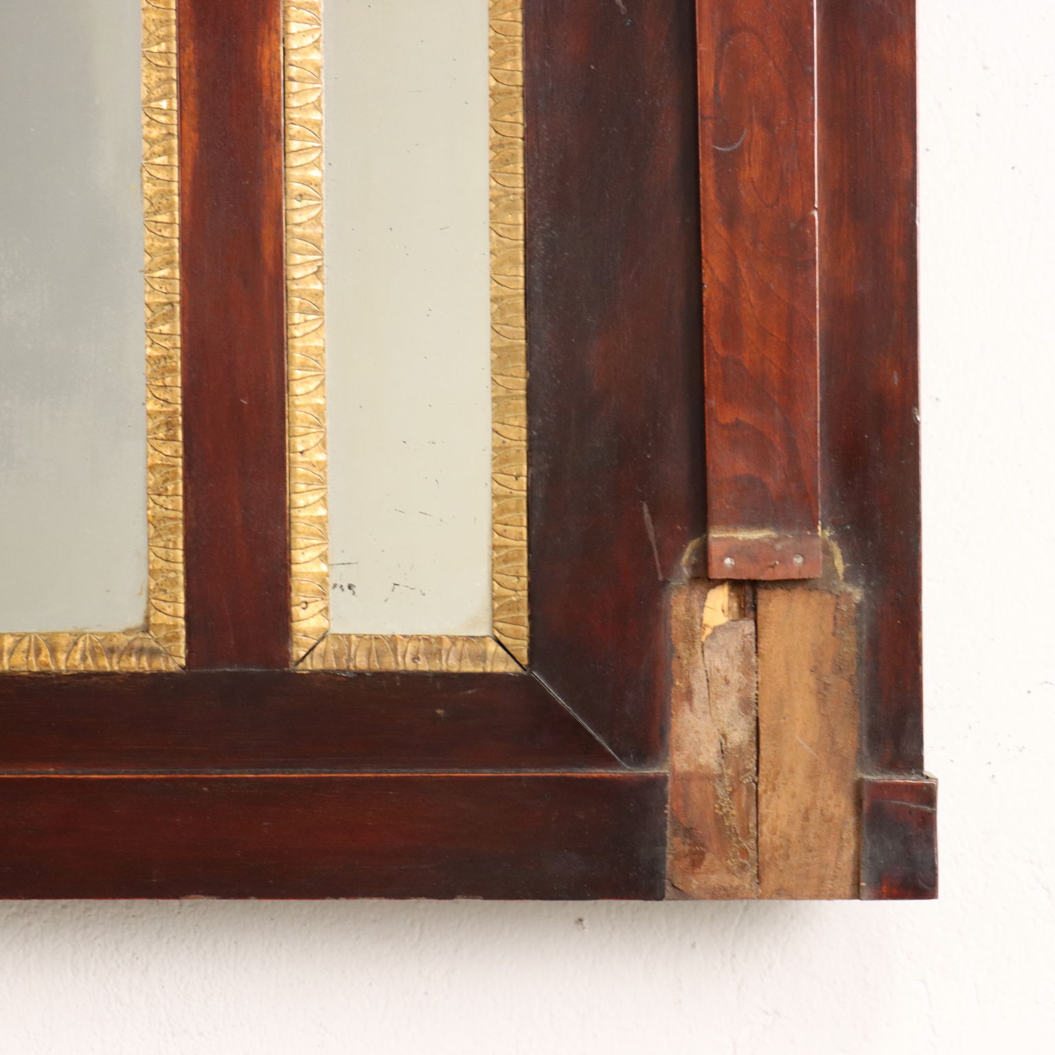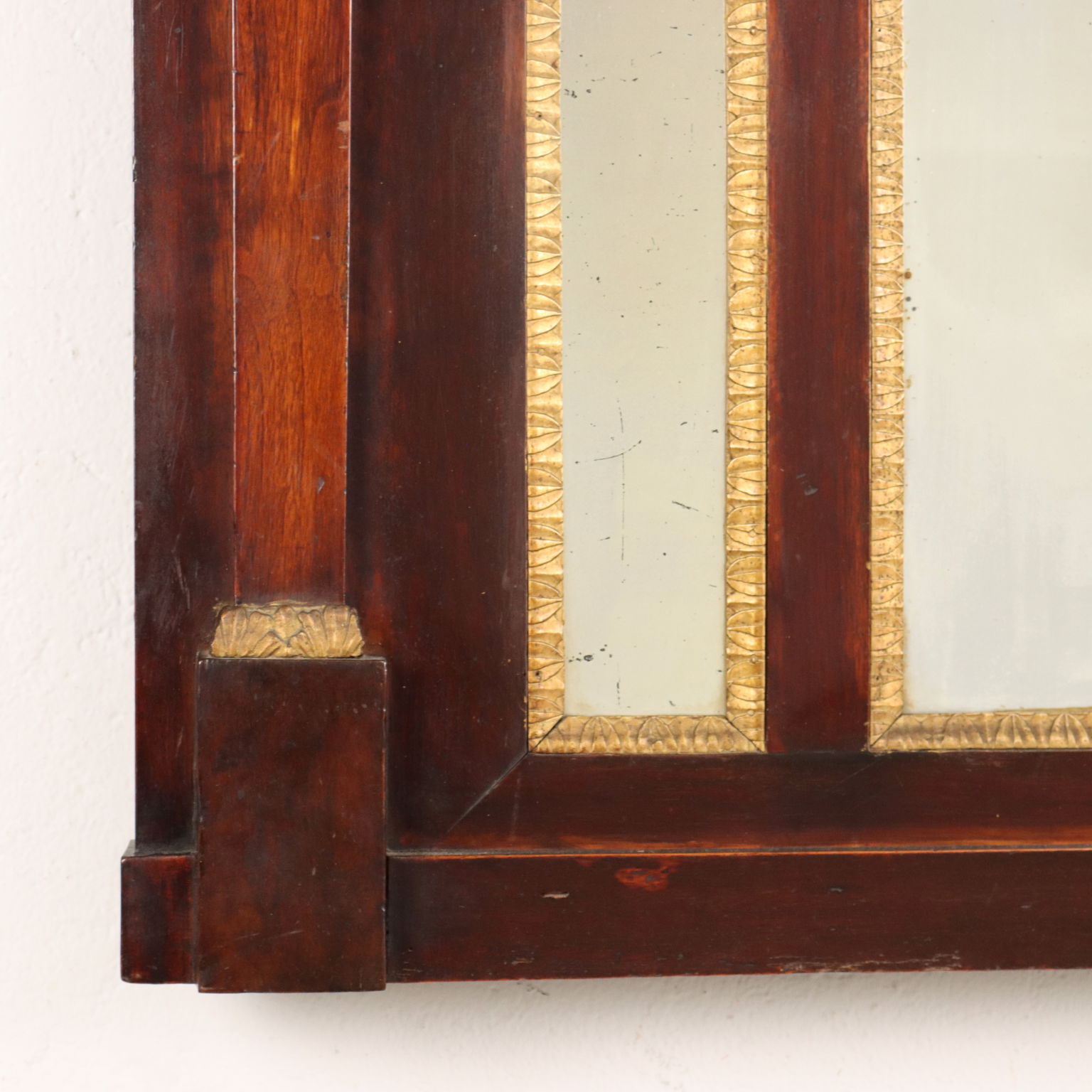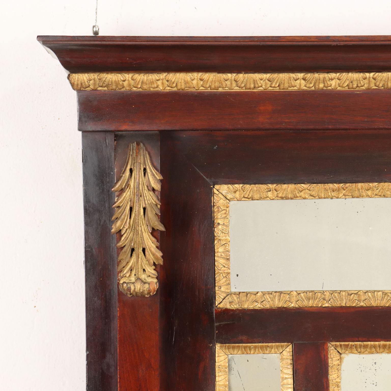 Caminiera restaurazione in mogano, presenta specchio centrale, coppia di specchi dal formato verticale laterali e uno nella fascia superiore; sono posti entro cornicette intagliate a foglioline susseguenti e dorate. Coppia di lesene mosse (una mancante del plinto) e ornate con motivi fogliacei dorati inquadrano la composizione di specchi e sostengono la fascia superiore.