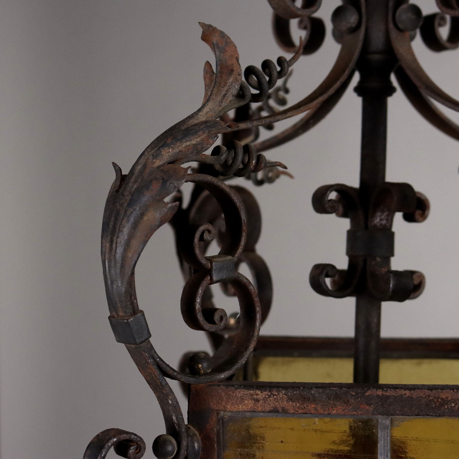 Lanterna liberty a luce centrale, Italia fine XIX-inizio XX secolo. Realizzata in ferro battuto e vetro piombato colorato. Decorata da elementi fogliacei in lamierino e riccioli.
