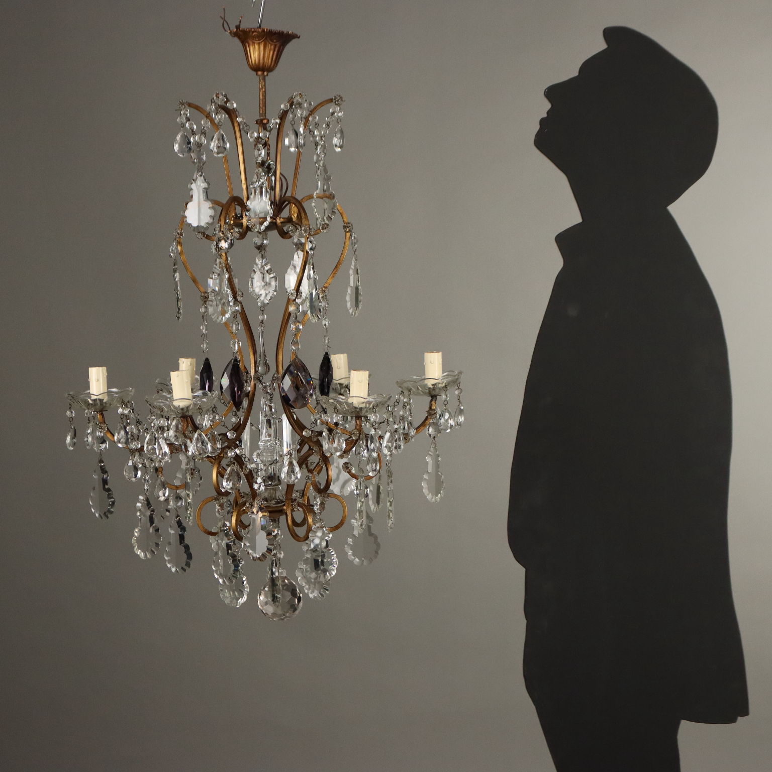 Lampadario in ferro dorato, 6 luci, ornato con bobèches e pendenti in vetro trasparente e color ametista. Italia, inizio XX Secolo.