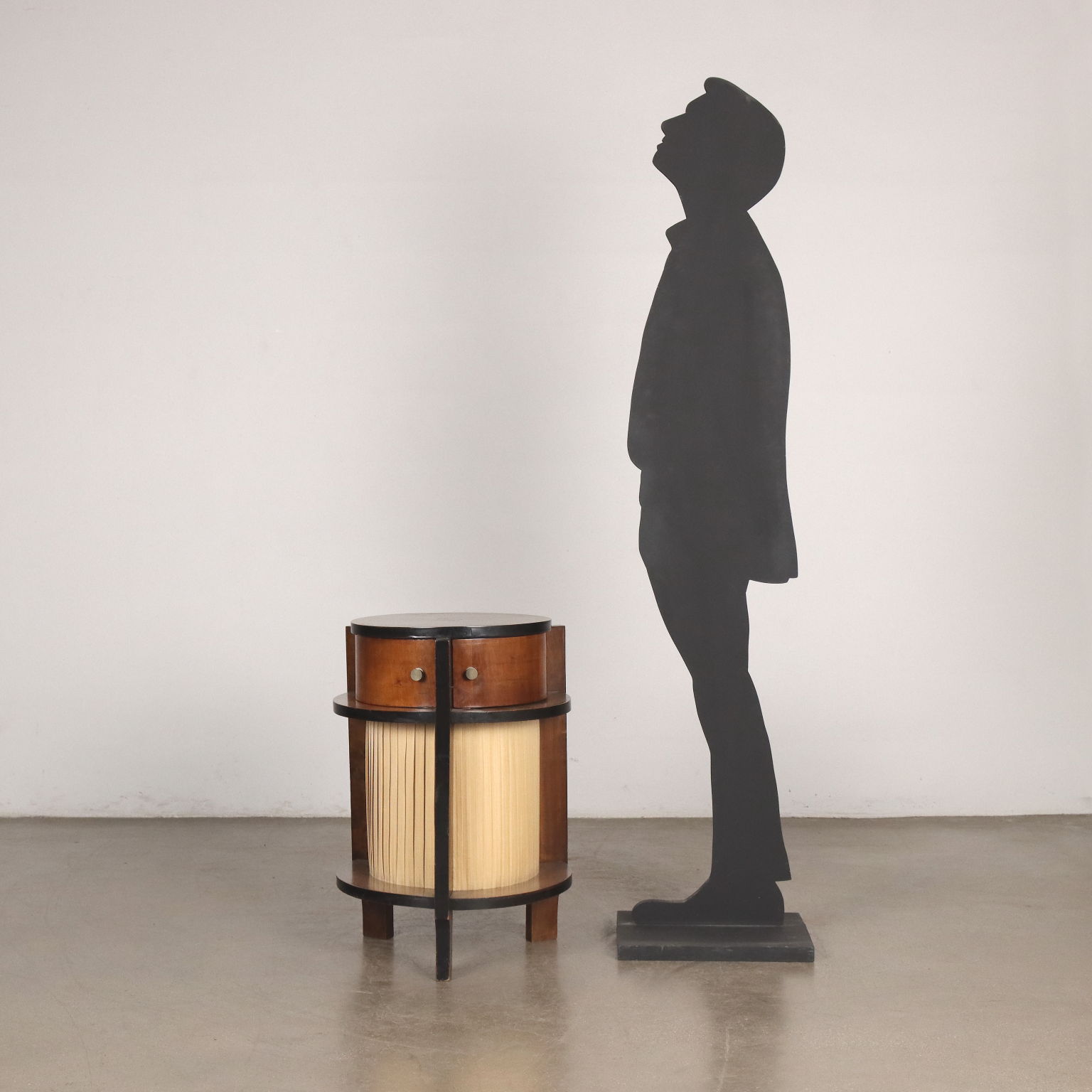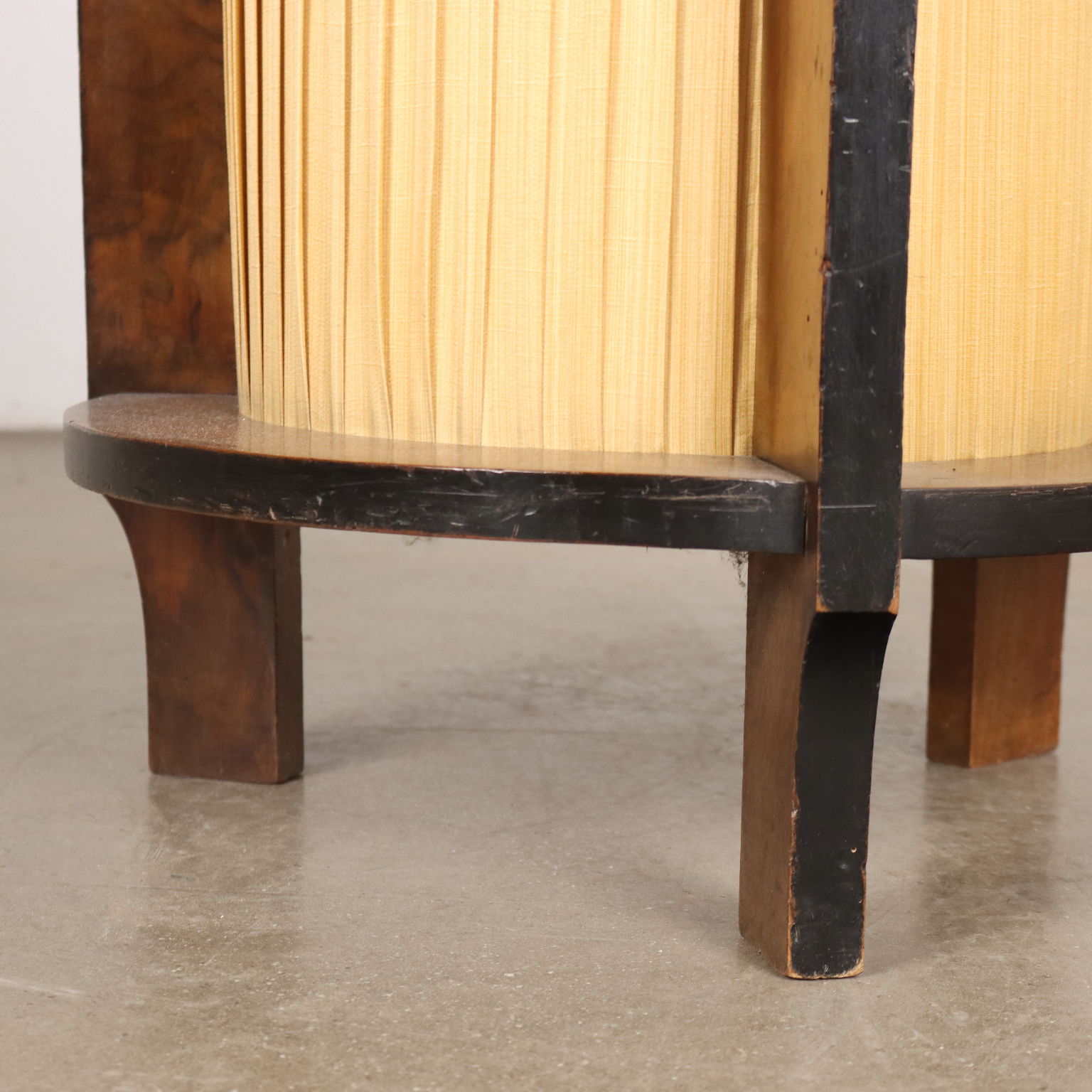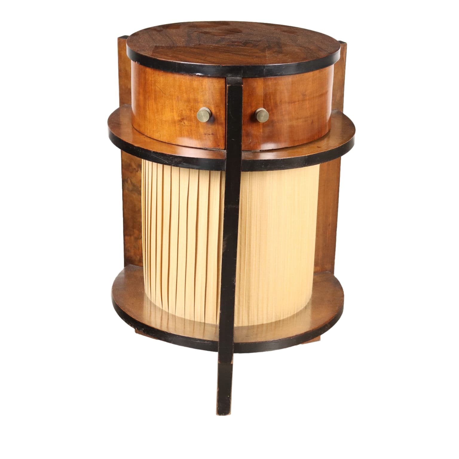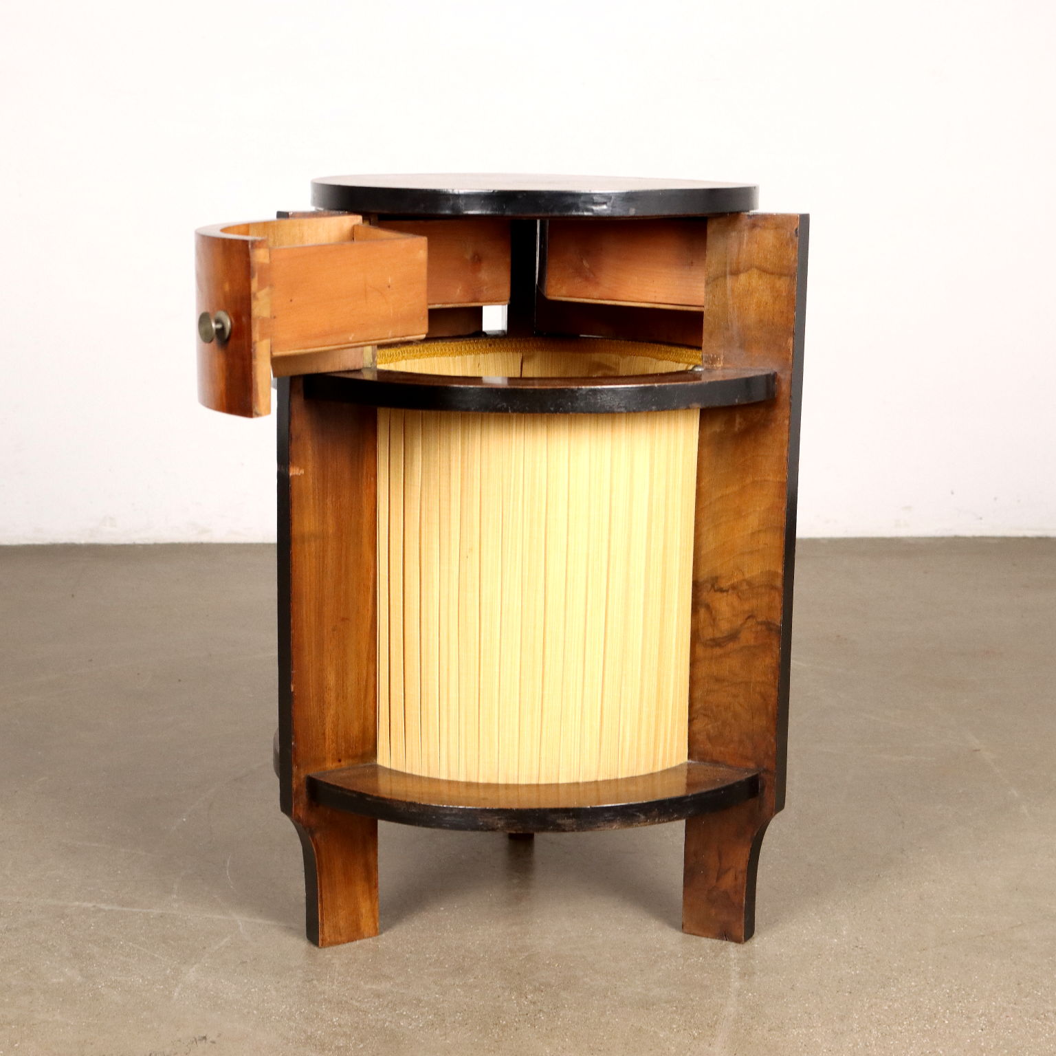 Tavolino Art Decò in noce con parti ebanizzate; nella fascia sono presenti quattro cassetti dai quali si accede al vano centrale; nella parte inferiore è rivestito da tessuto plissettato.