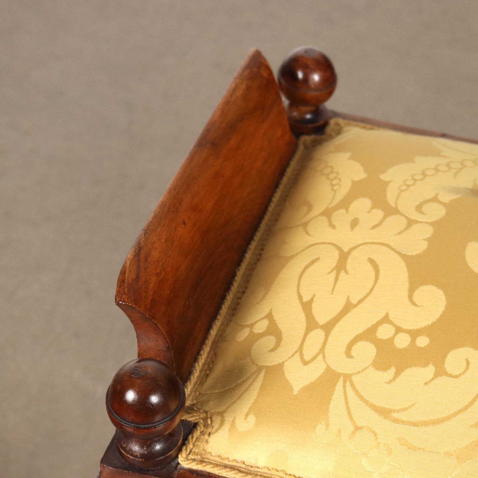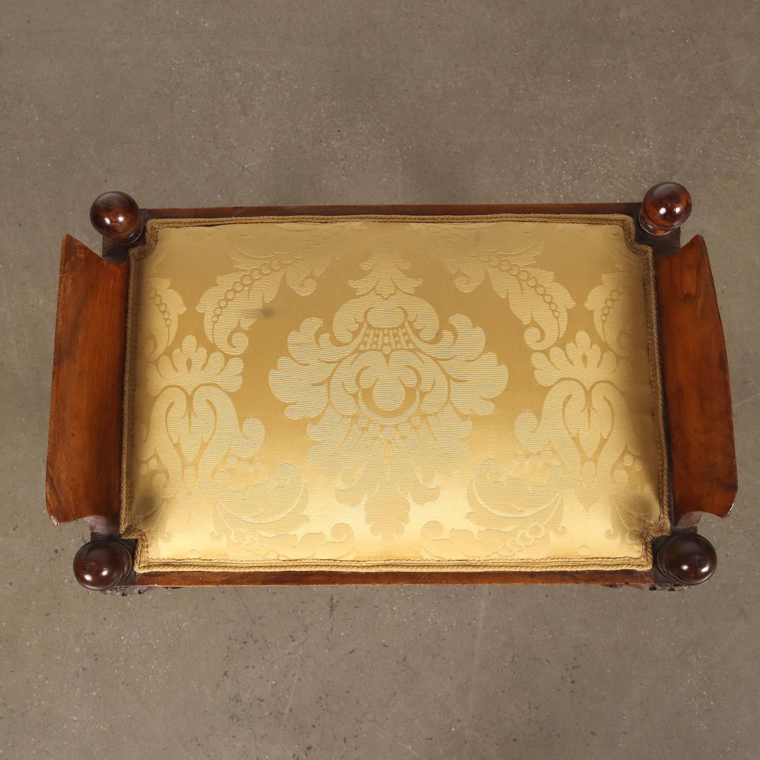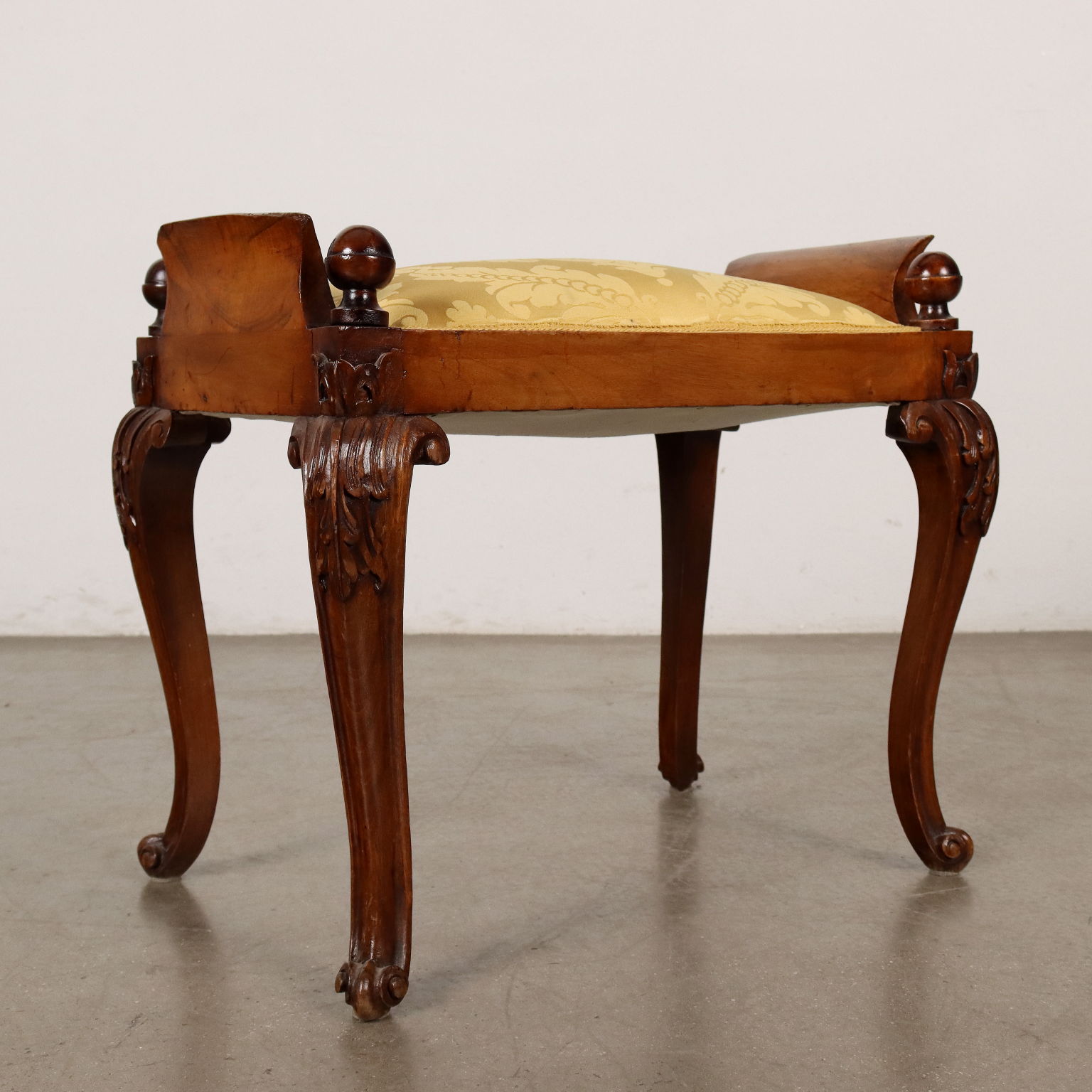 Panchetta in noce in stile barocchetto, Italia XX secolo. Seduta imbottita e rivestita in tessuto damascato, caratterizzata da fianchi estroflessi. Sui quattro angoli altrettanti pomoli torniti; gambe mosse intagliate a motivi fogliacei e riccioli.