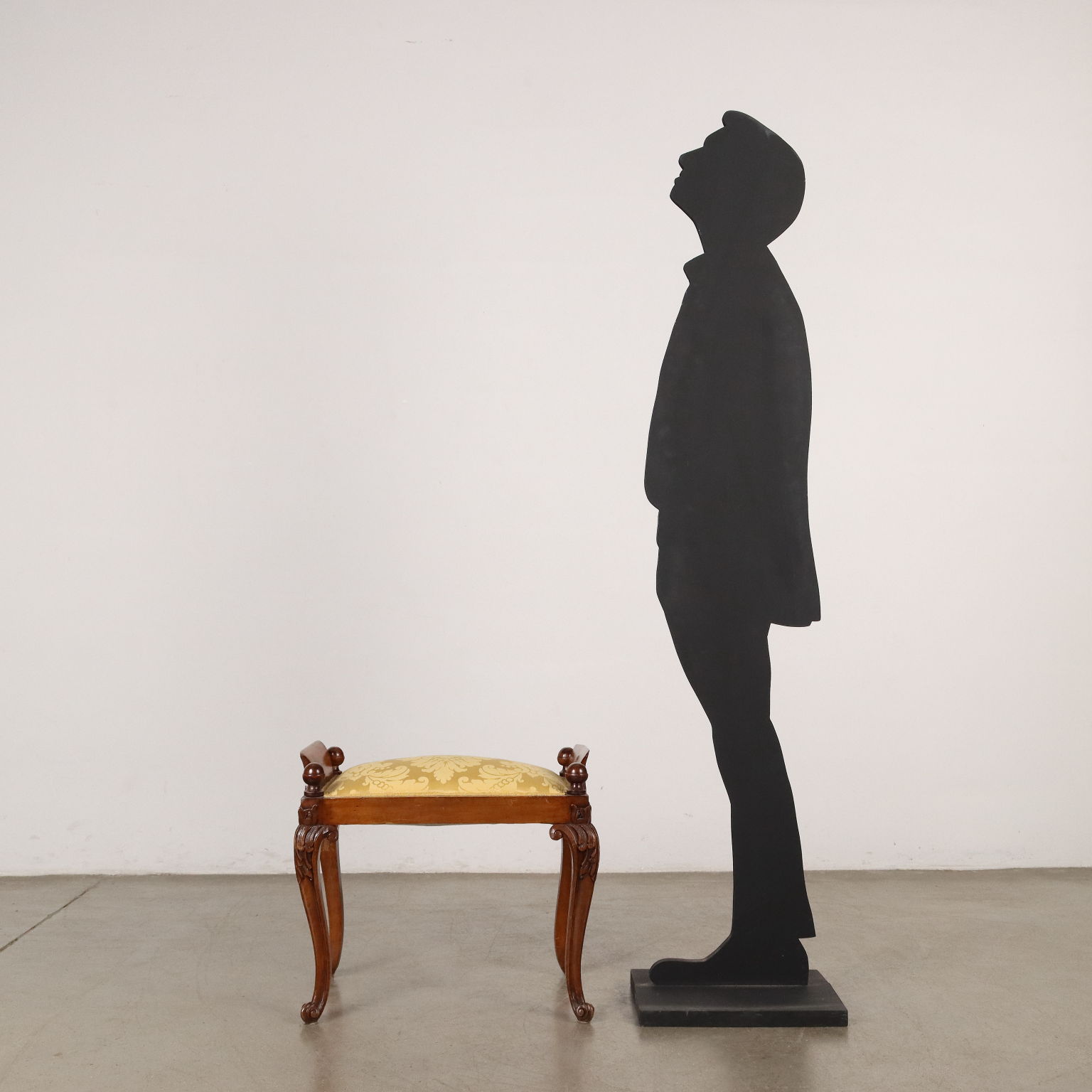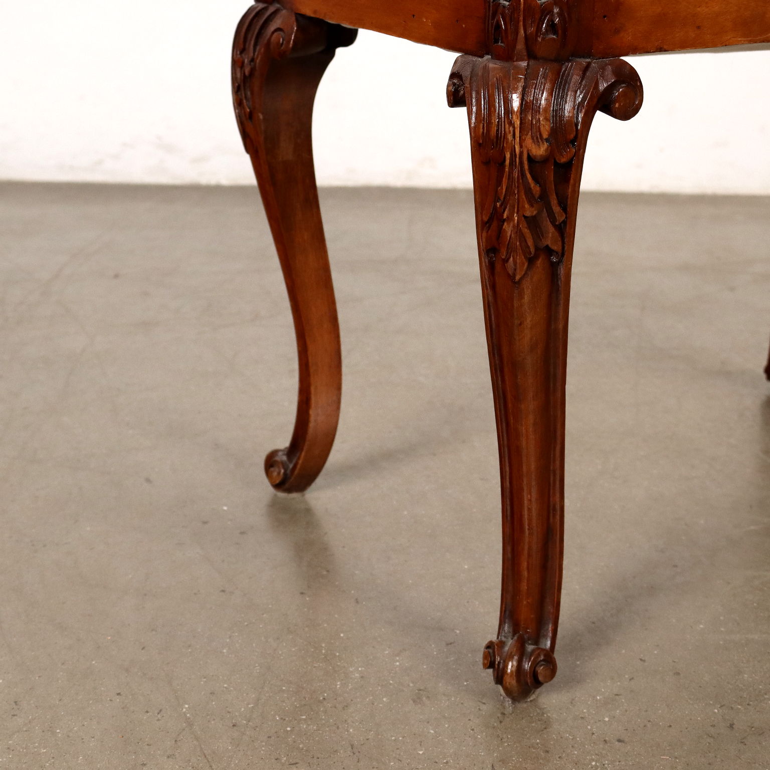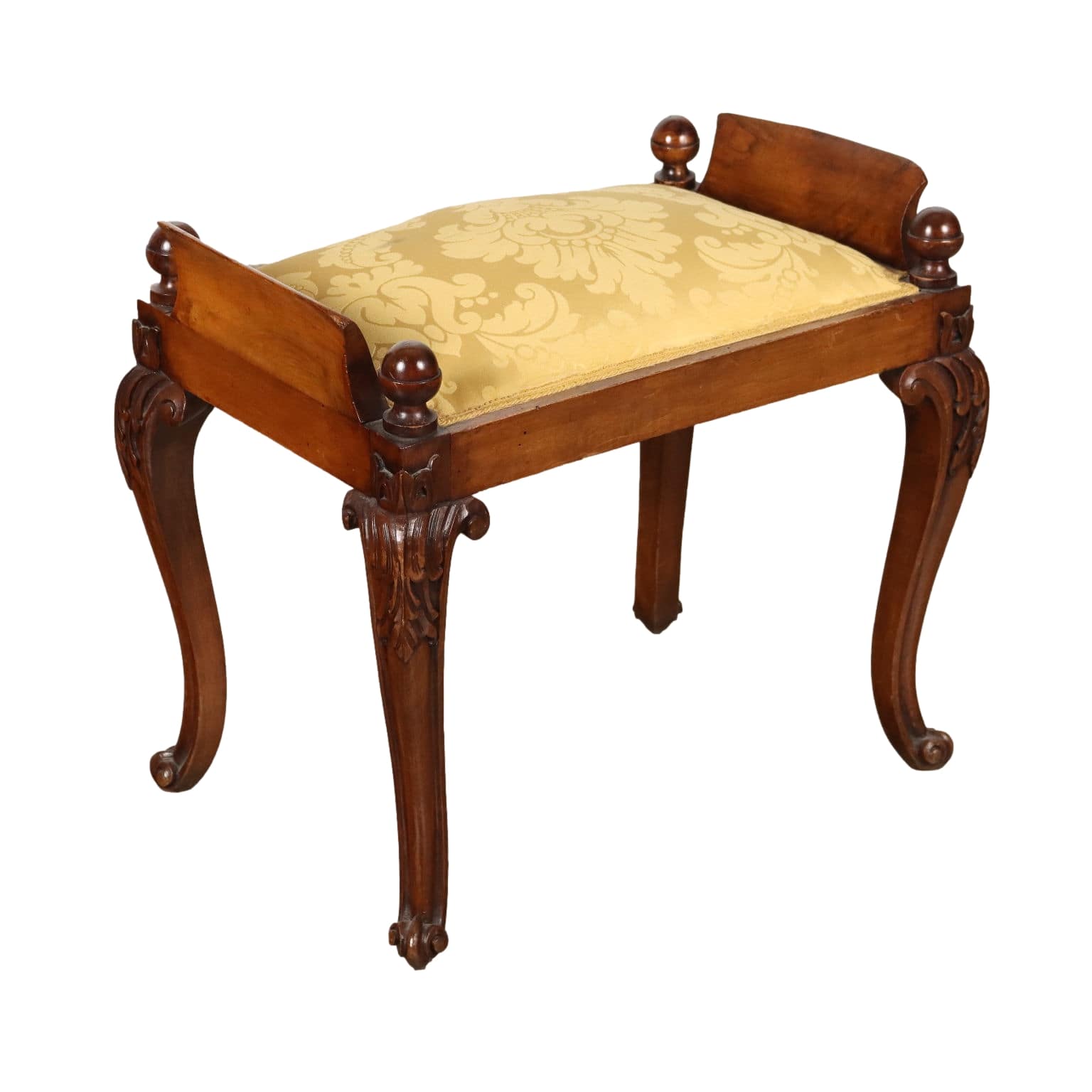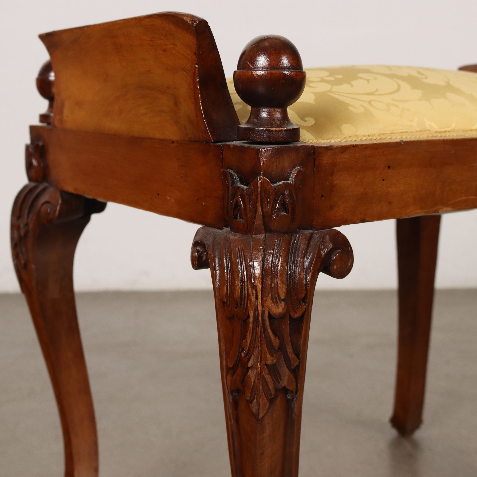 Panchetta in noce in stile barocchetto, Italia XX secolo. Seduta imbottita e rivestita in tessuto damascato, caratterizzata da fianchi estroflessi. Sui quattro angoli altrettanti pomoli torniti; gambe mosse intagliate a motivi fogliacei e riccioli.