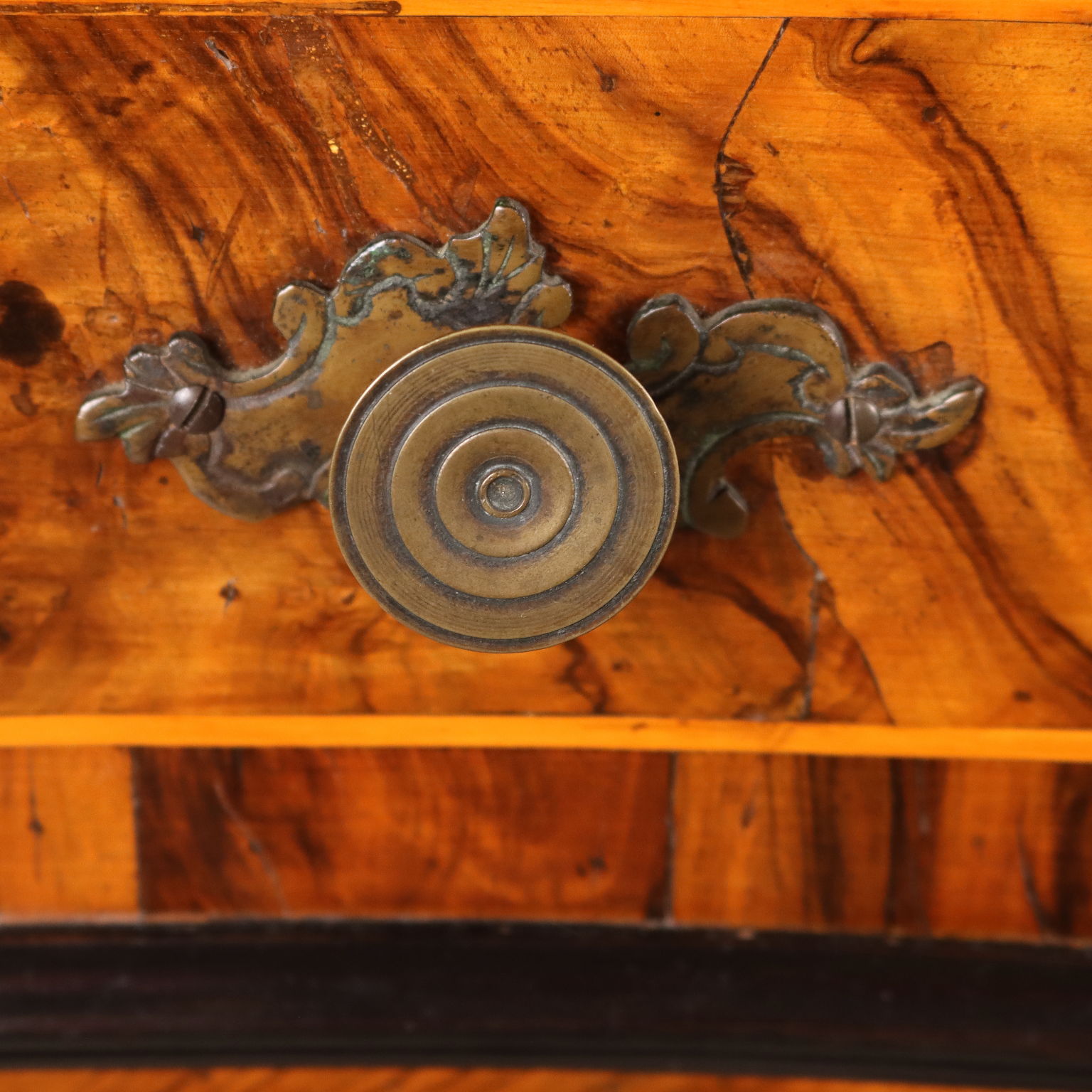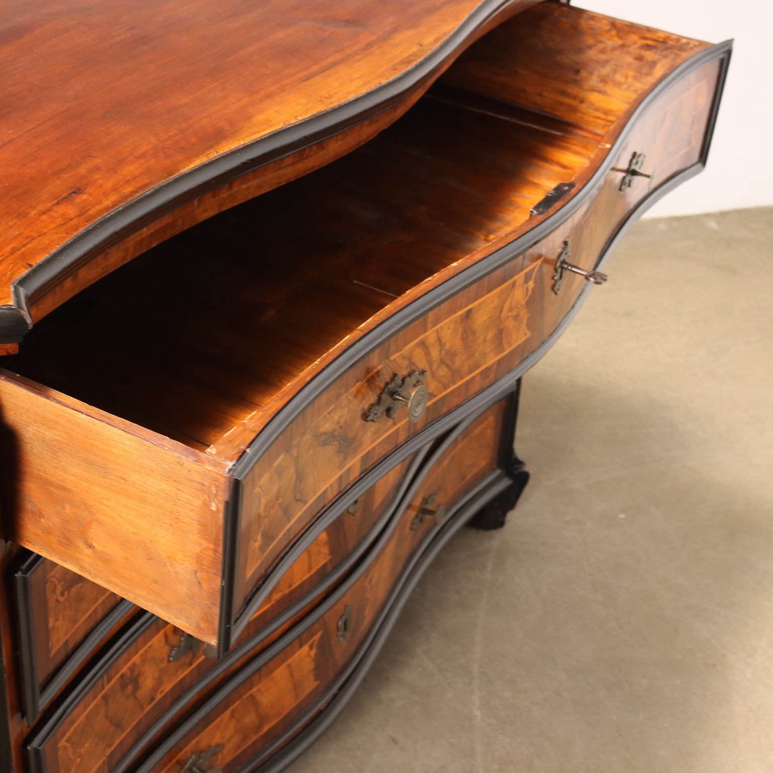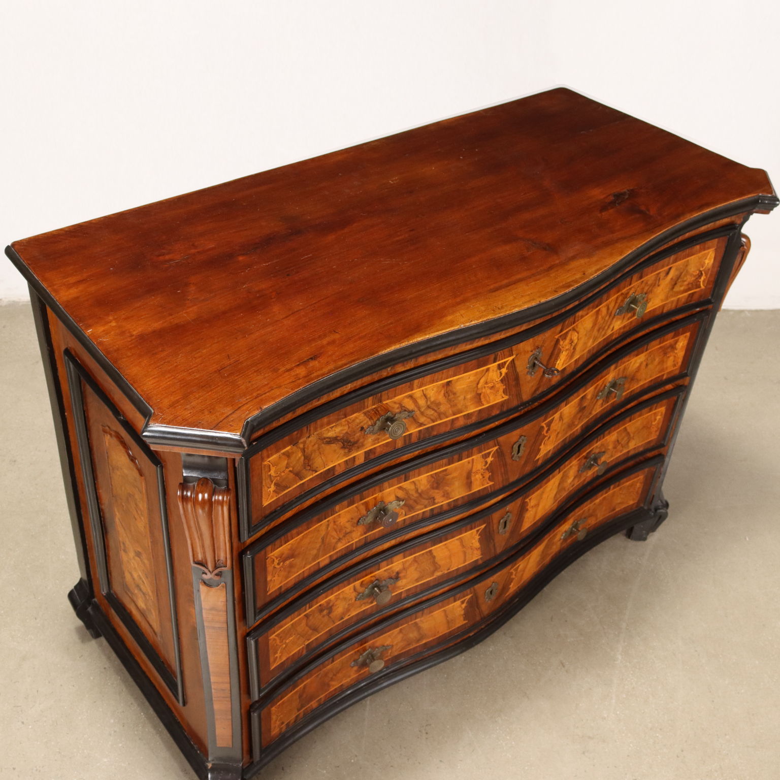 Cassettone barocco lombardo sorretto da caratteristici piedini intagliati, il fronte è mosso a balestra e presenta tre cassetti, piano sagomato. In noce, presenta tipiche cornicette e bordure ebanizzate, il fronte è impiallacciato in noce rigatino, con filettature in acero e riserve in legno di ulivo; interni in pioppo e abete.