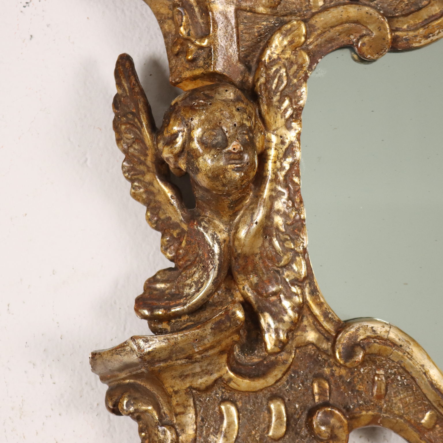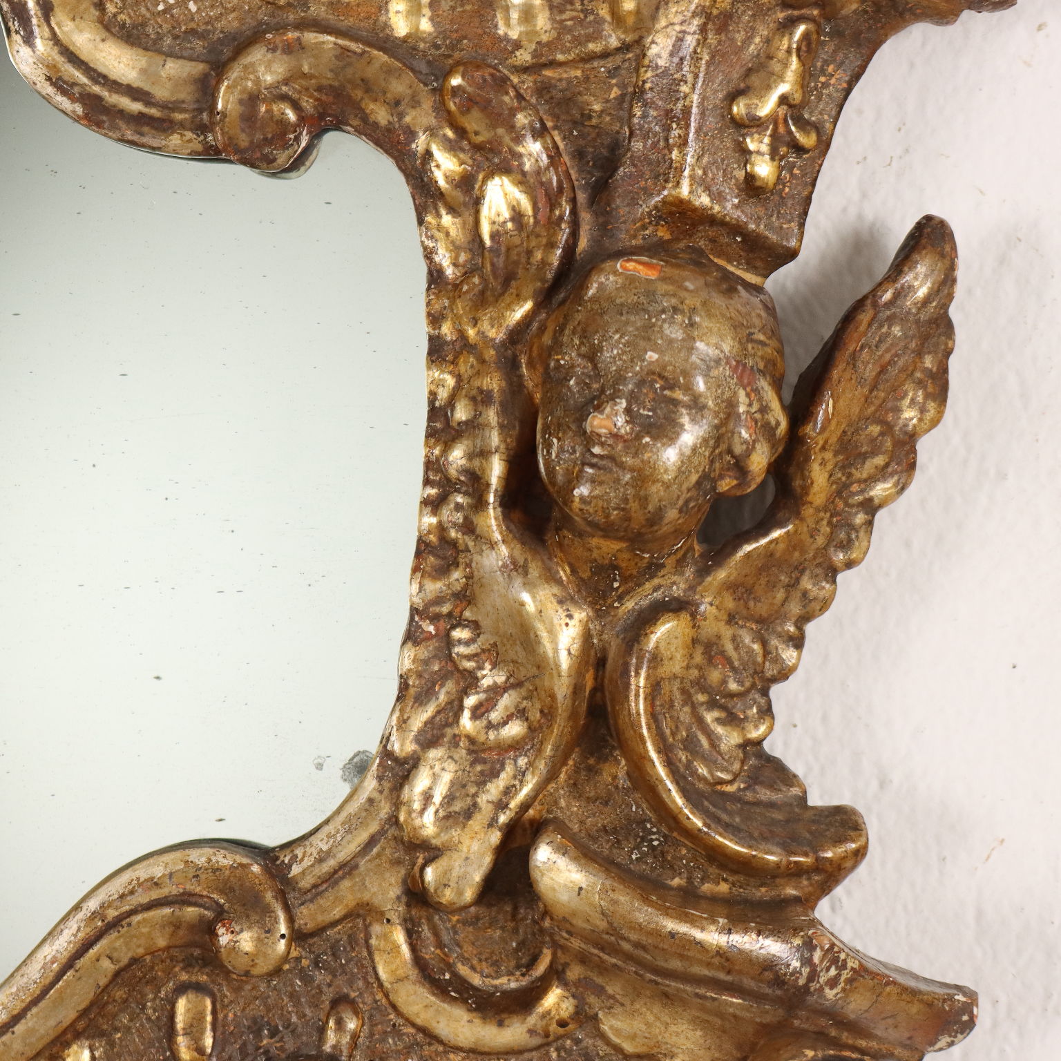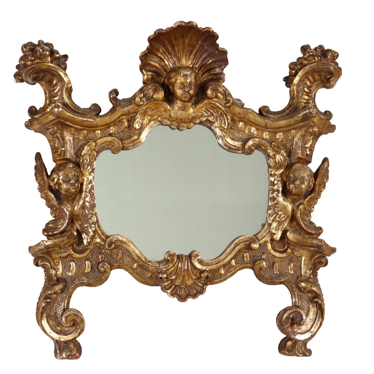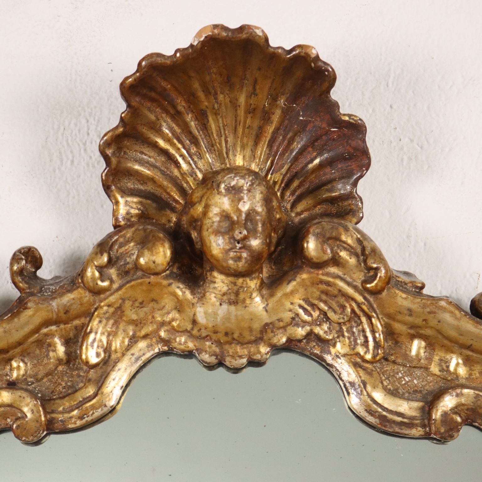 Specchiera barocco con cornice intagliata con caratteristiche volute a ricciolo e teste di cherubini, una delle quali a ornare la cimasa entro elemento a conchiglia; interamente dorata a mecca, la doratura è stata ripresa in antico.