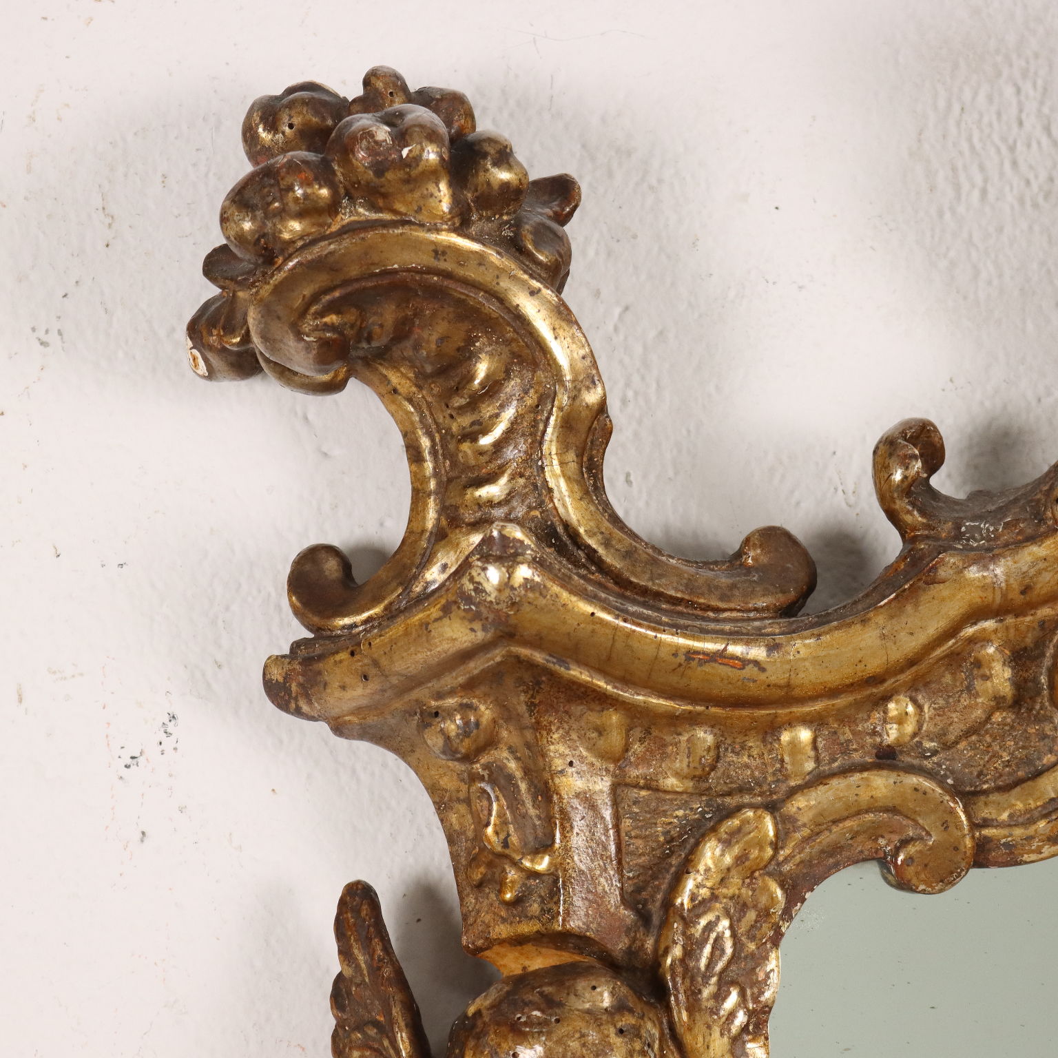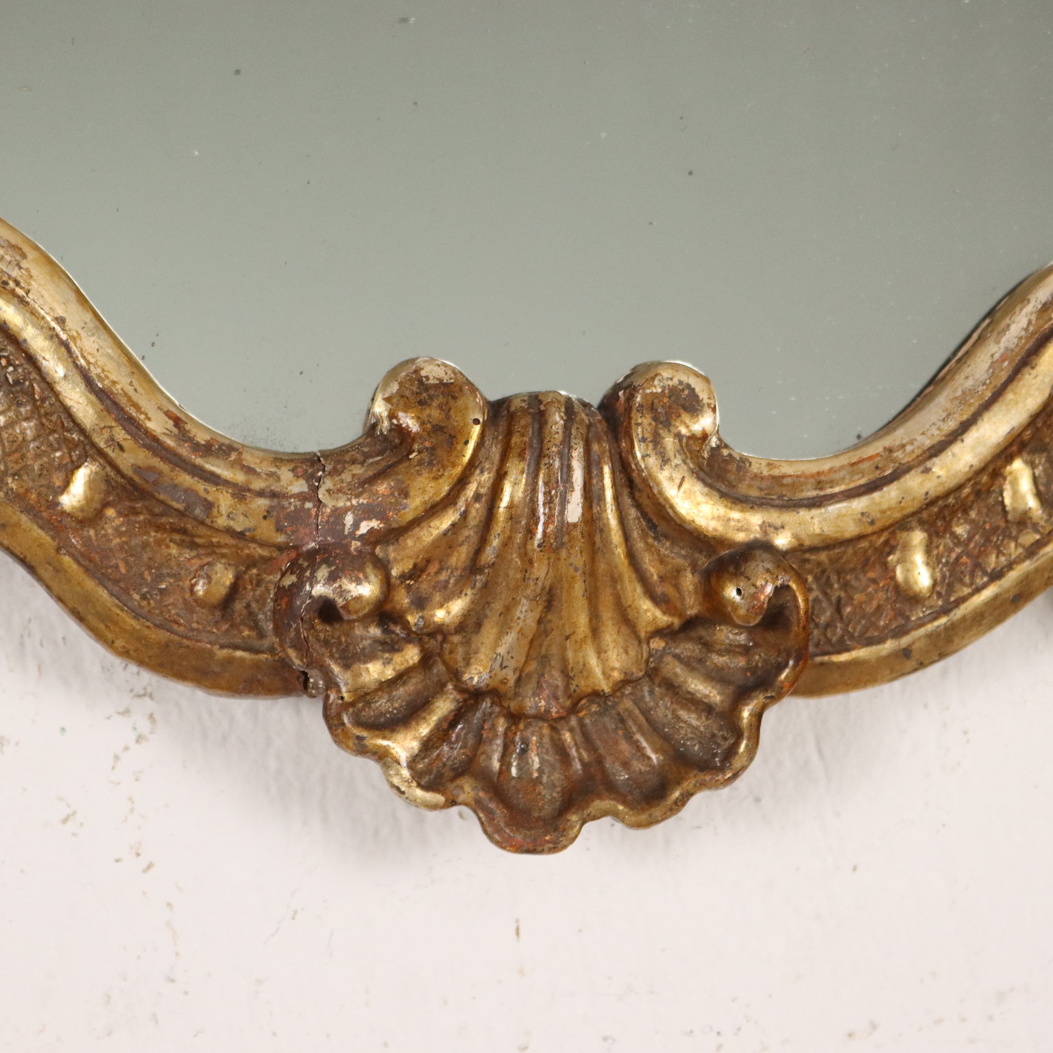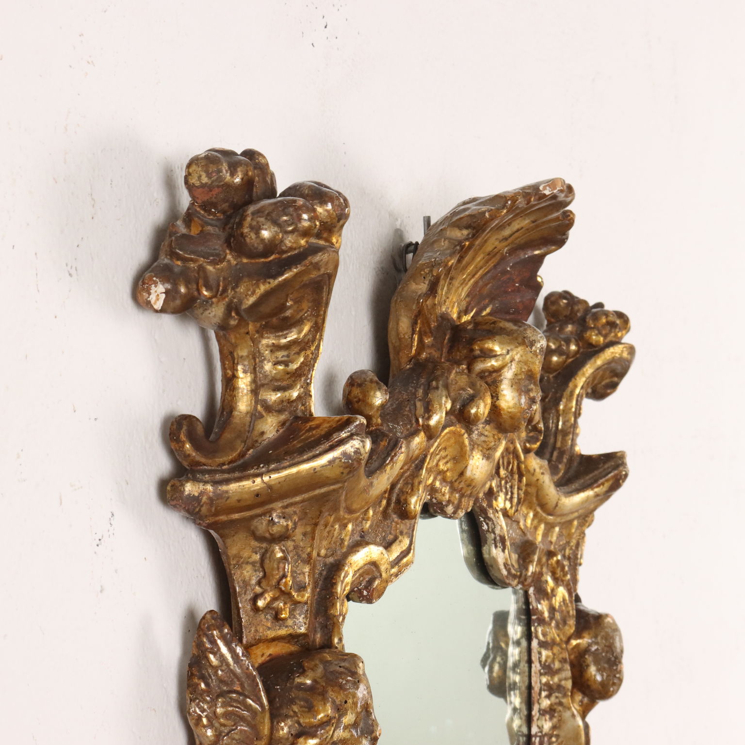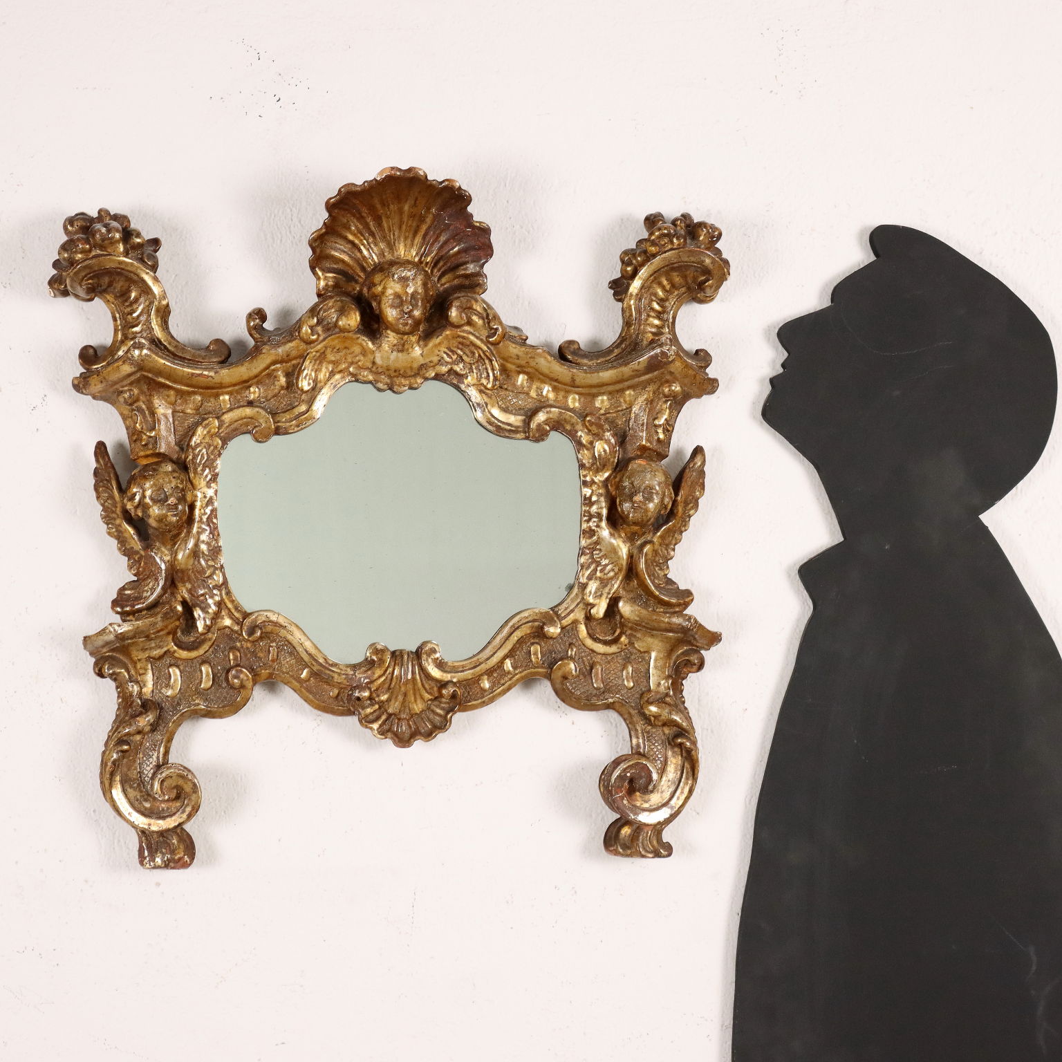 Specchiera barocco con cornice intagliata con caratteristiche volute a ricciolo e teste di cherubini, una delle quali a ornare la cimasa entro elemento a conchiglia; interamente dorata a mecca, la doratura è stata ripresa in antico.