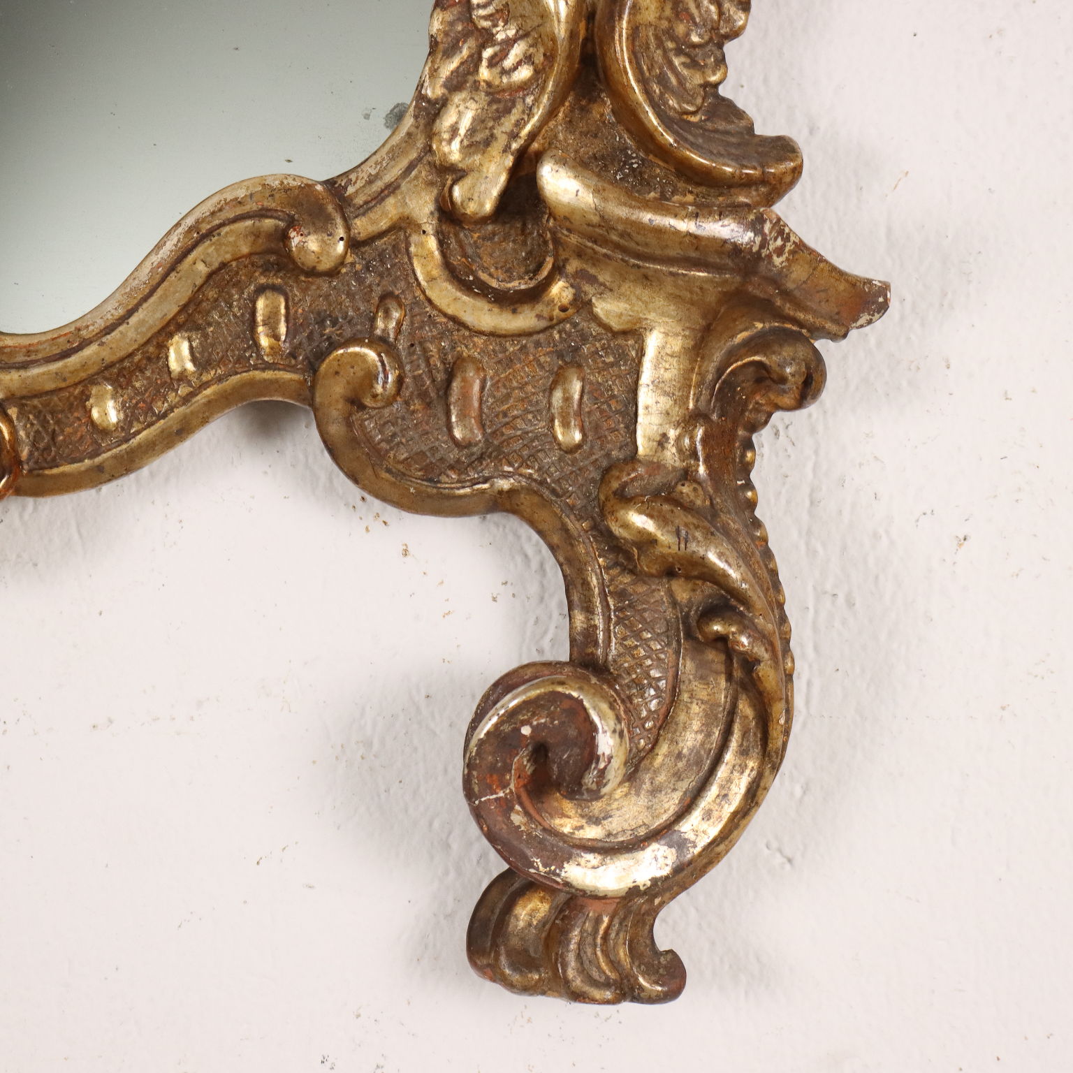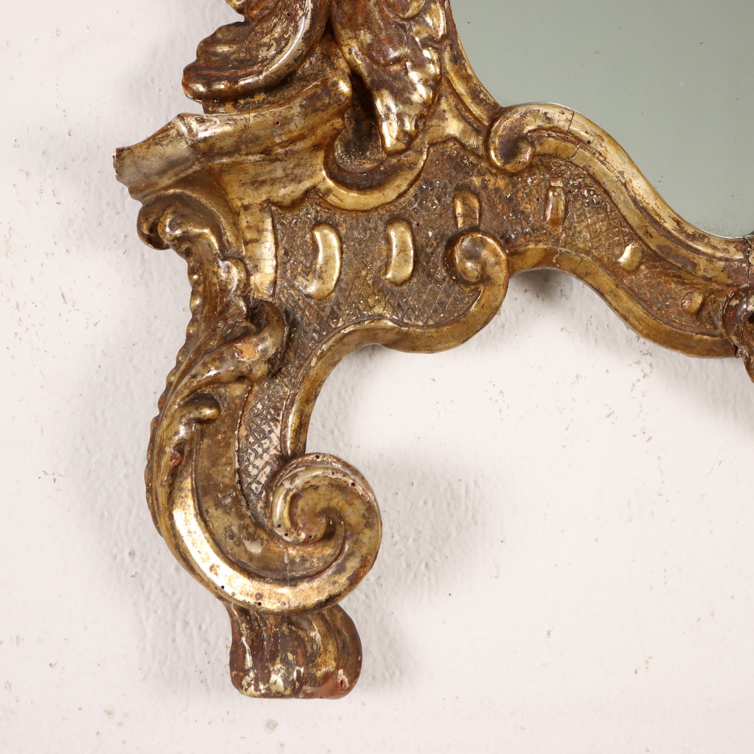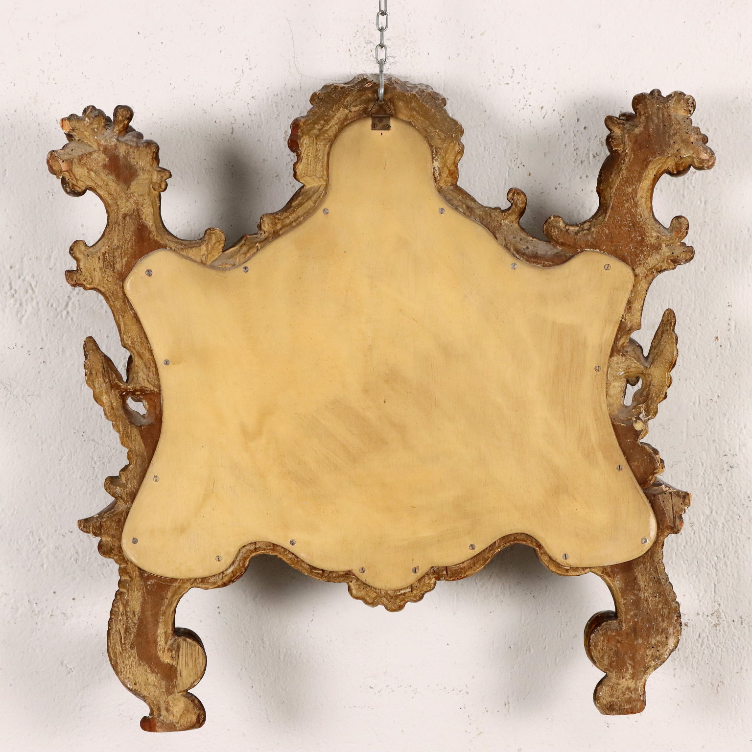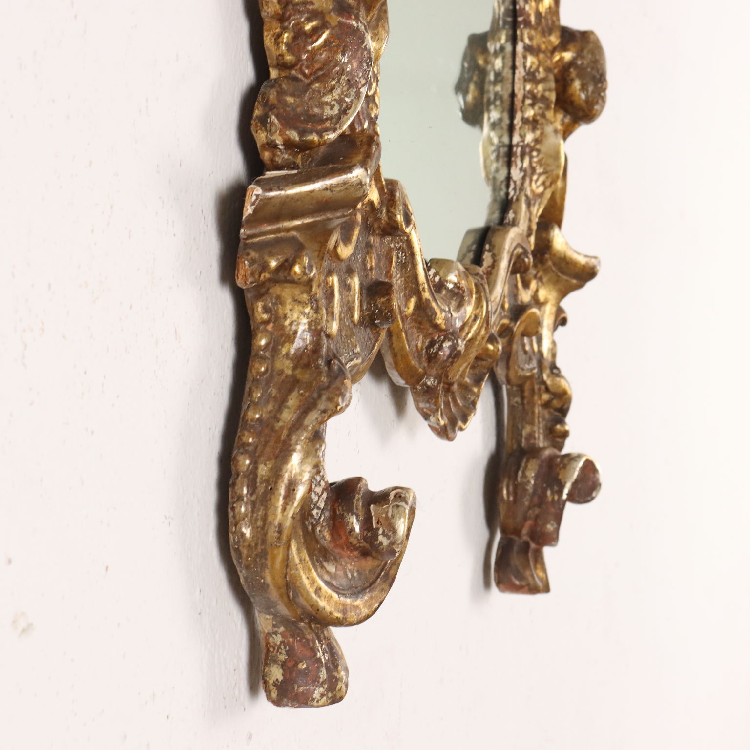Specchiera barocco con cornice intagliata con caratteristiche volute a ricciolo e teste di cherubini, una delle quali a ornare la cimasa entro elemento a conchiglia; interamente dorata a mecca, la doratura è stata ripresa in antico.