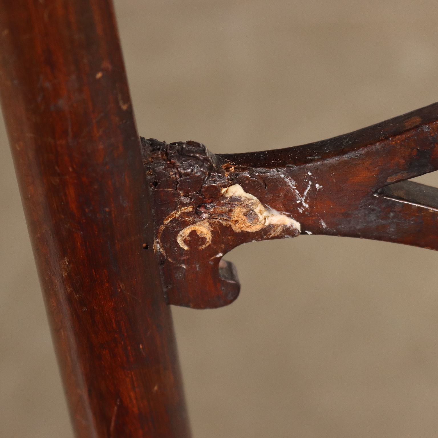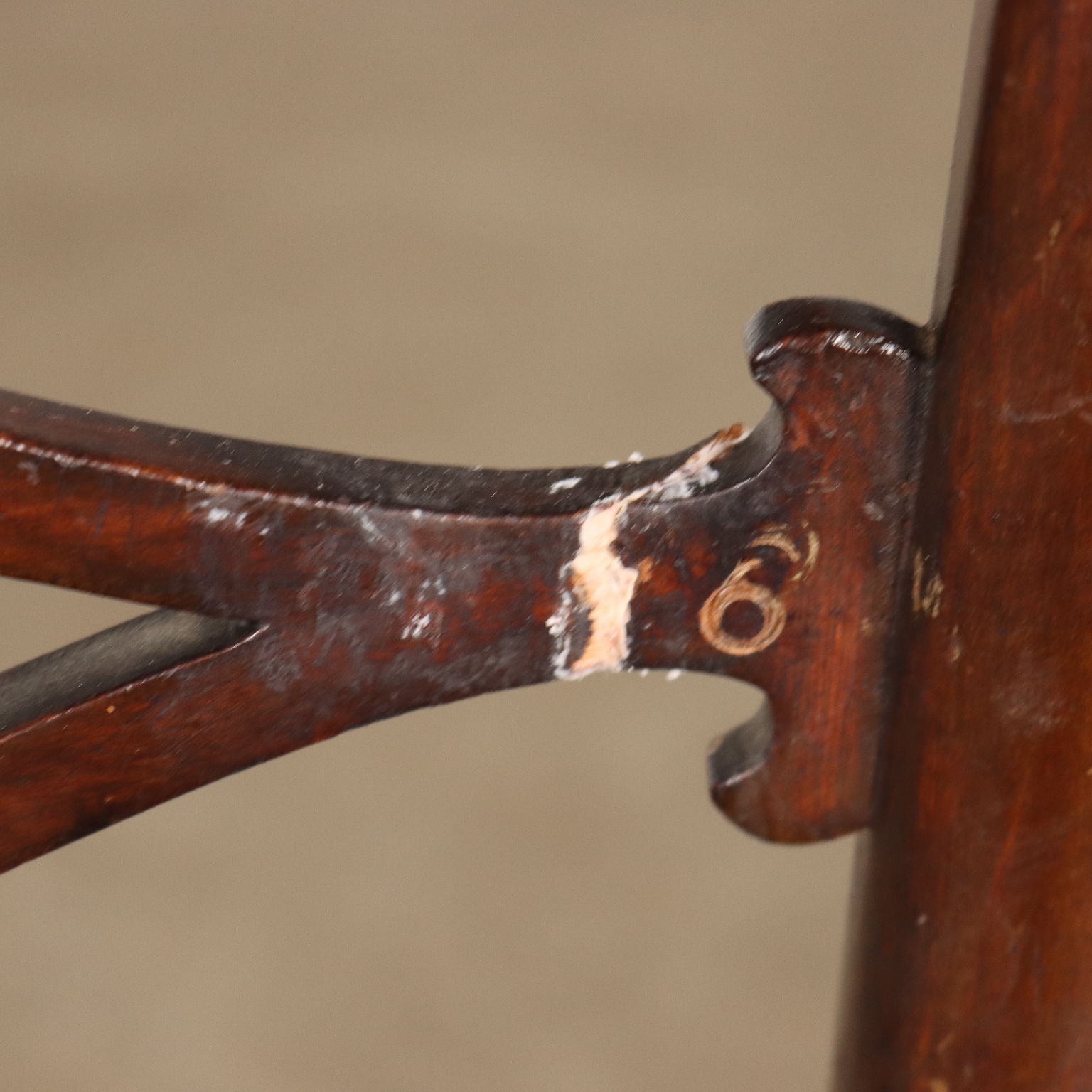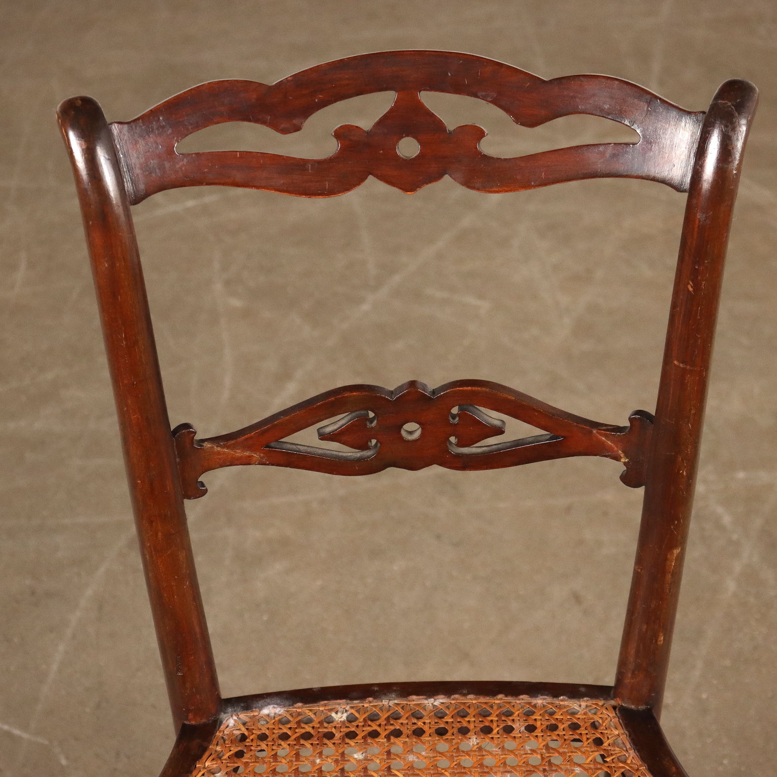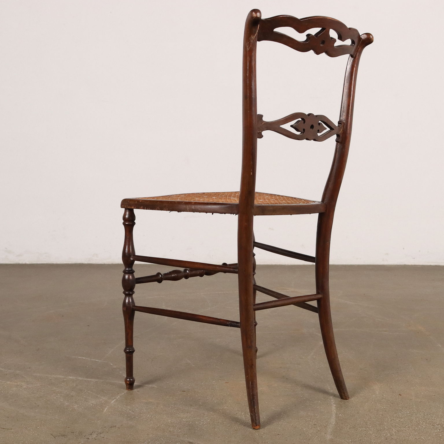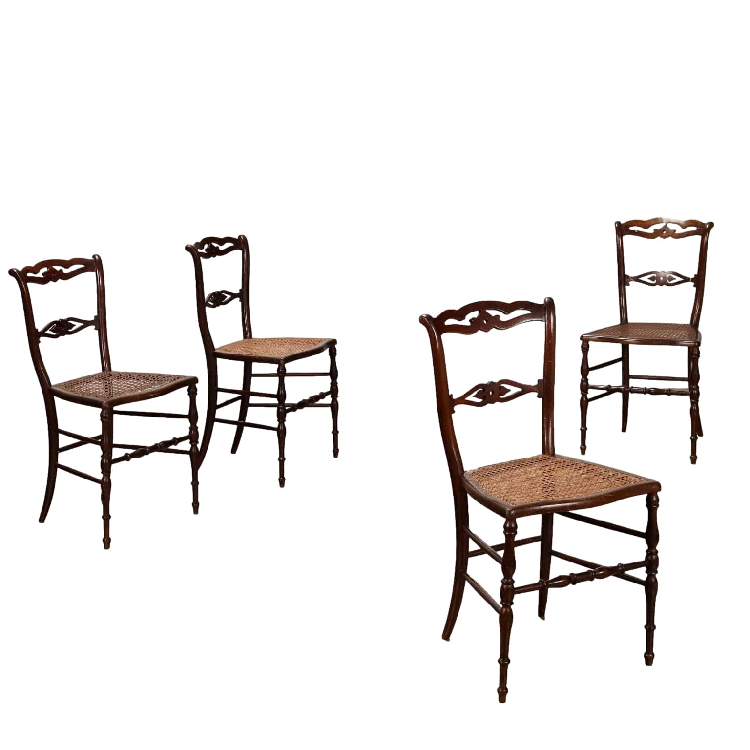 Gruppo di quattro sedie chiavarine in acero tinto, Chiavari fine XIX - inizio XX secolo. Gambe e traversa anteriore tornite, gambe posteriori a sciabola. Schienali a giorno con cartelle ornate da motivo traforato. Sedute in paglia di Vienna, di cui una sfondata.