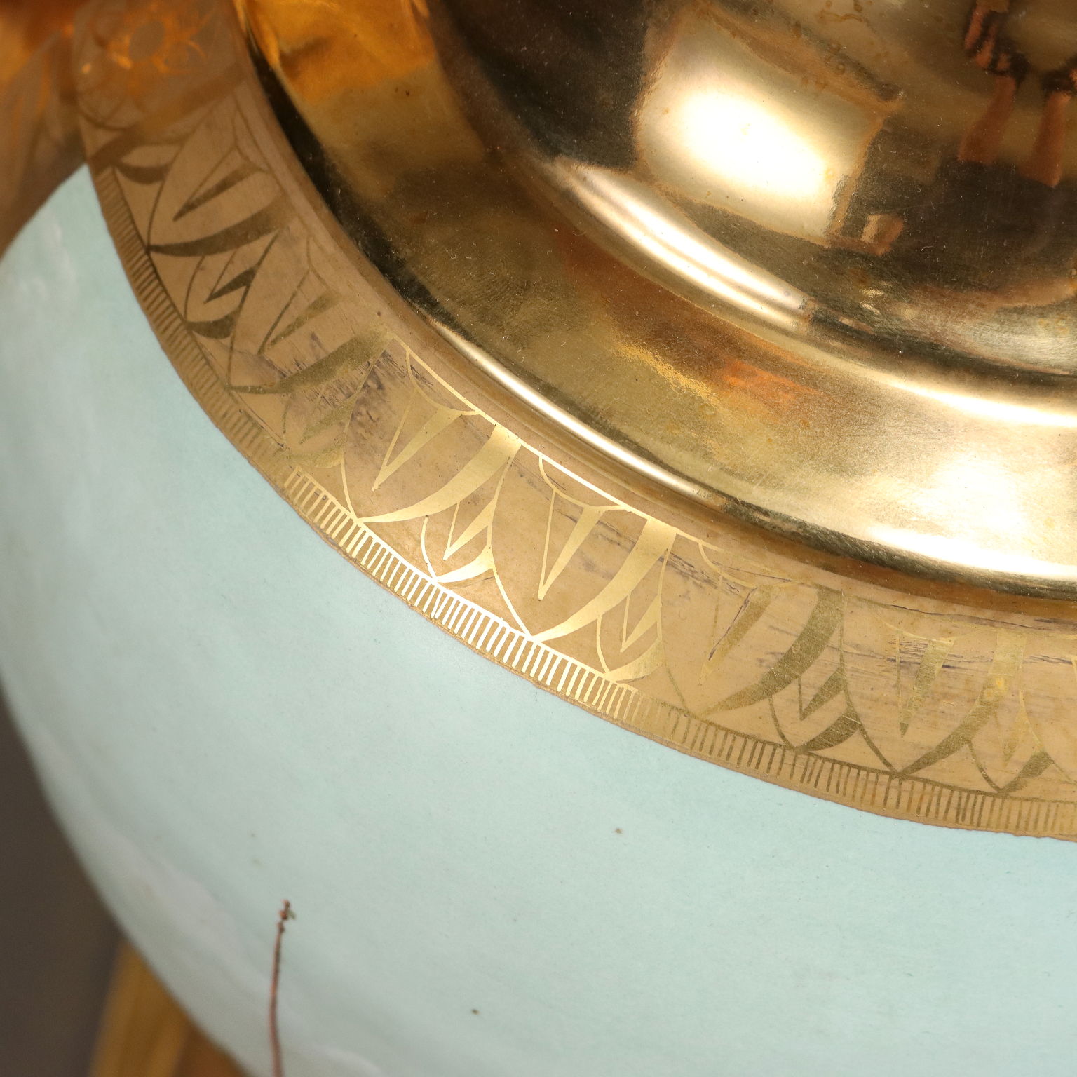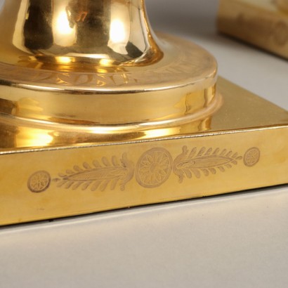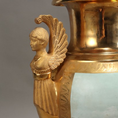 Coppia di grandi vasi in porcellana francese, mirabilmente eseguiti in stile Impero, con vedute di Venezia, dipinte a mano in una riserva sulla parte frontale. Il retro si presenta tutto in oro zecchino, come il resto della superficie del vaso, con alcuni motivi ad incisione. Anse con cariatidi alate e base quadrata.