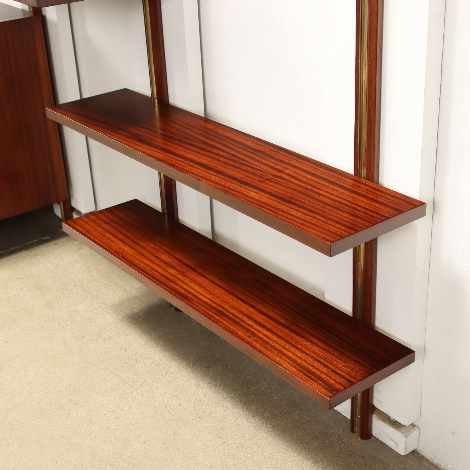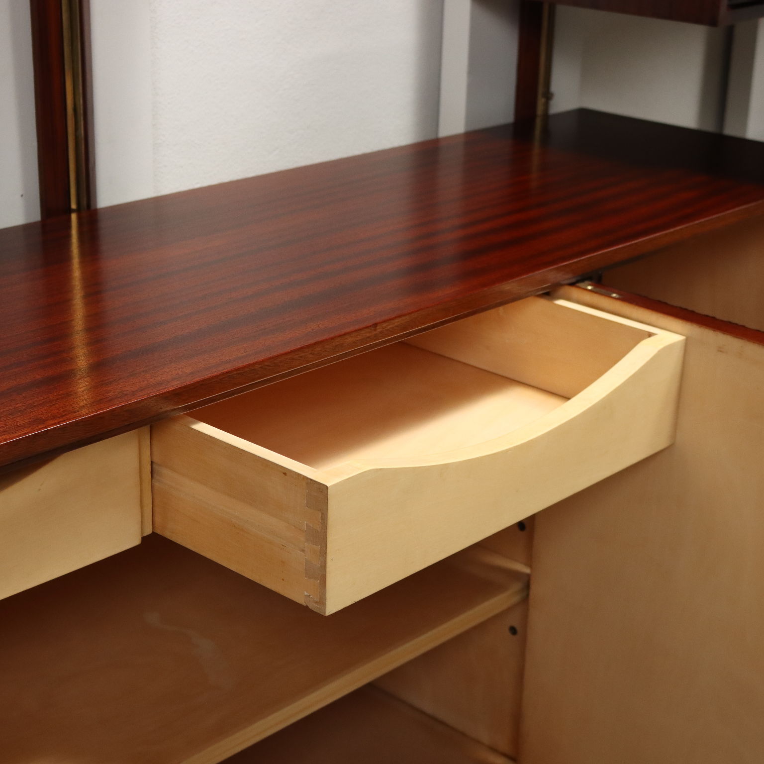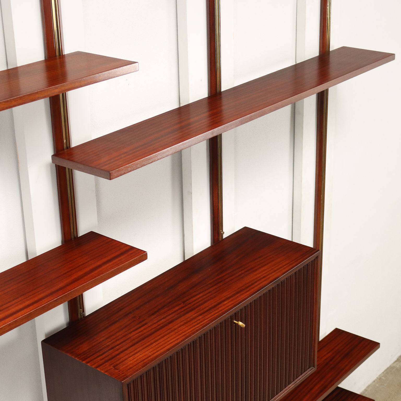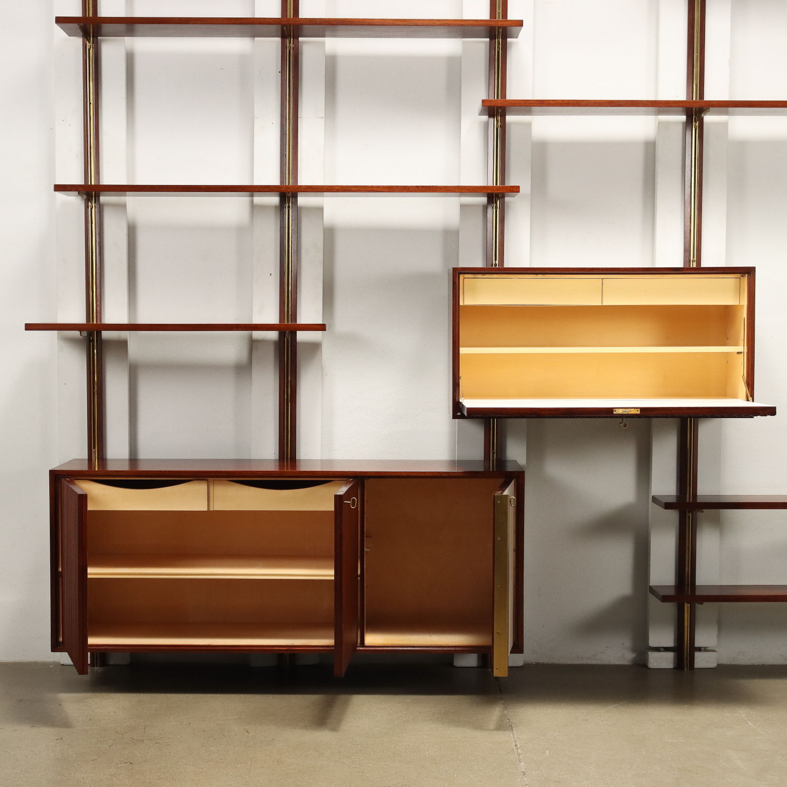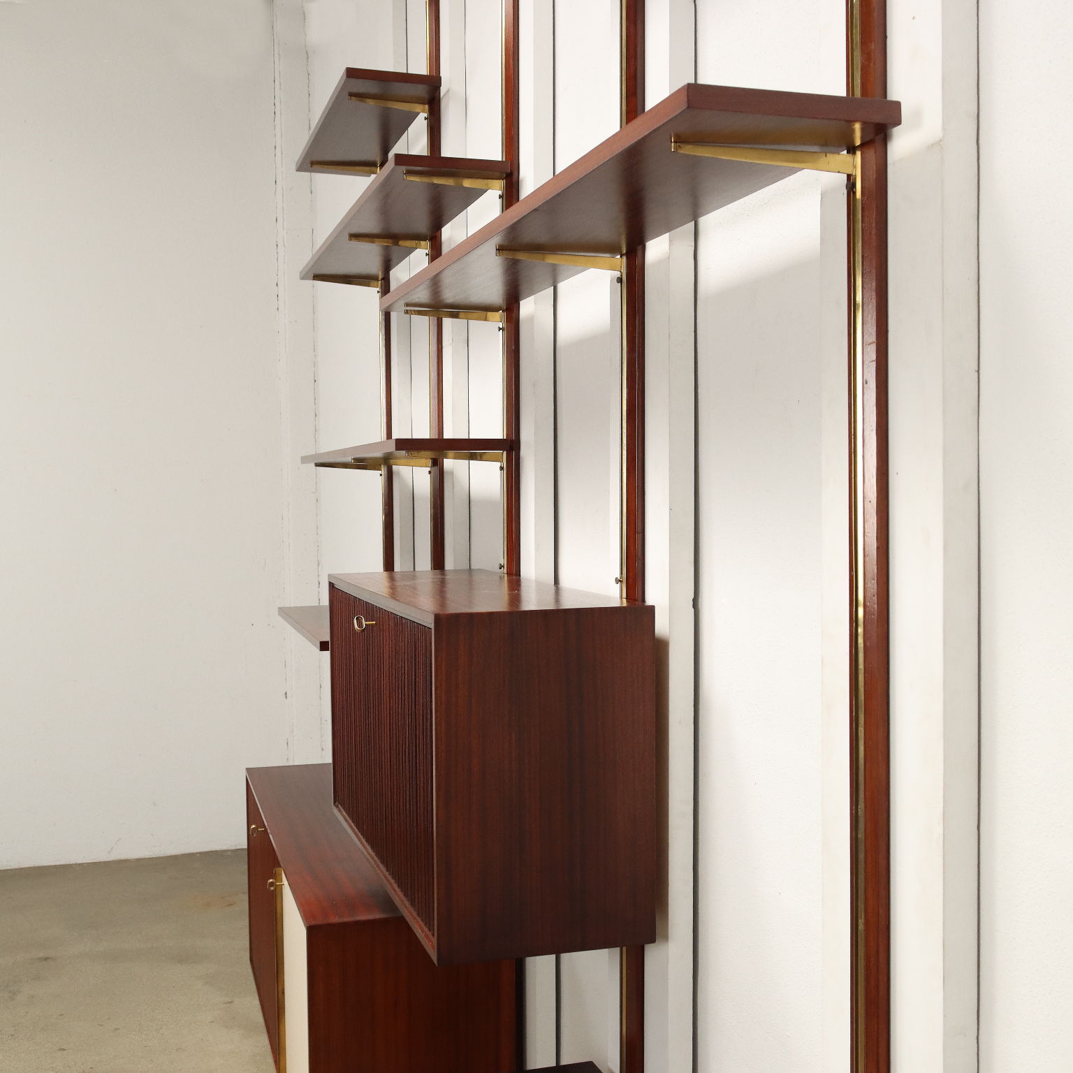 Elegante libreria a parete (necessita di ancoraggio a muro) con ripiani a posizione regolabile, elementi contenitore con ribalta per vano bar e a battente, legno impiallacciato mogano, formica, guide e supporti in ottone. Restaurata.