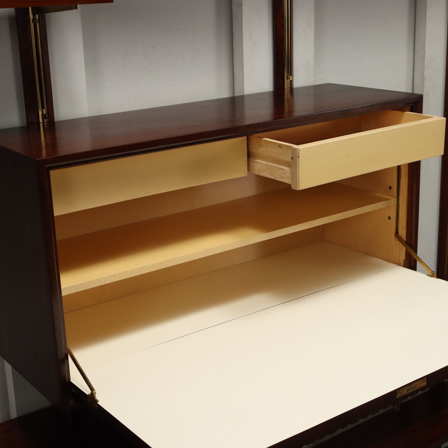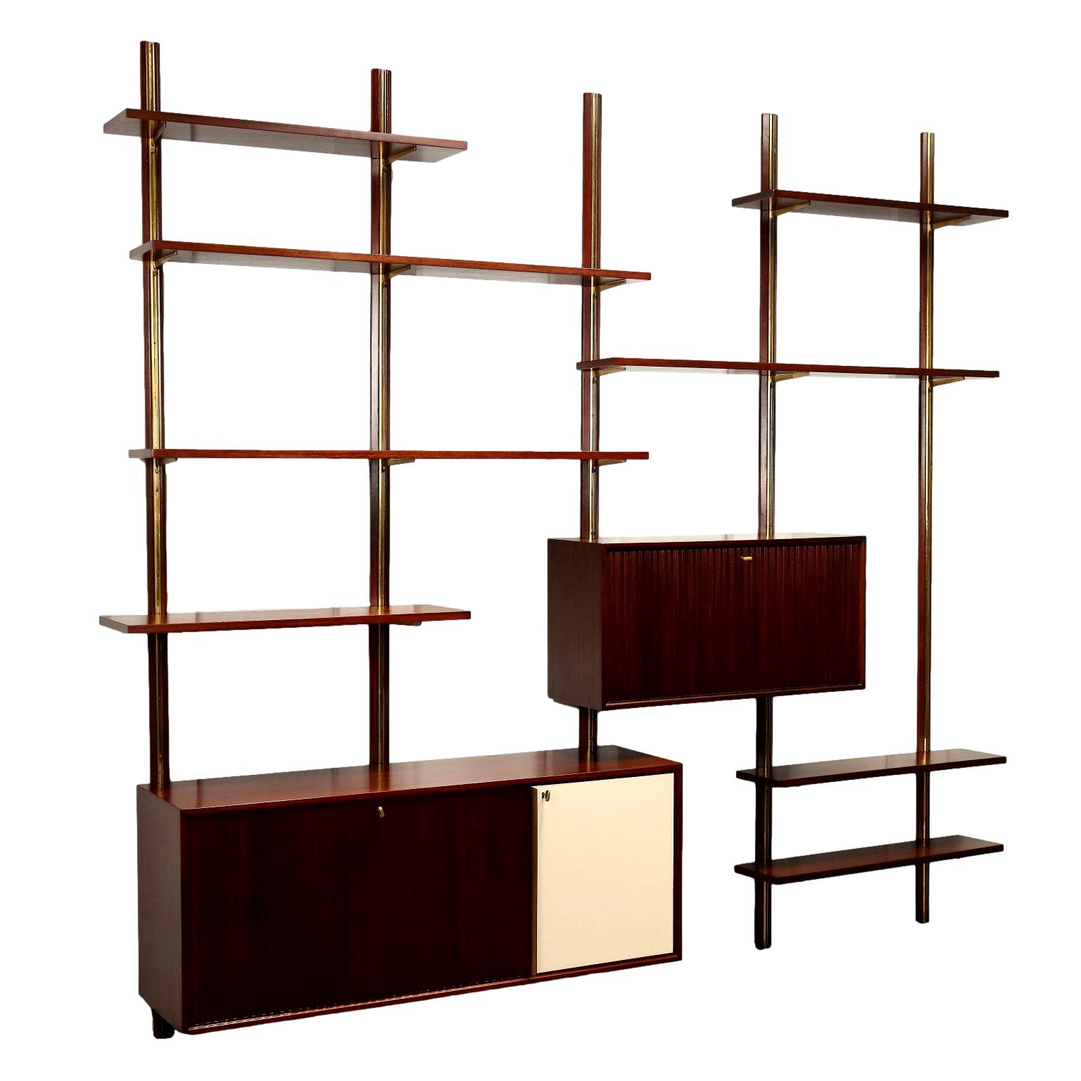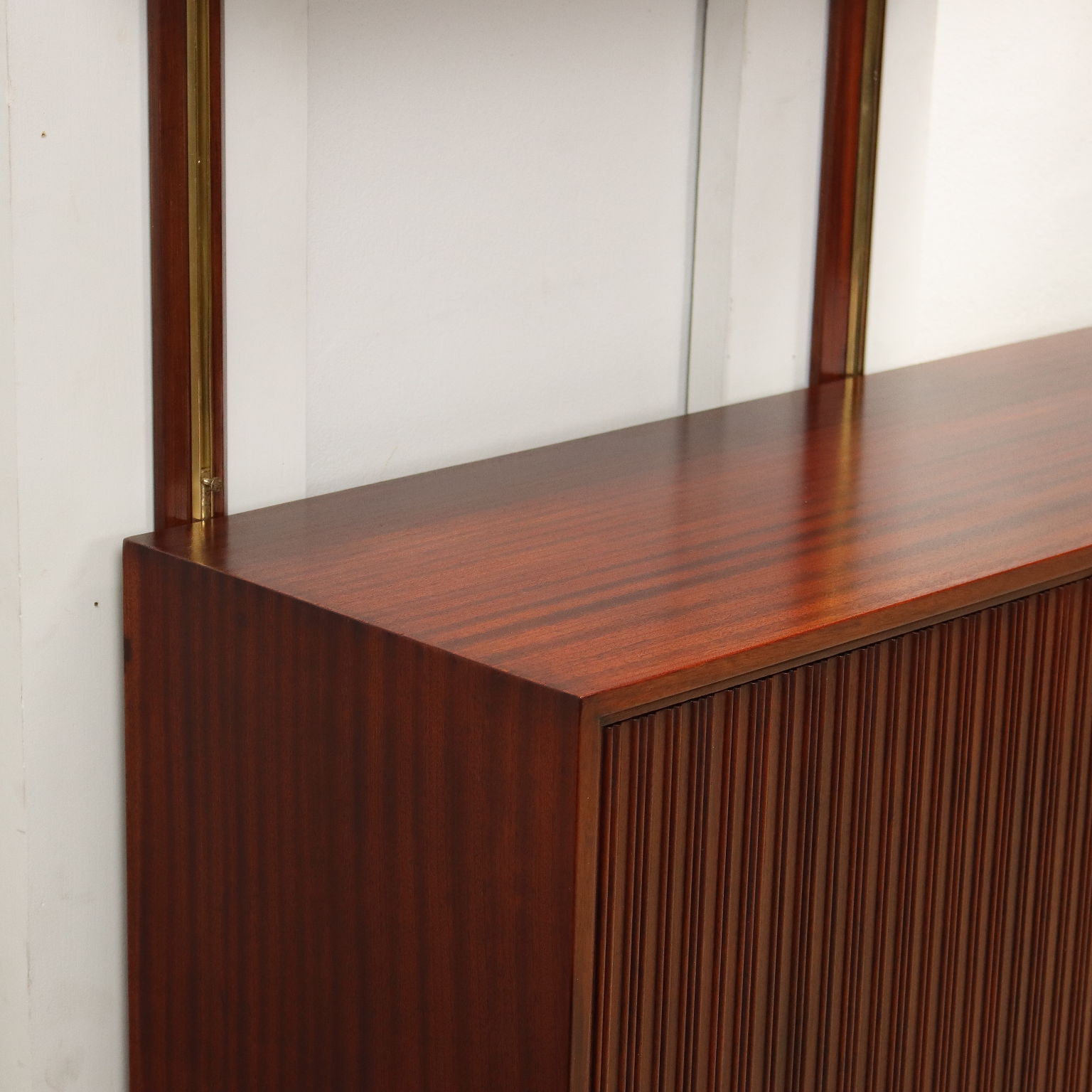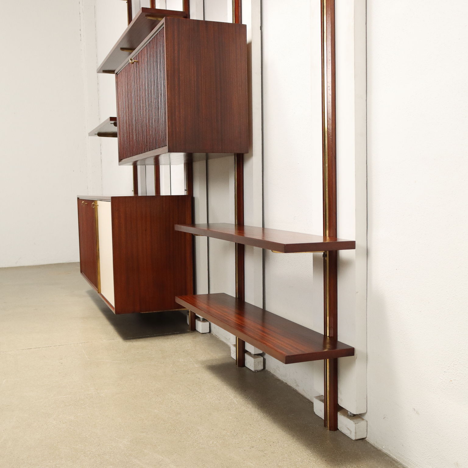 Elegante libreria a parete (necessita di ancoraggio a muro) con ripiani a posizione regolabile, elementi contenitore con ribalta per vano bar e a battente, legno impiallacciato mogano, formica, guide e supporti in ottone. Restaurata.
