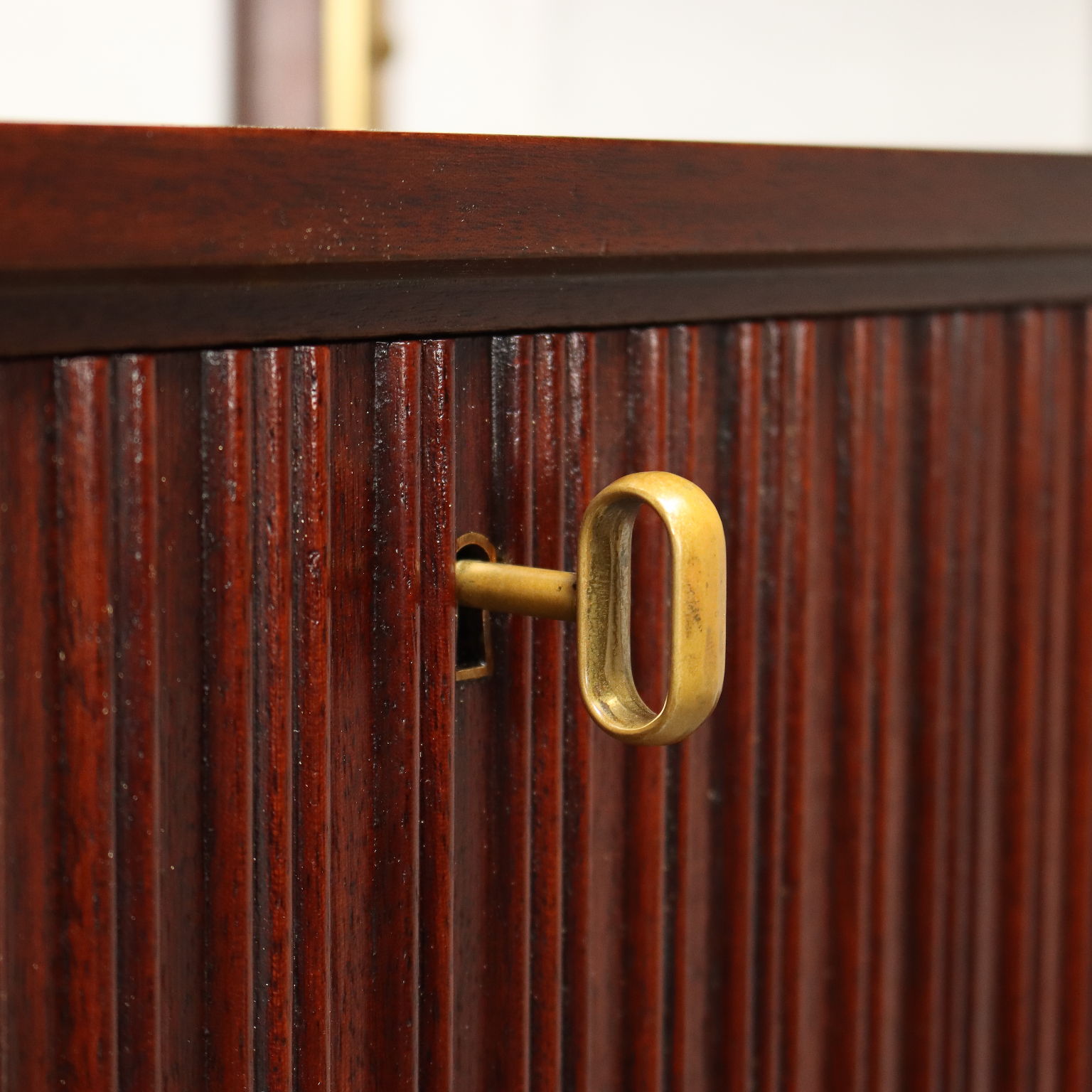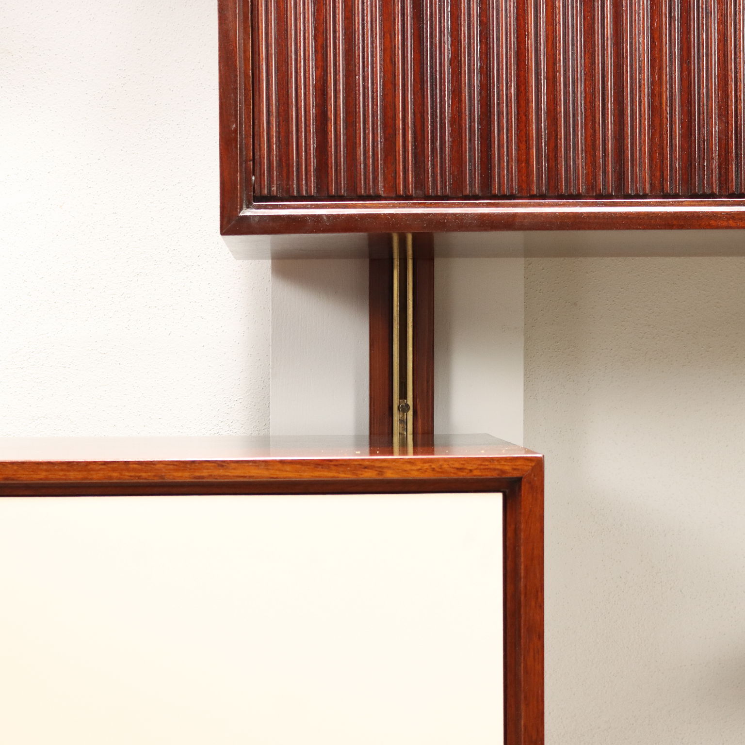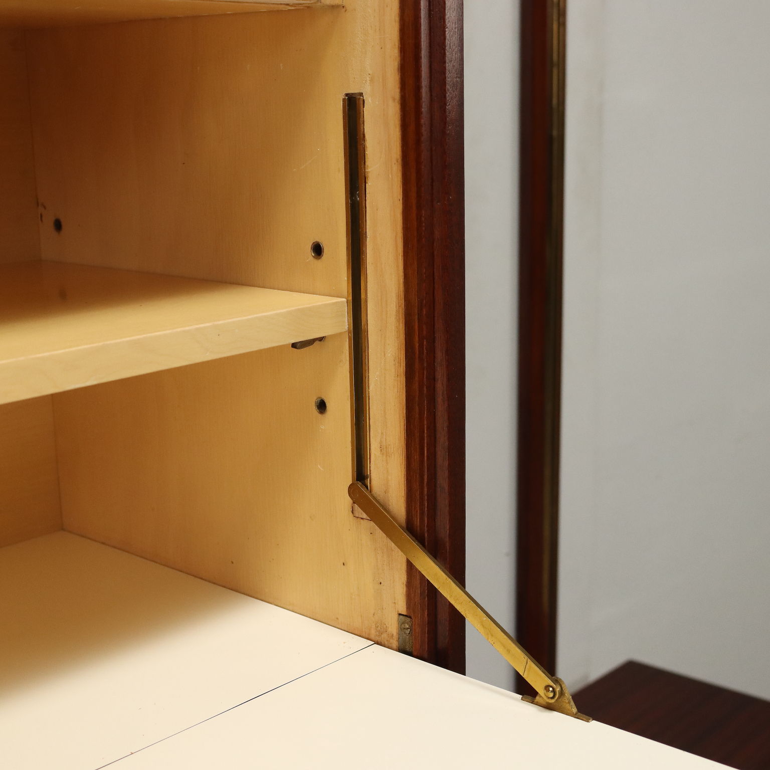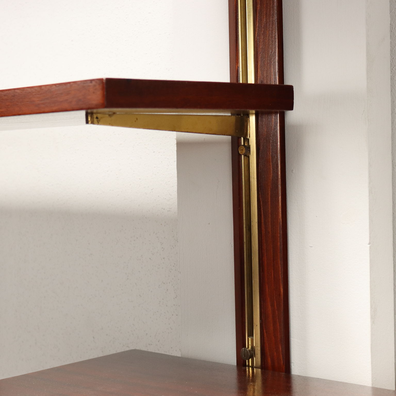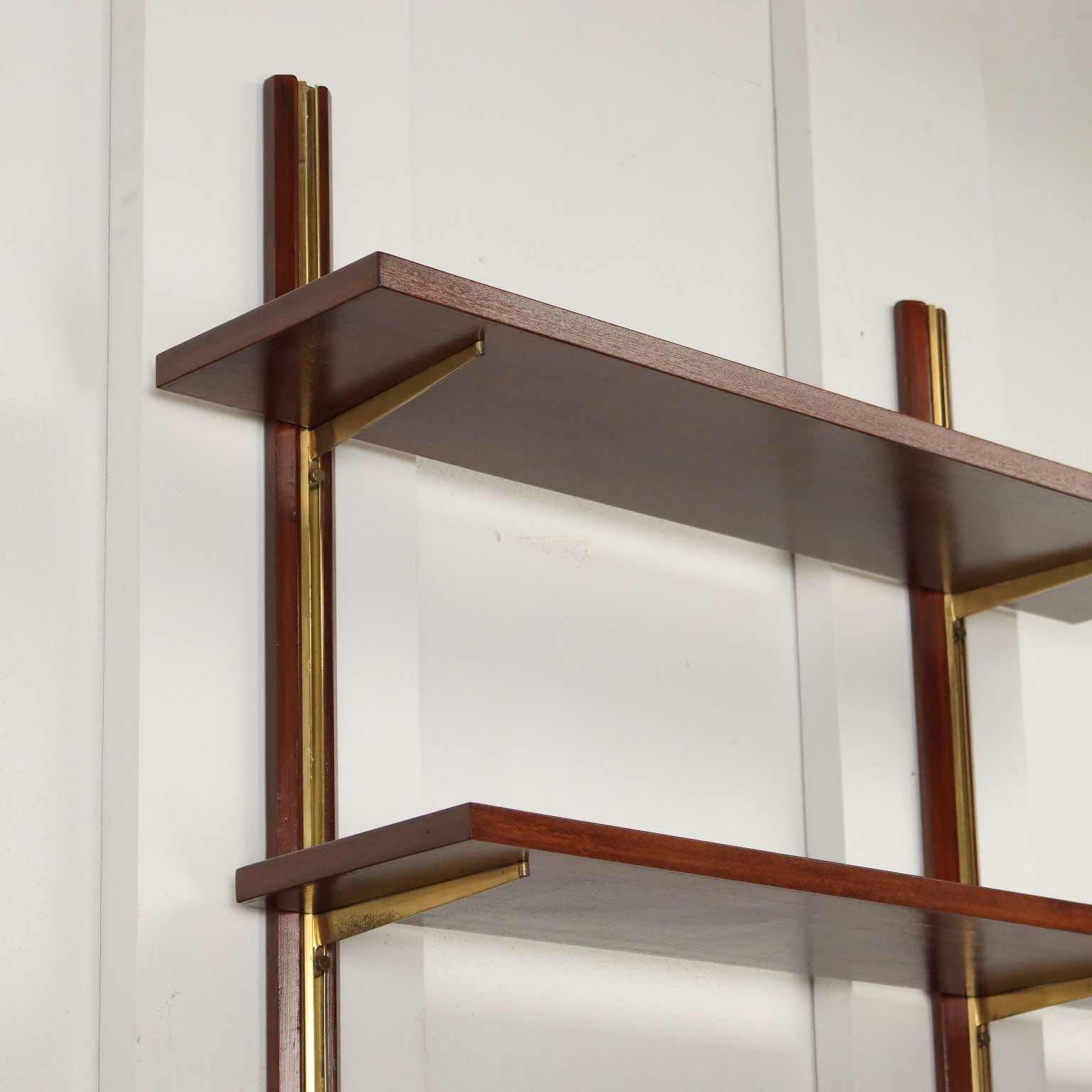 Elegante libreria a parete (necessita di ancoraggio a muro) con ripiani a posizione regolabile, elementi contenitore con ribalta per vano bar e a battente, legno impiallacciato mogano, formica, guide e supporti in ottone. Restaurata.