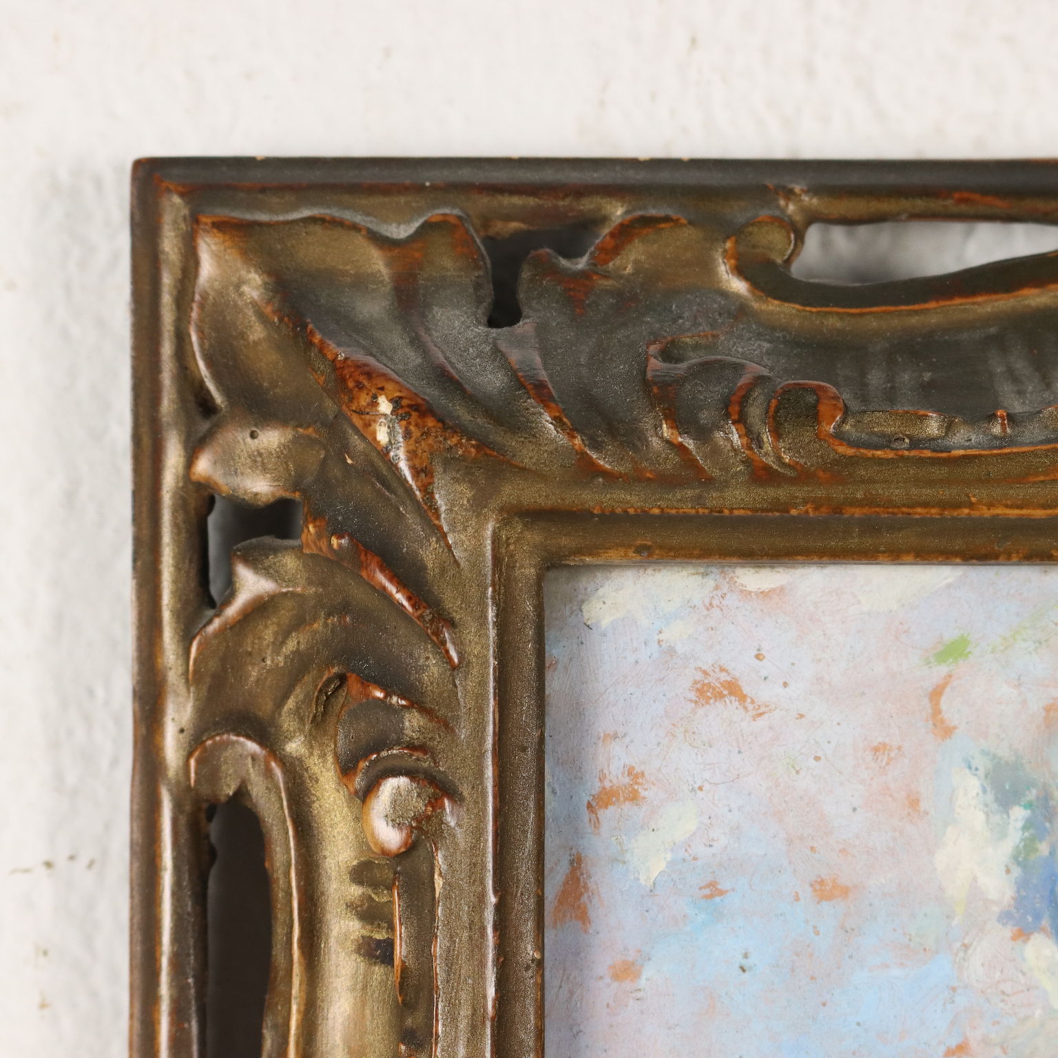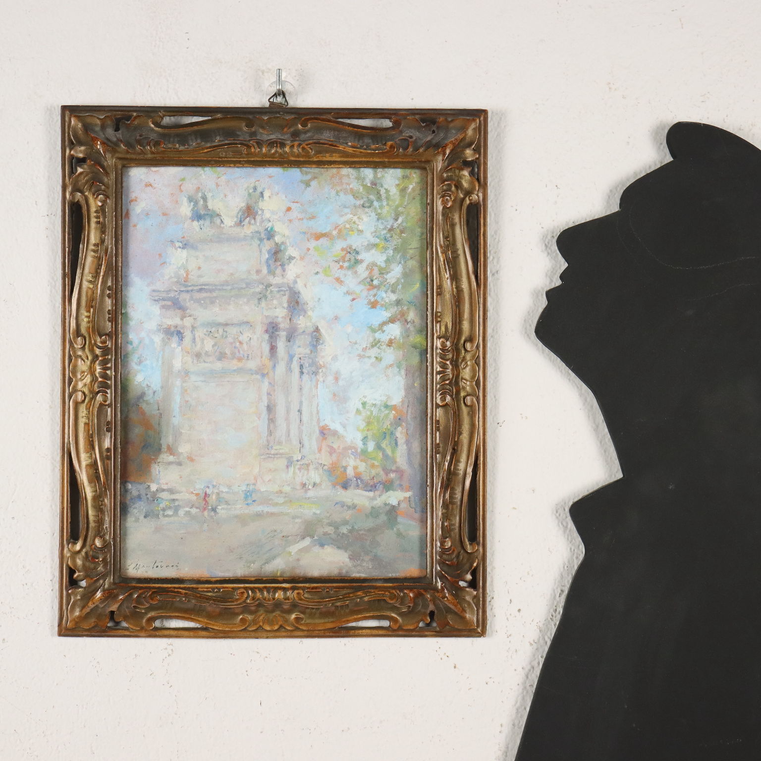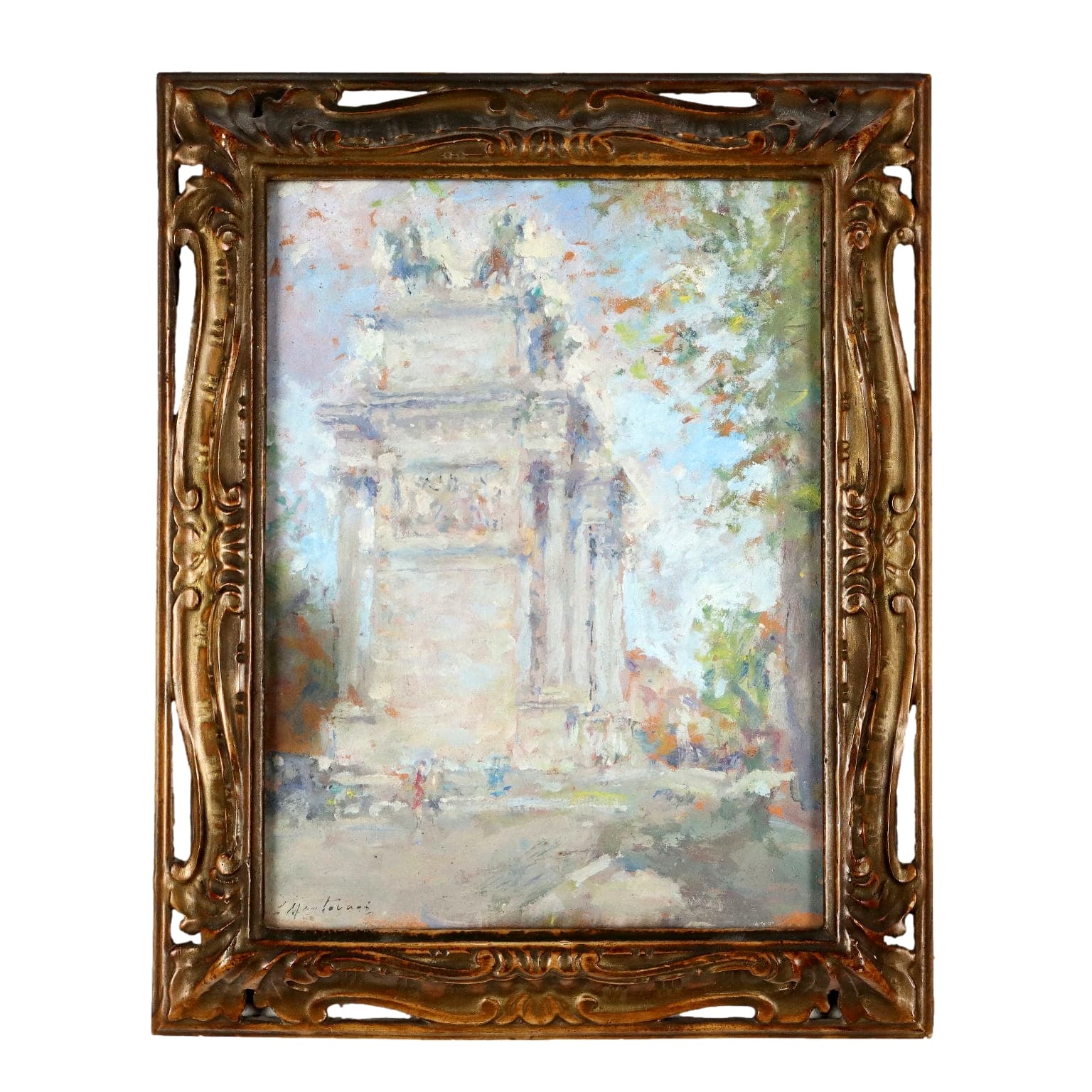 Olio su cartone. Firmato in basso a sinistra. Il quadretto propone una veduta dell' Arco della Pace di Milano, affacciato sui giardini del Parco del Sempione, realizzato in quei colori chiari e trasparenti che sono considerati un tratto caratteristico dell'artista. Lugi Mantovani, milanese di nascita e di formazione, si affermò nel panorama artistico e divenne parte attiva nei cenacoli culturali milanesi della città, a cui dedicò la sua produzione, costituita prevalentemente da paesaggi e scorci cittadini. In cornice coeva.