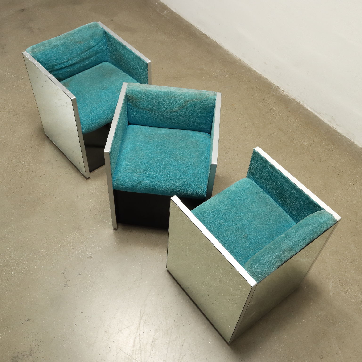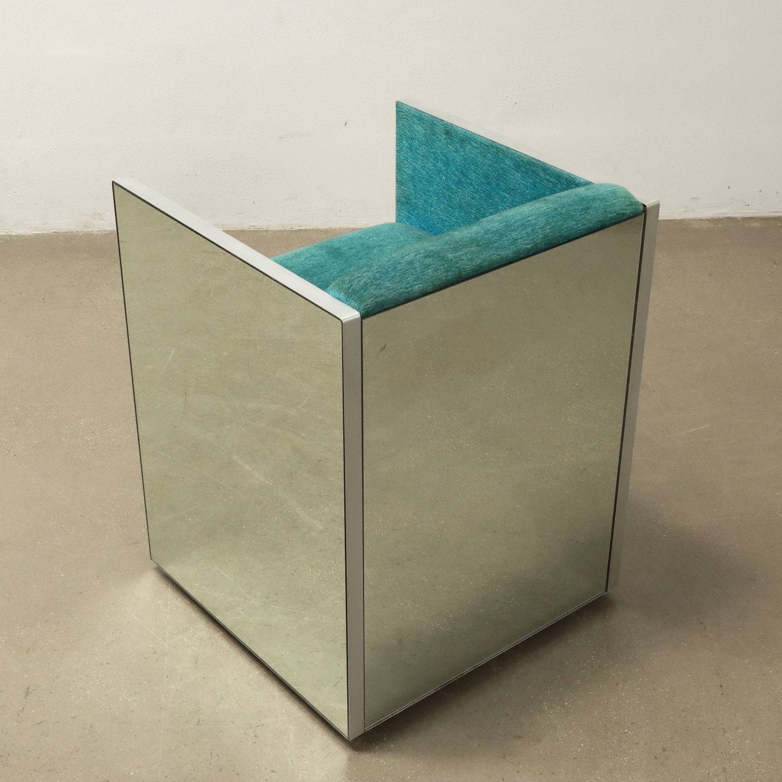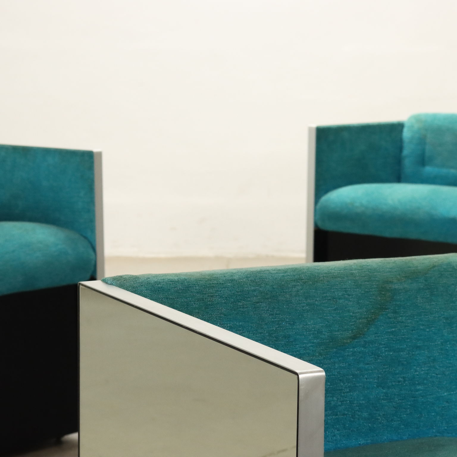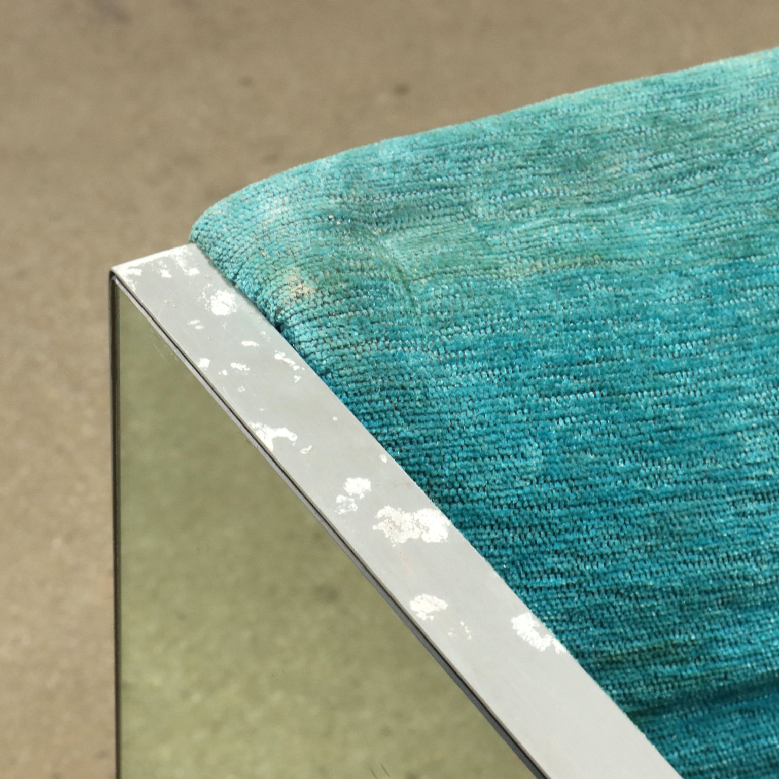 Gruppo di sedute, struttura in legno ricoperto in vetro specchiato, profili in alluminio, imbottitura in espanso, rivestimento in tessuto. Presenta macchie sul tessuto.