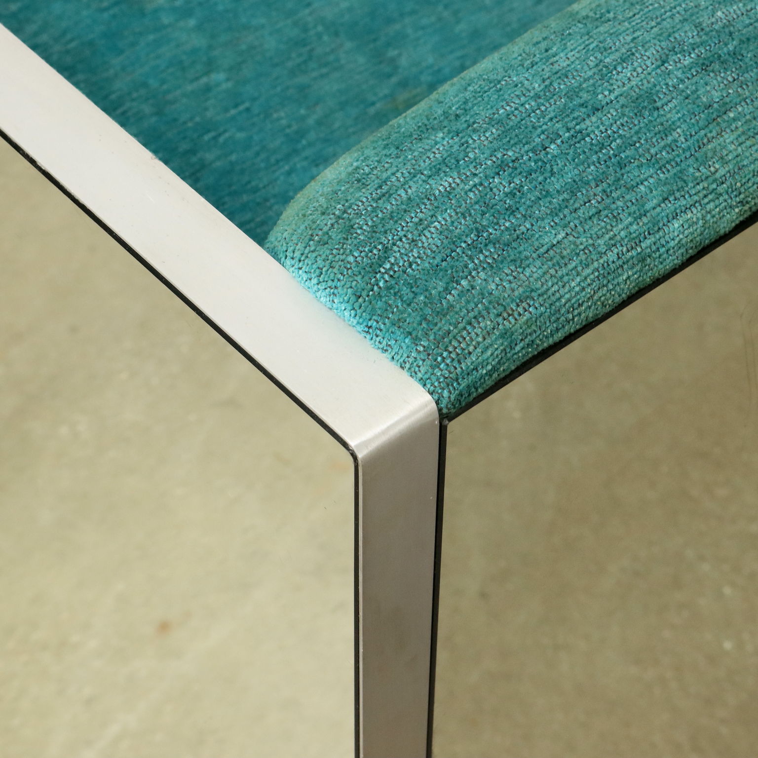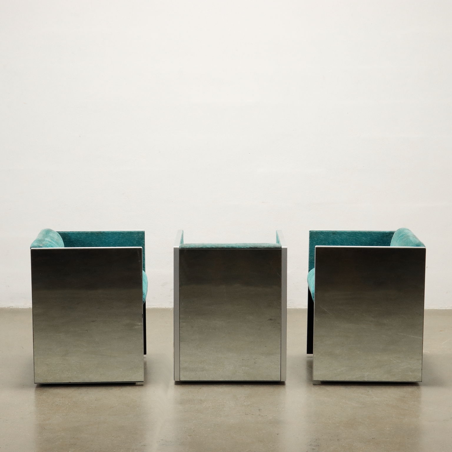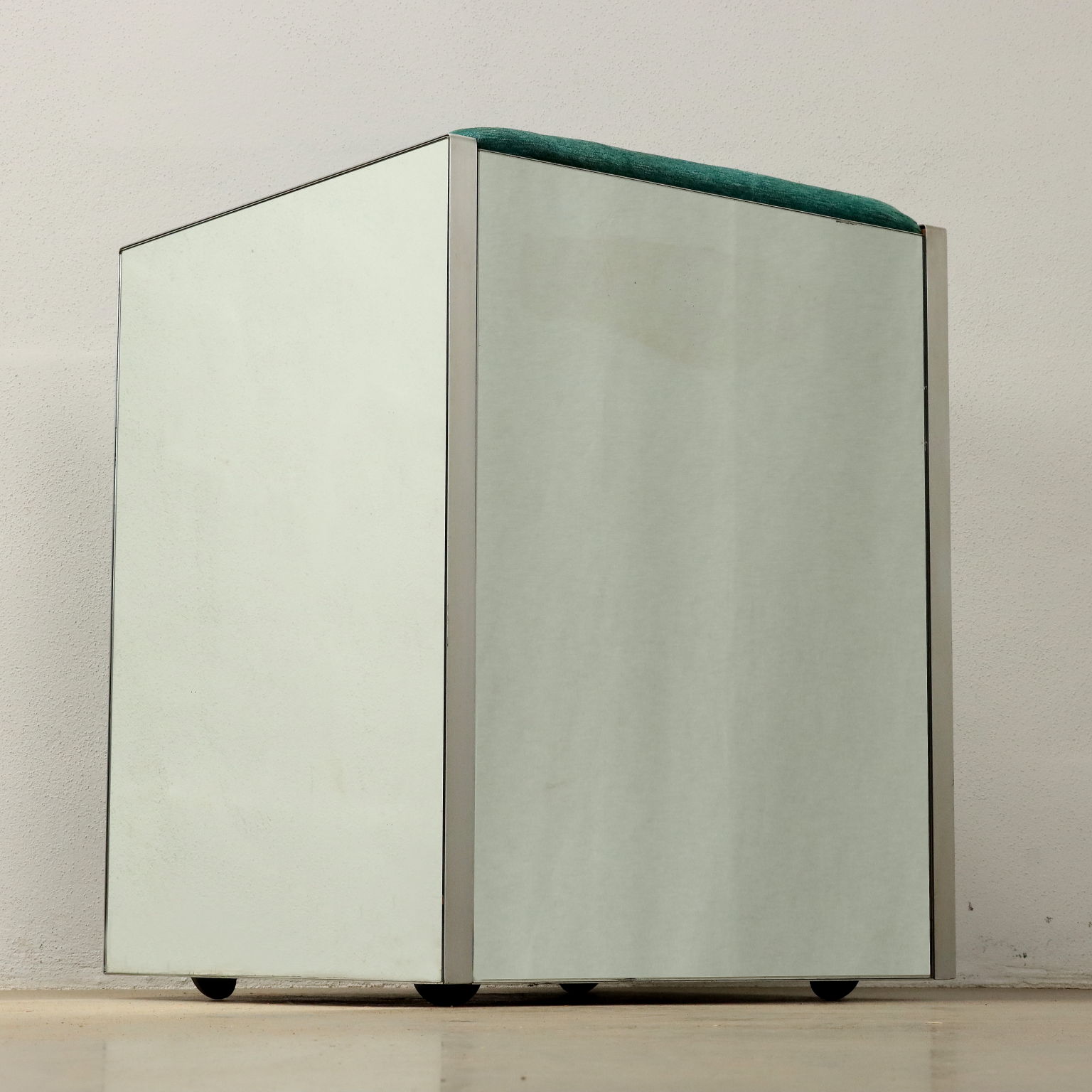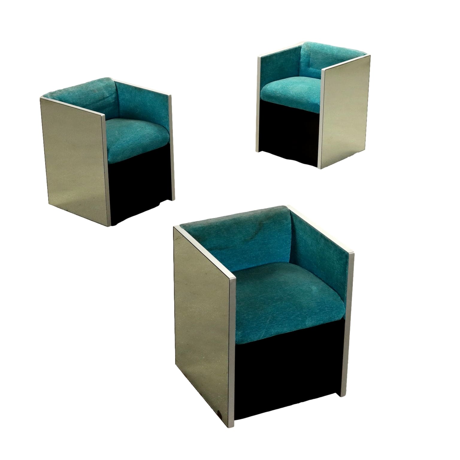 Gruppo di sedute, struttura in legno ricoperto in vetro specchiato, profili in alluminio, imbottitura in espanso, rivestimento in tessuto. Presenta macchie sul tessuto.