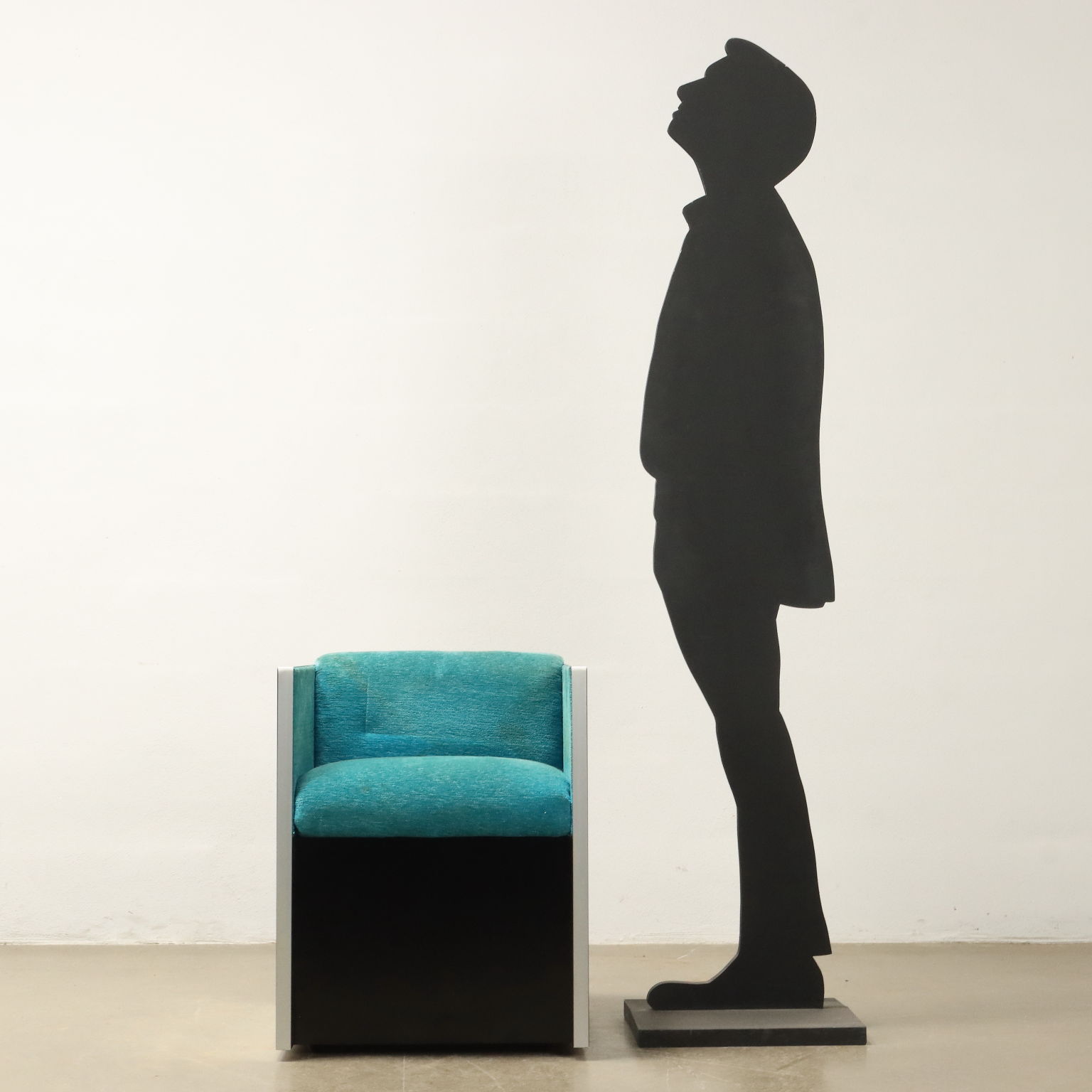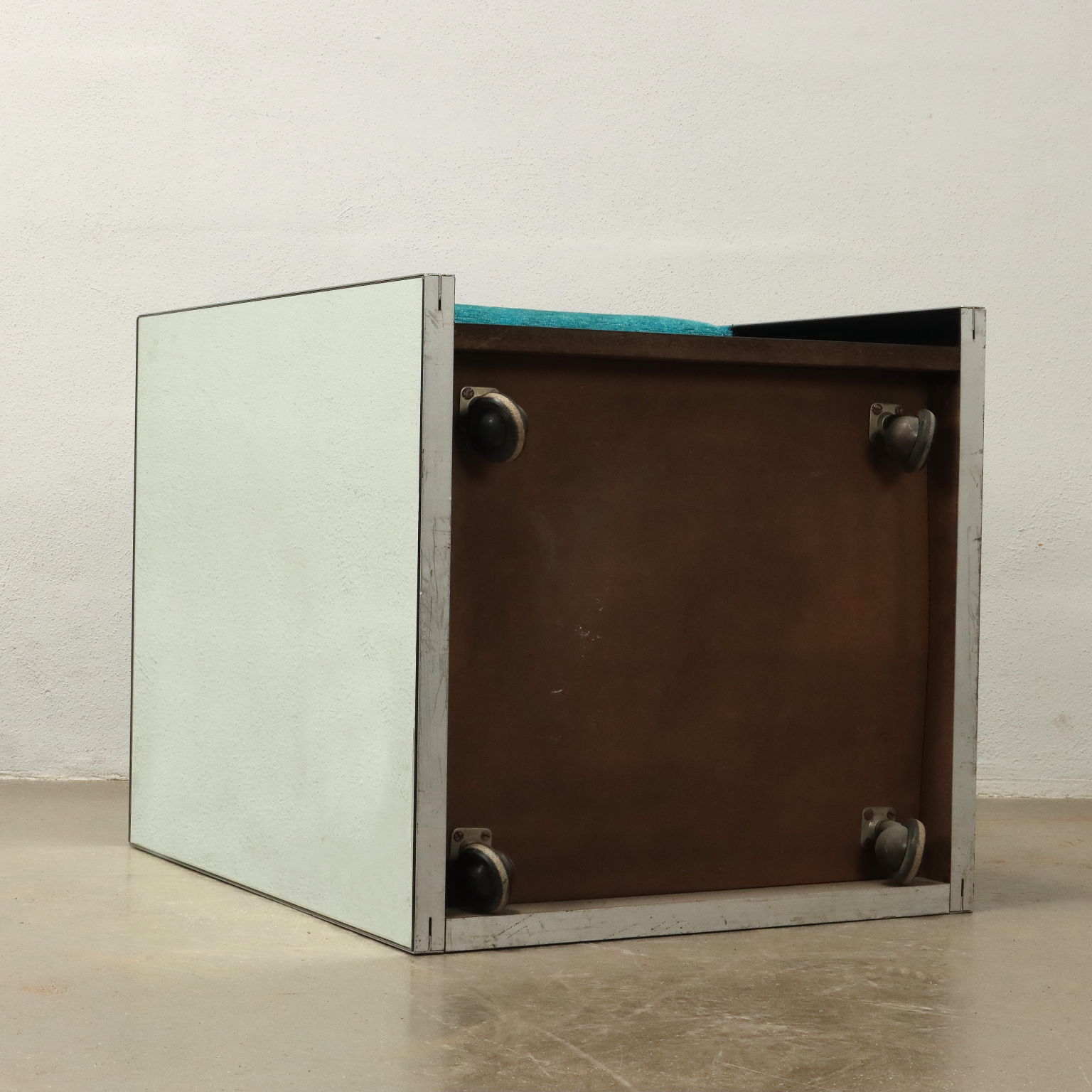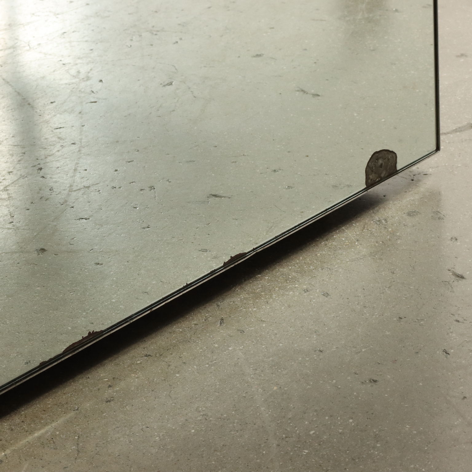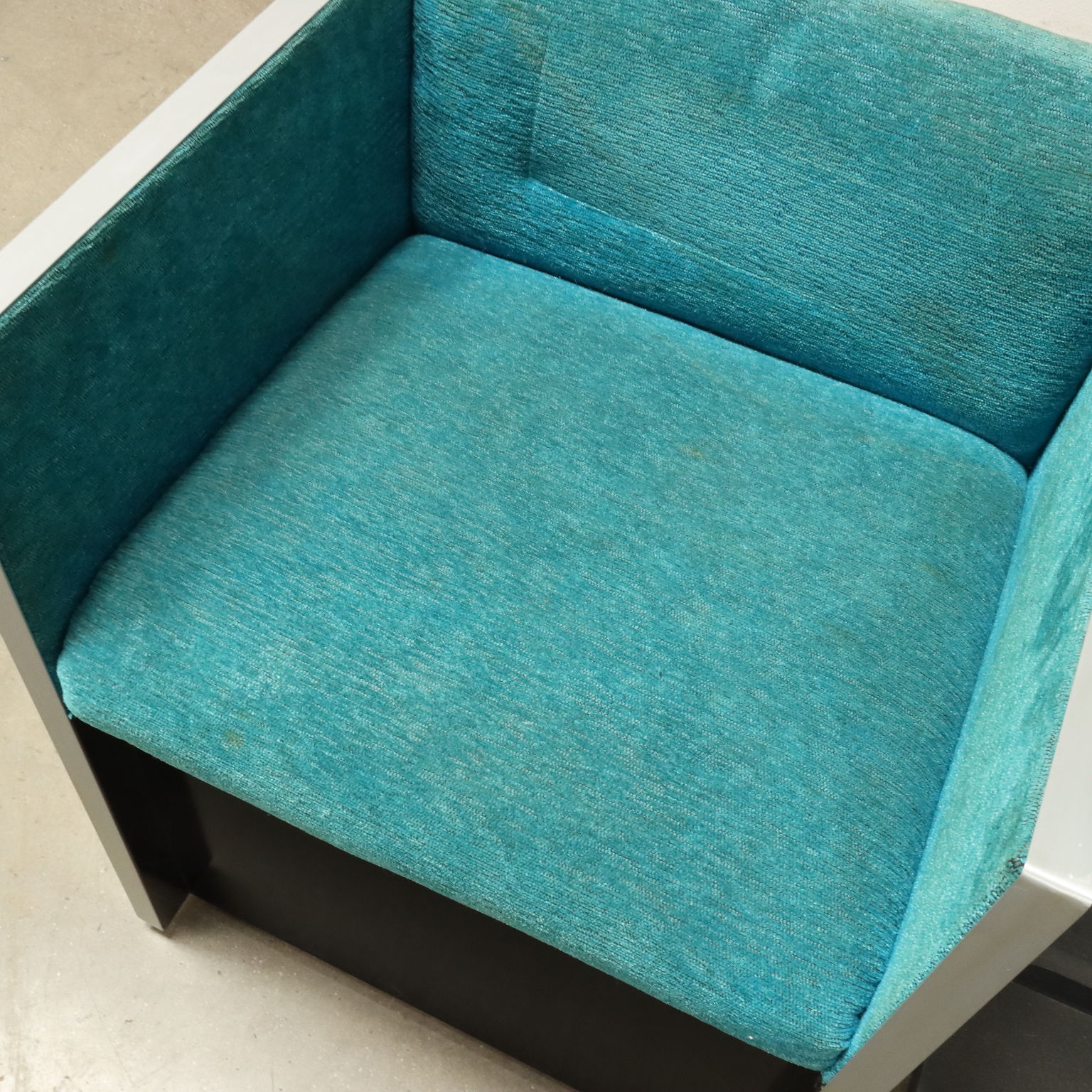 Gruppo di sedute, struttura in legno ricoperto in vetro specchiato, profili in alluminio, imbottitura in espanso, rivestimento in tessuto. Presenta macchie sul tessuto.