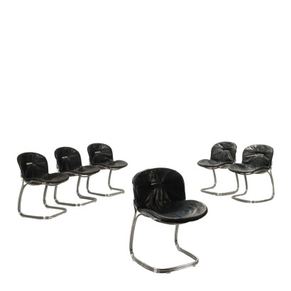 Gruppo di 6 sedie, tubolare in metallo cromato, cuscino imbottito in espanso con rivestimento in pelle. Restaurate.