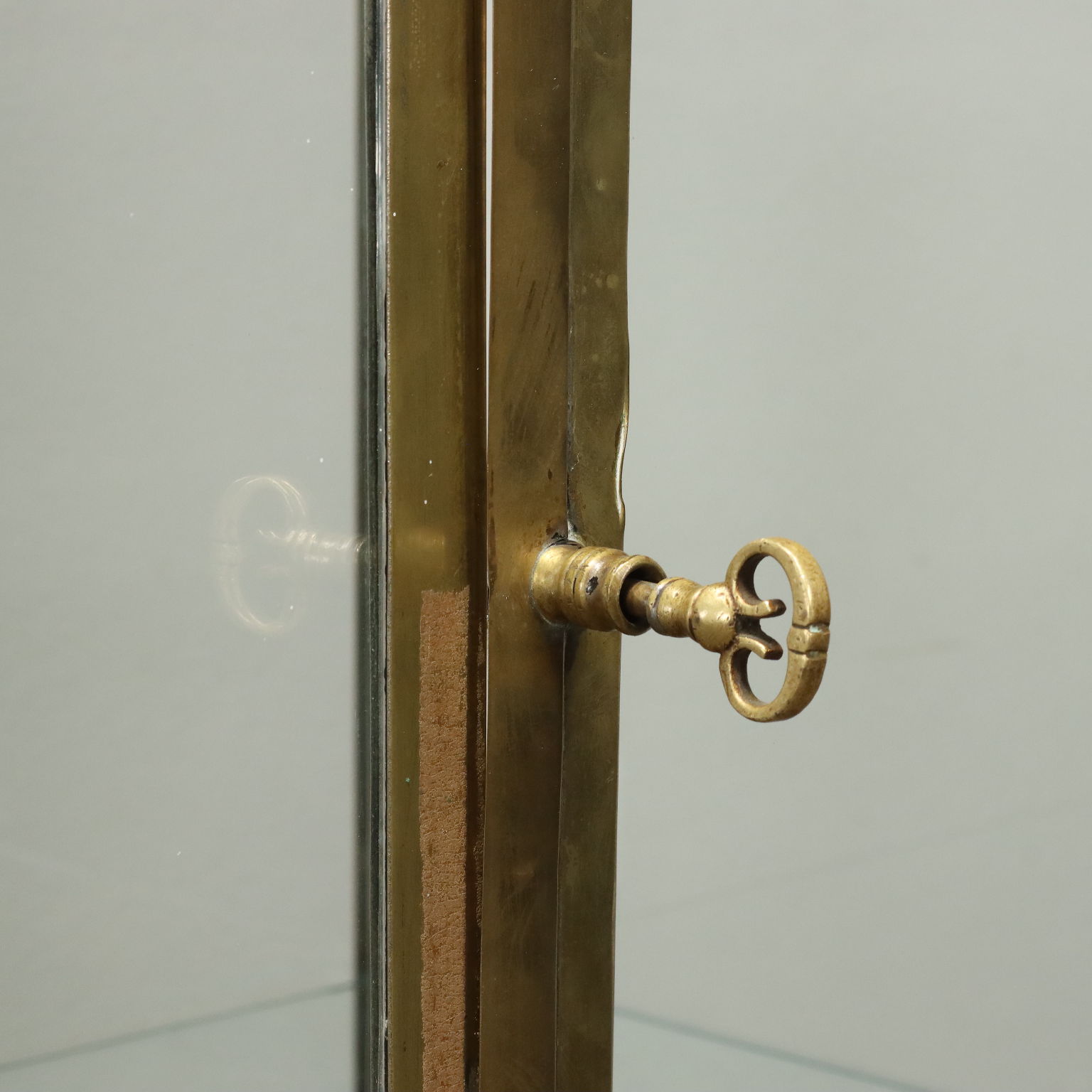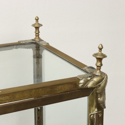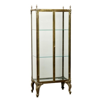 Teca Espositore Liberty con telaio in ottone, Inghilterra inizio XX secolo. Dotata di vetri su tutti i lati, così come in vetro sono i due piani d'appoggio interni amovibili. Struttura ornata da elementi in bronzo dorato, quali applicazioni fogliacee e pinnacoli posti sulla sommità, e i quattro piedi mossi. Rastrelliera interna per la regolazione dei piani.
