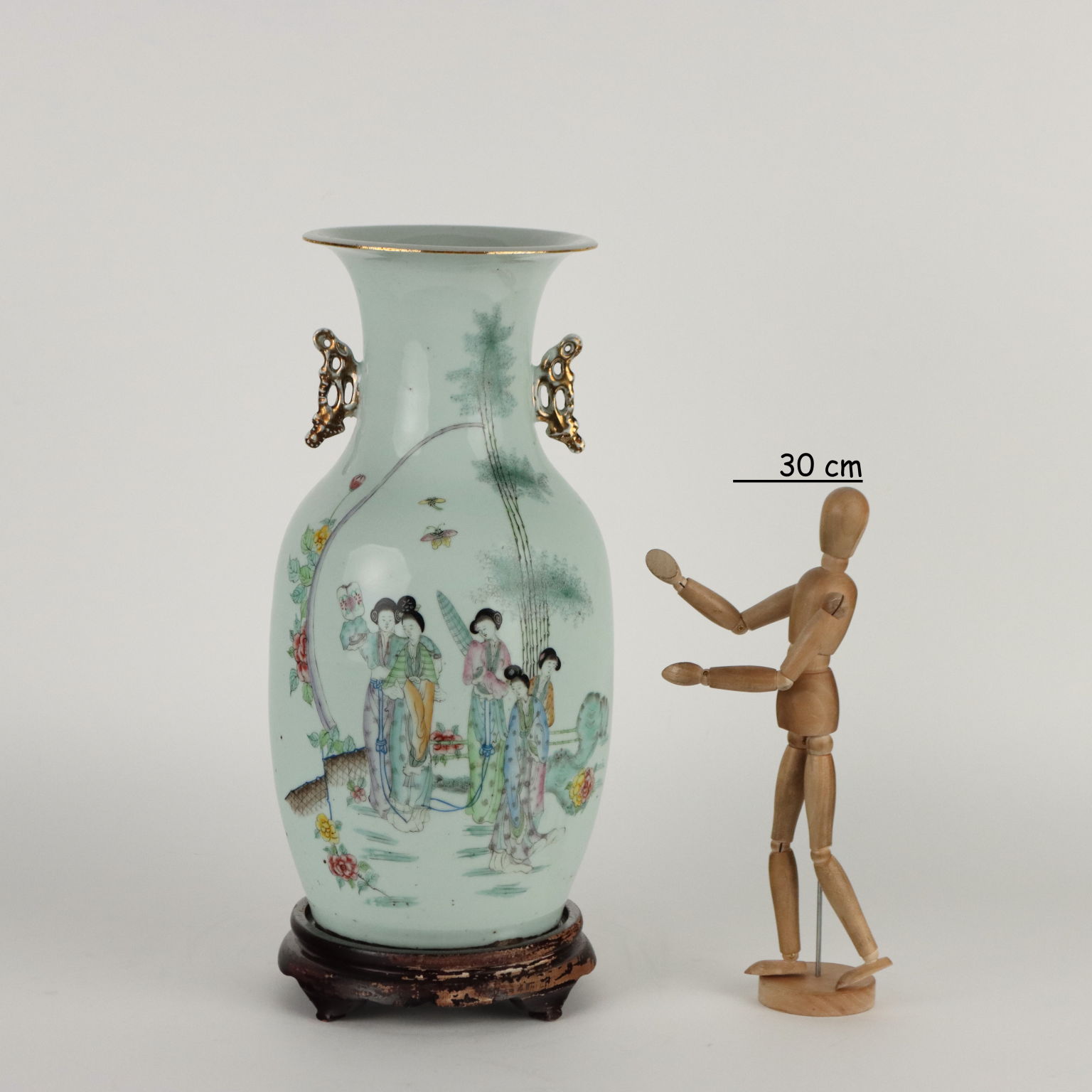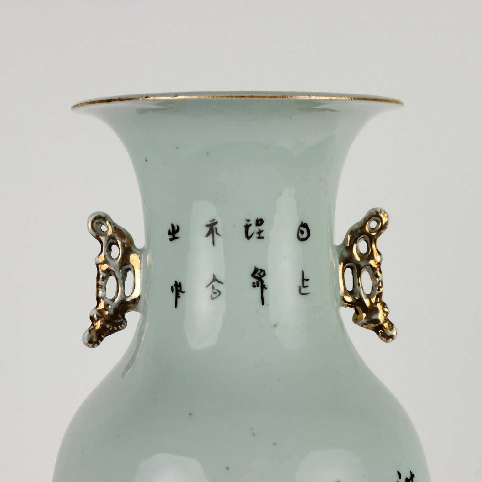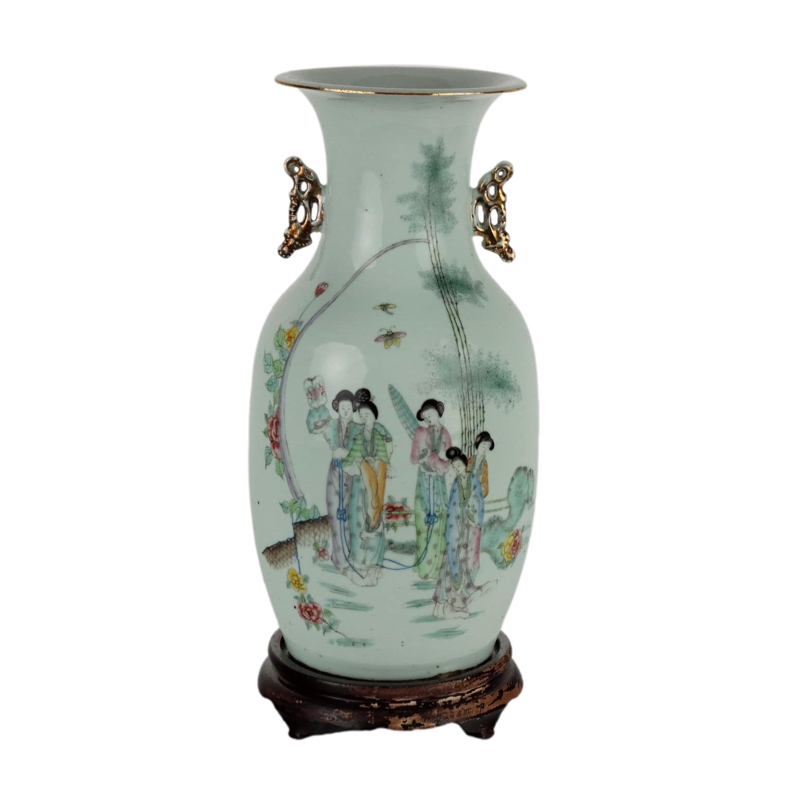 Vaso a balaustro in porcellana dipinta a smalti Qianjiang con rappresentazione di cortigiane in un giardino fiorito. Anse laterali lumeggiate in oro. La parte retrostante con un lungo poema scritto in caratteri cinesi.